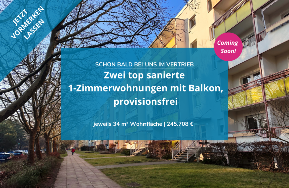 Tragen Sie sich bei "Coming Soon" Objekten in unsere VIP-Interessentenliste ein. Dadurch werden Sie von uns bei Vertriebsstart benachrichtigt und können bevorzugt einen Besichtigungstermin auf unserer Website buchen - noch bevor das Objekt auf den Portalen erscheint.