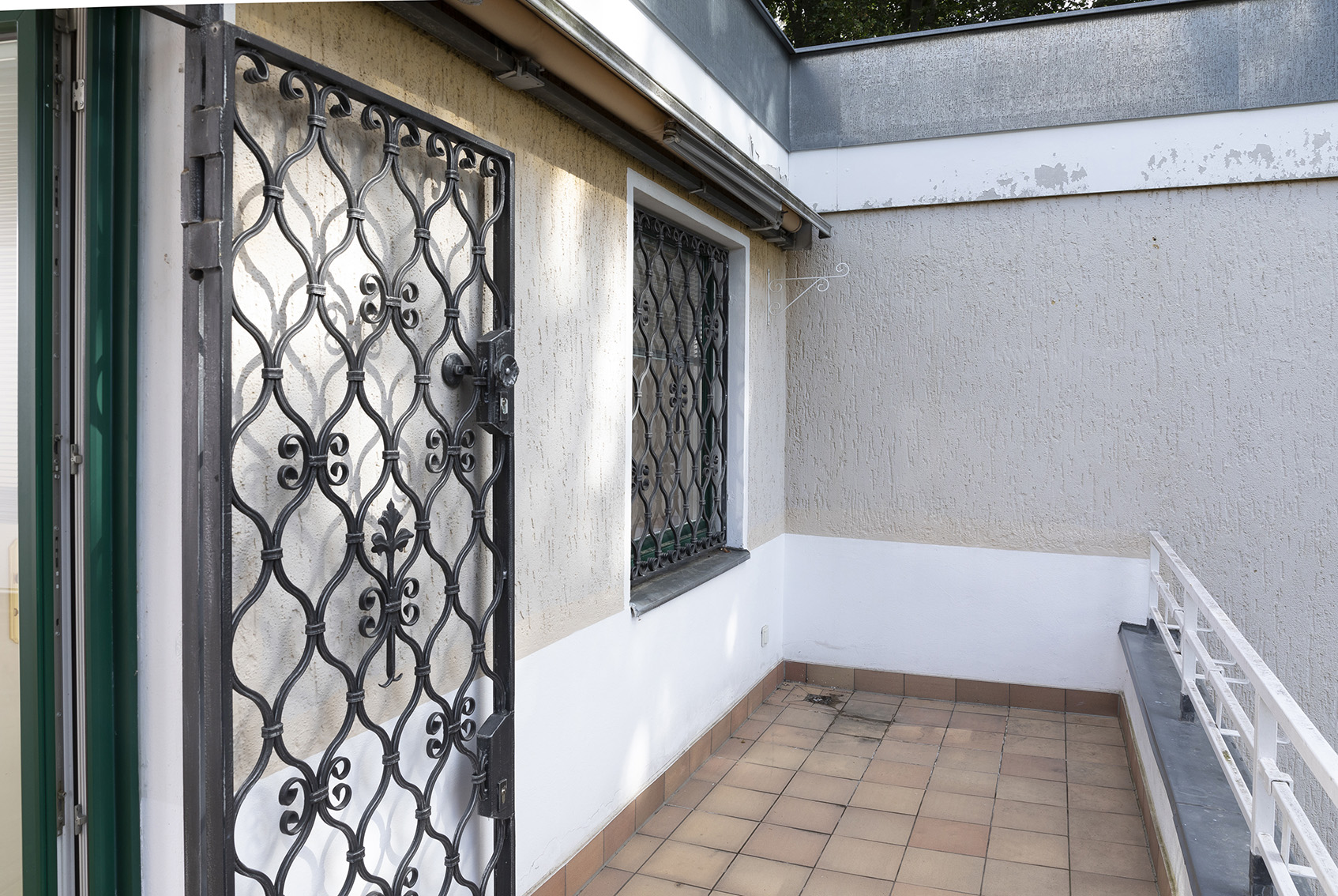 - Schmiedeeiserne Gitter an Balkontür und Küchenfenster.