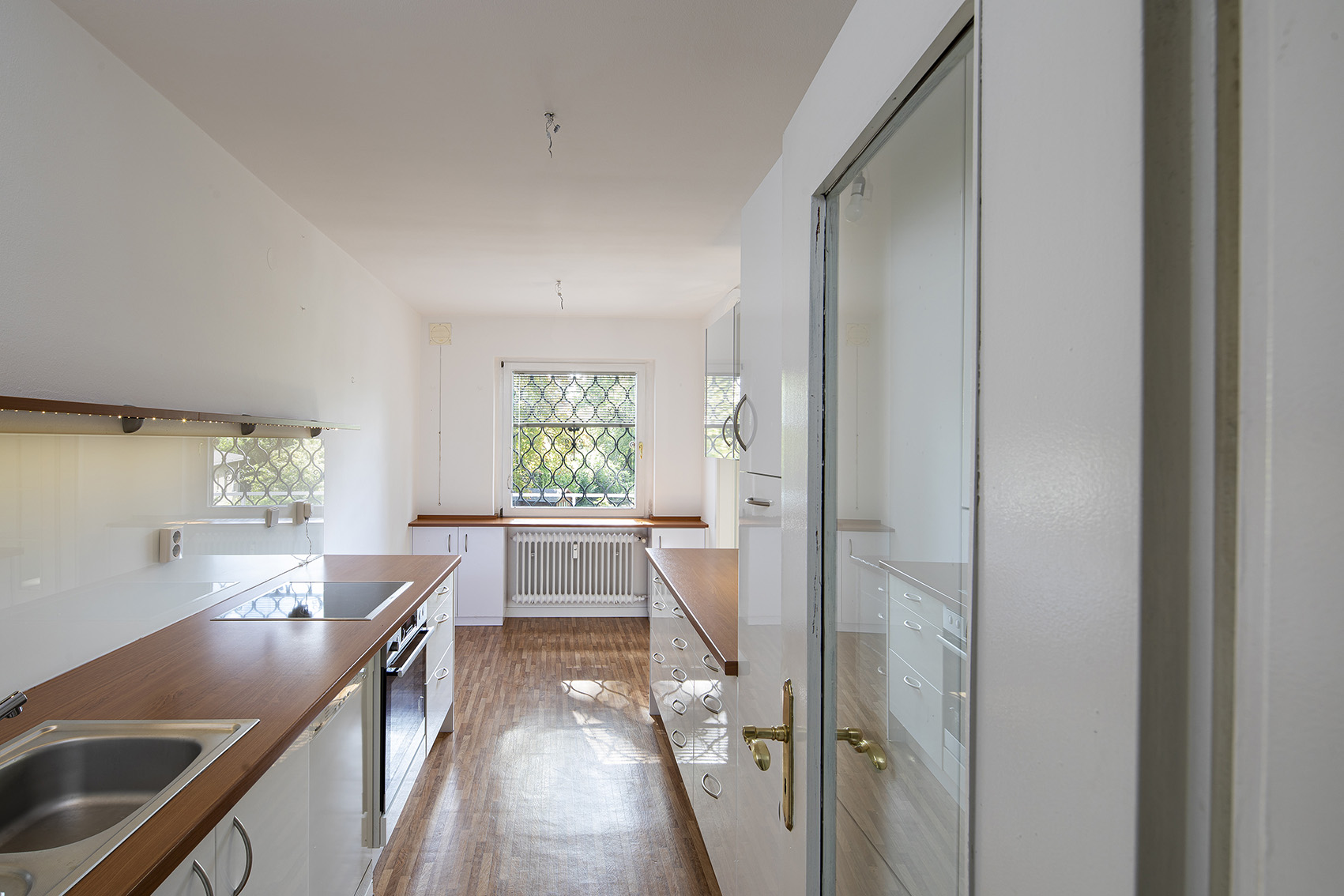 Schon beim Betreten des Hauses macht sich im Treppenaufgang eine Großzügigkeit bemerkbar, die sich in den Räumen der Wohnung fortsetzt: Das sehr große Wohn-/Esszimmer, mit seinen gut 31 m2, liegt nach Süd-Westen und ganztägig durchflutet viel Licht den Raum. Von dort betritt man den großen gefliesten Balkon und hat einen weiten Blick in die wundervoll gepflegten Nachbargrundstücke. Im Sommer sorgt eine großflächige elektrische Markise für angenehm kühlenden Schatten. Auch kann man vom Wohnzimmer direkt, auf kurzem Weg, in die Küche gelangen. Eine Kassetten-Glastür mit halbrunden Abschluss öffnet hier atmosphärisch den Raum. Die moderne Einbauküche mit Markengeräten und Cerankochfeld bietet ausreichend Platz für einen Essplatz darin.