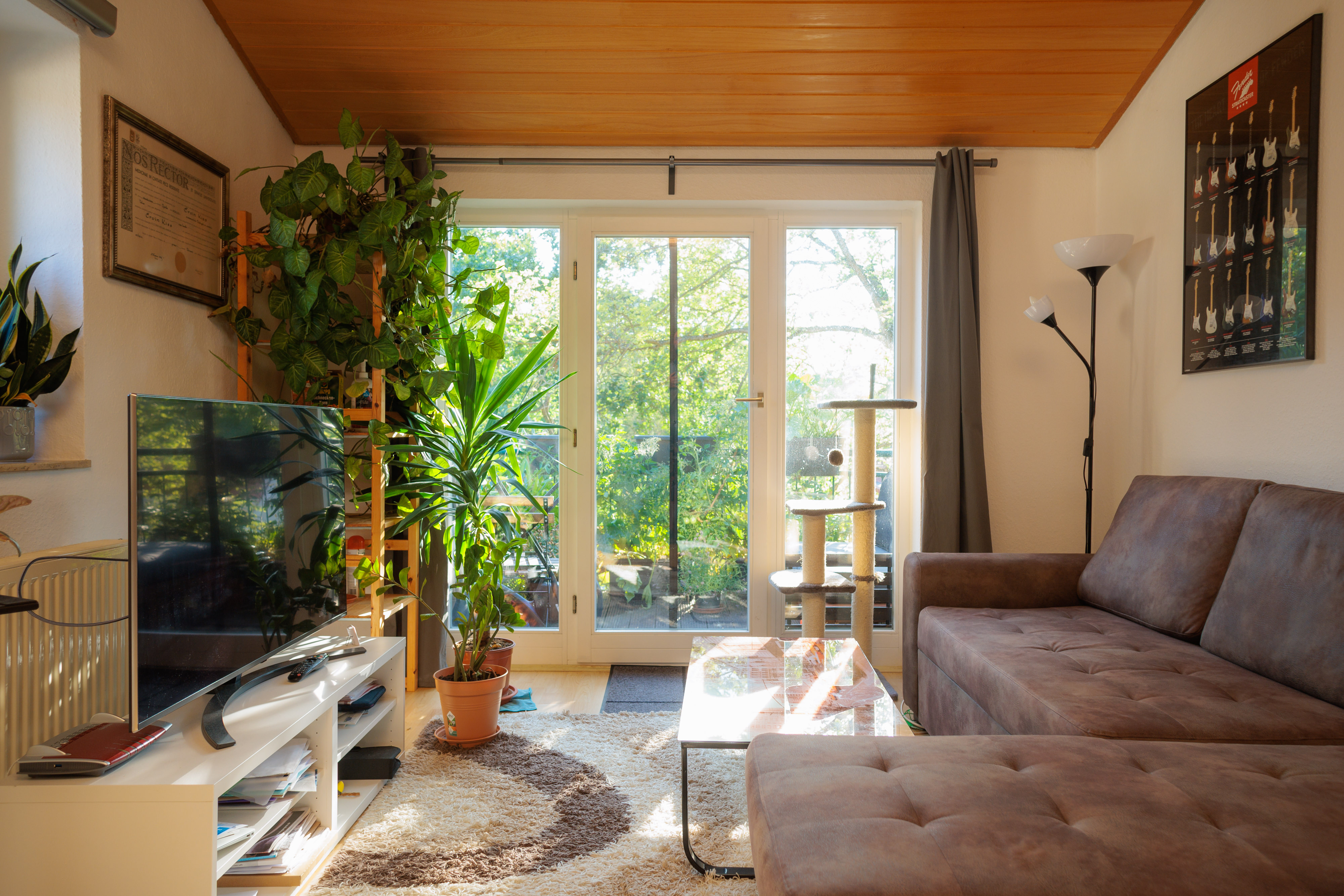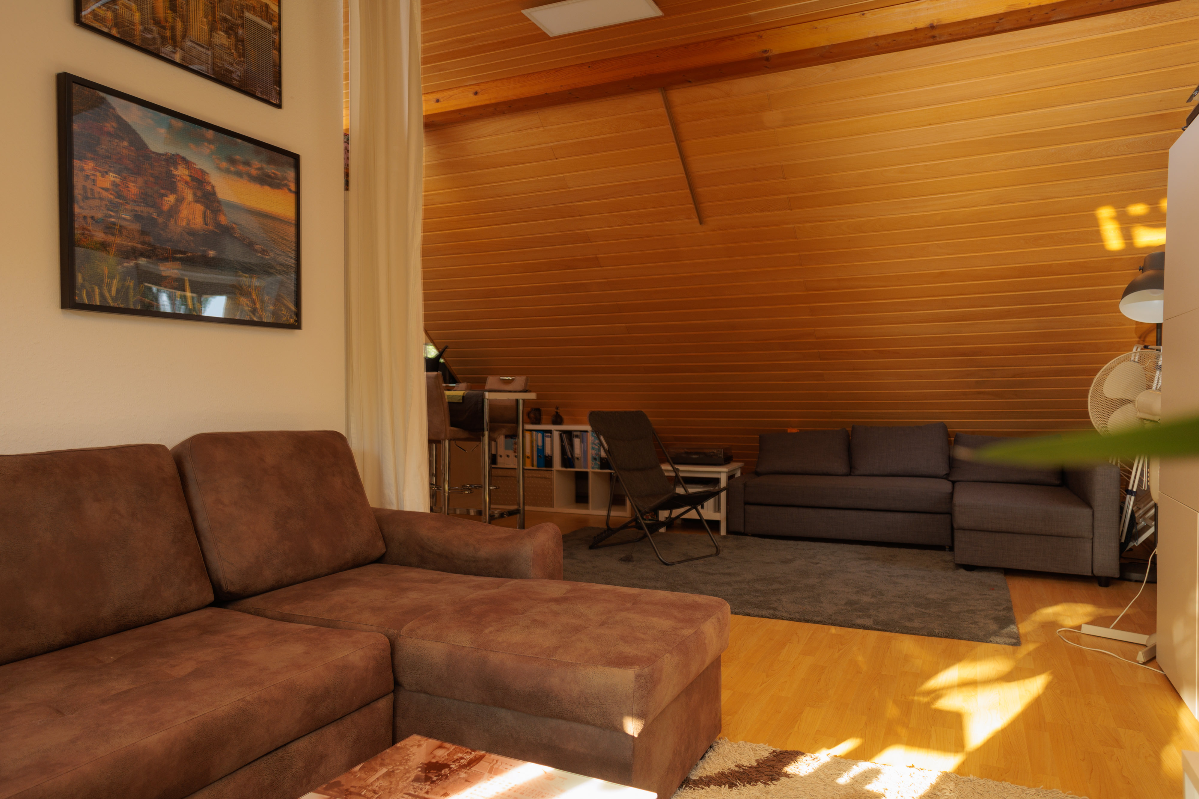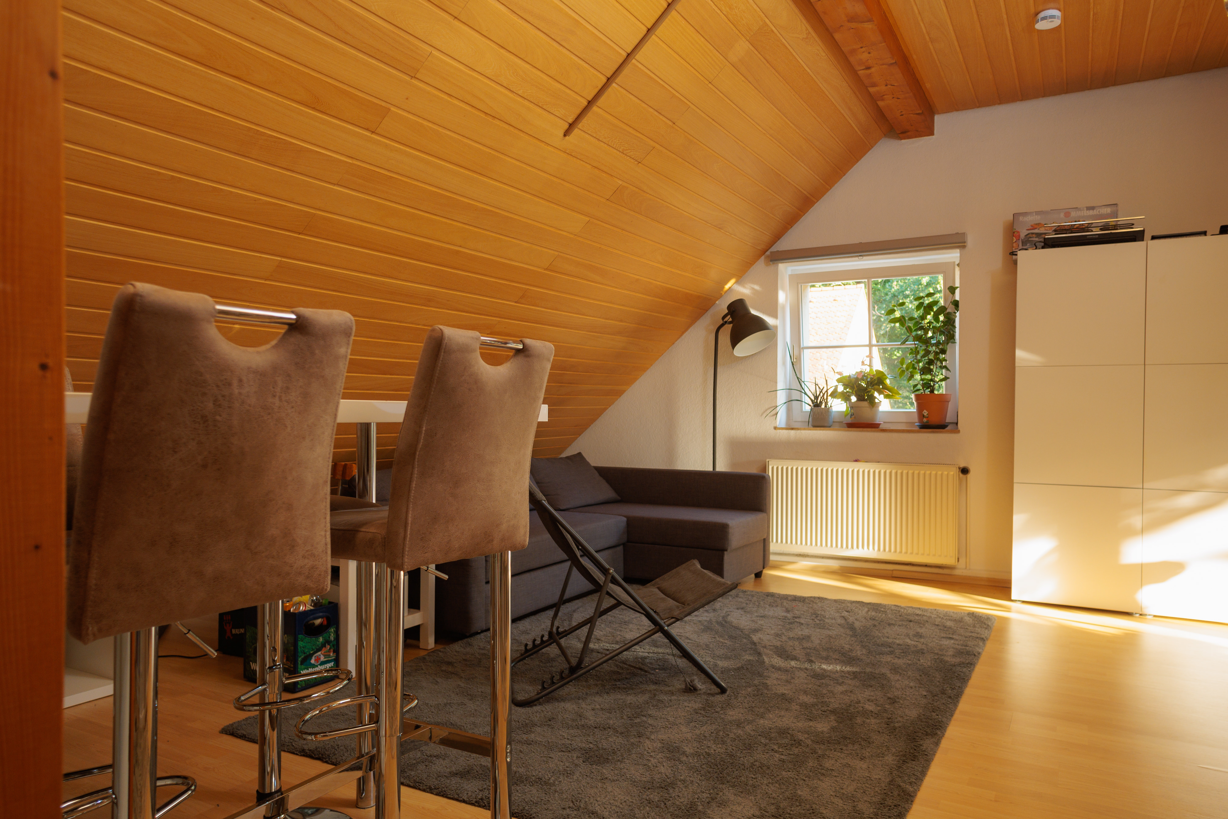 - Im Wohnzimmer Holzdecke aus Kiefernpaneel.