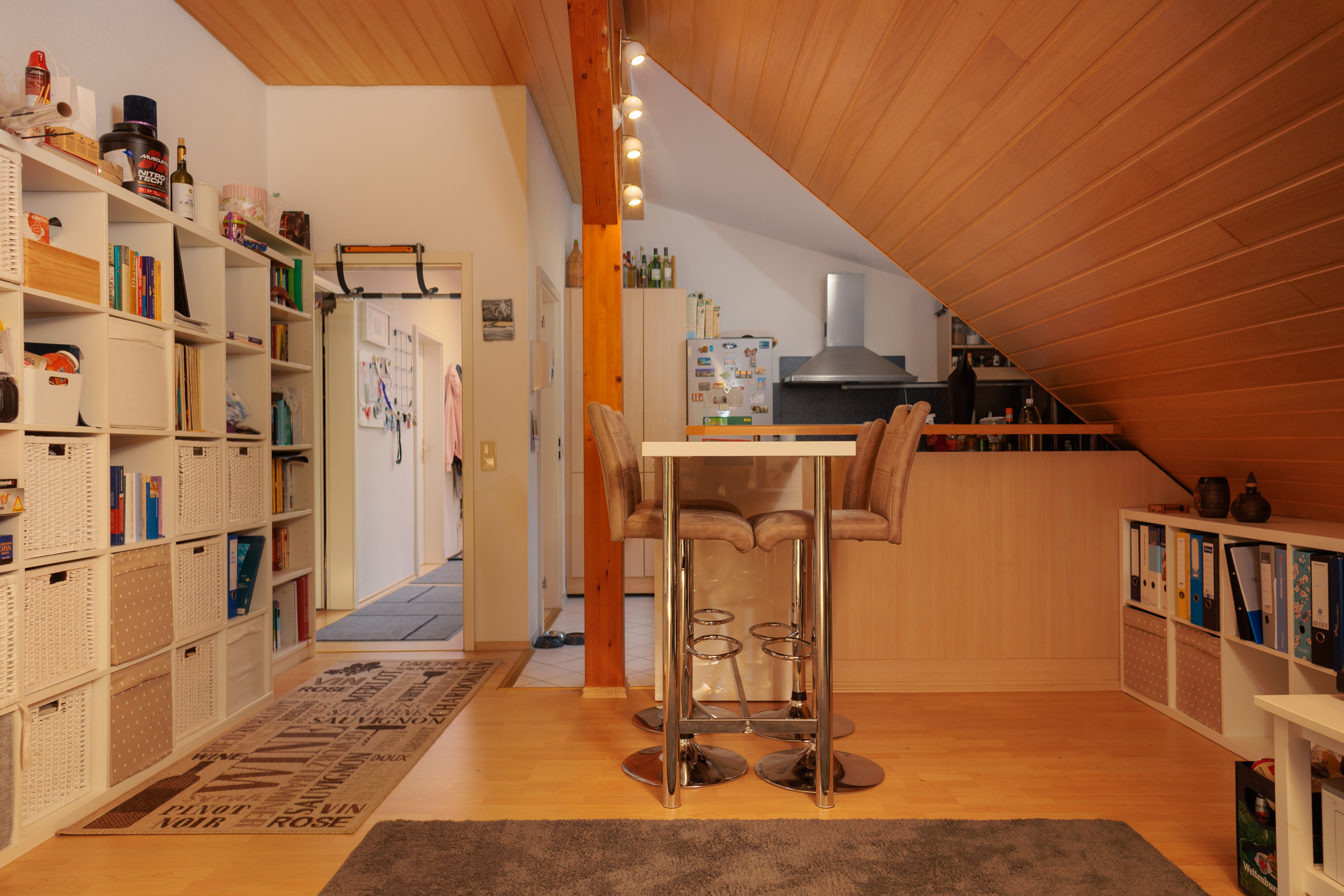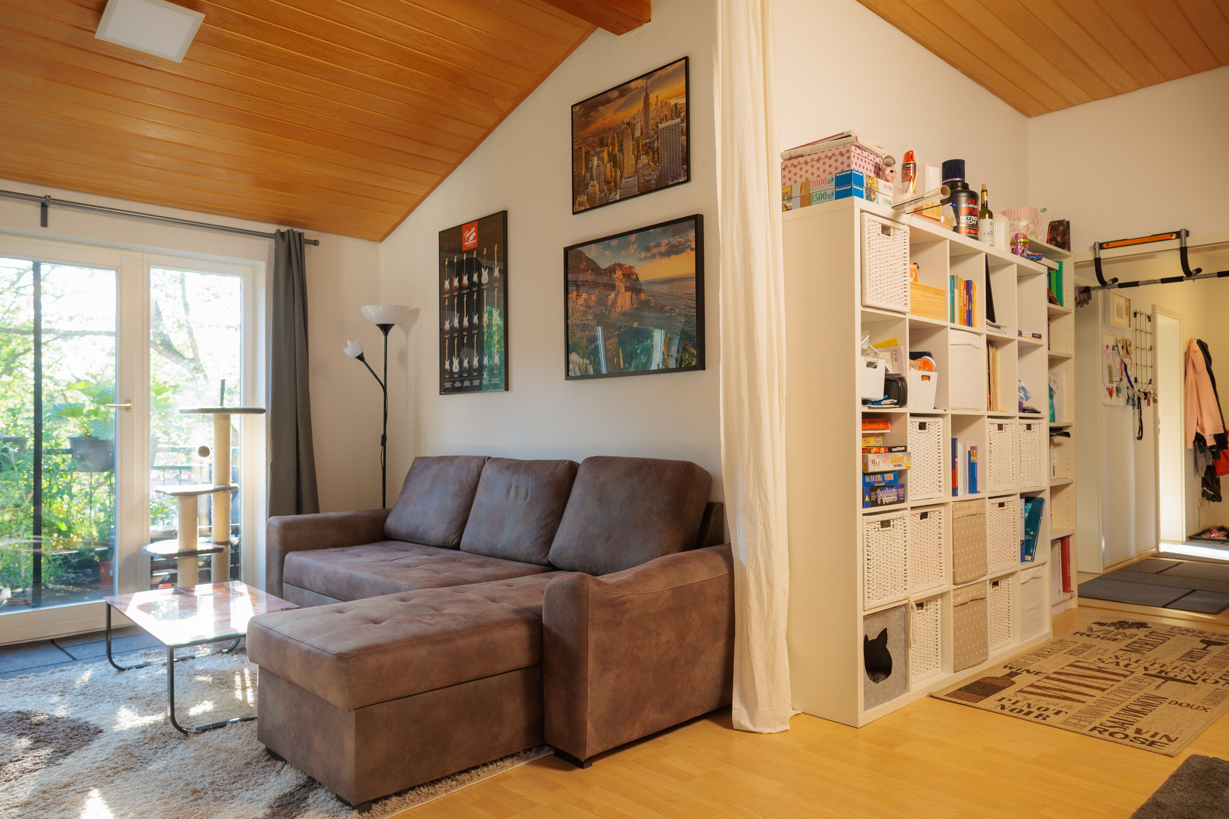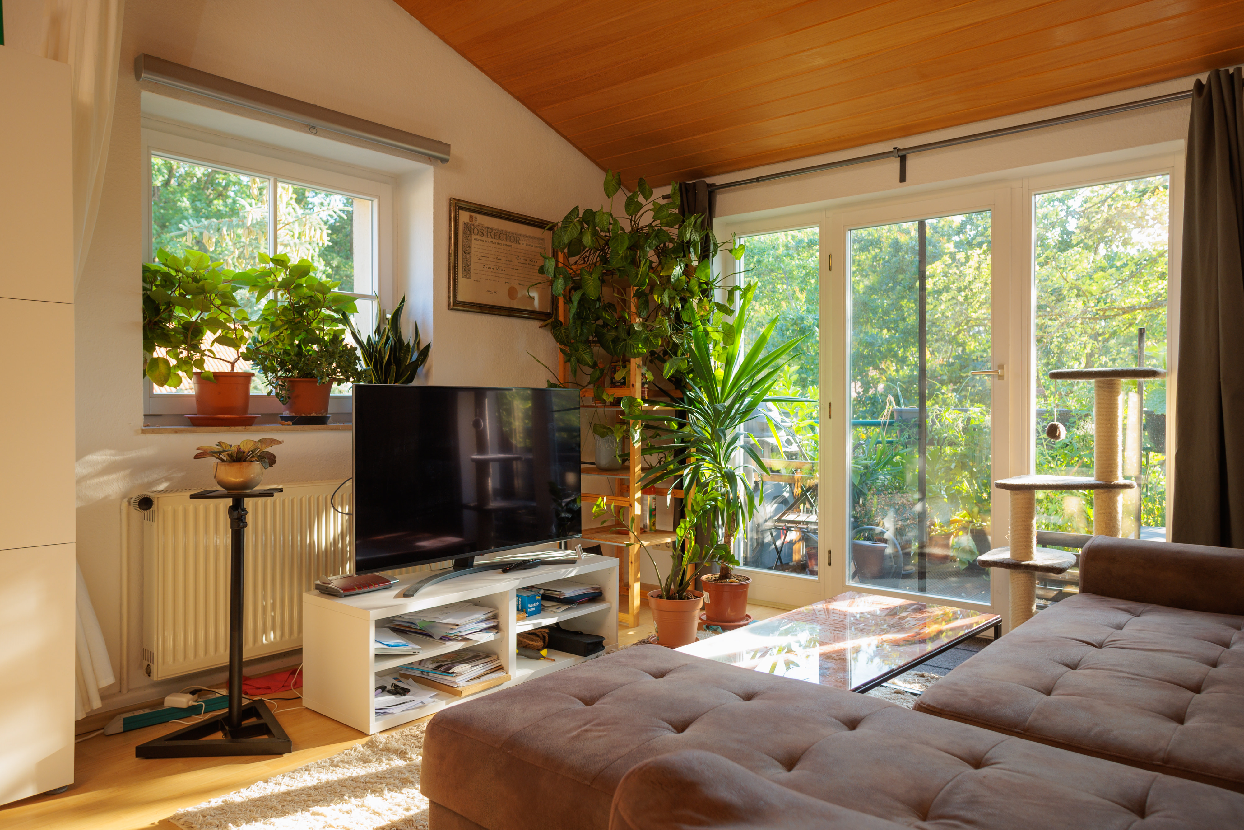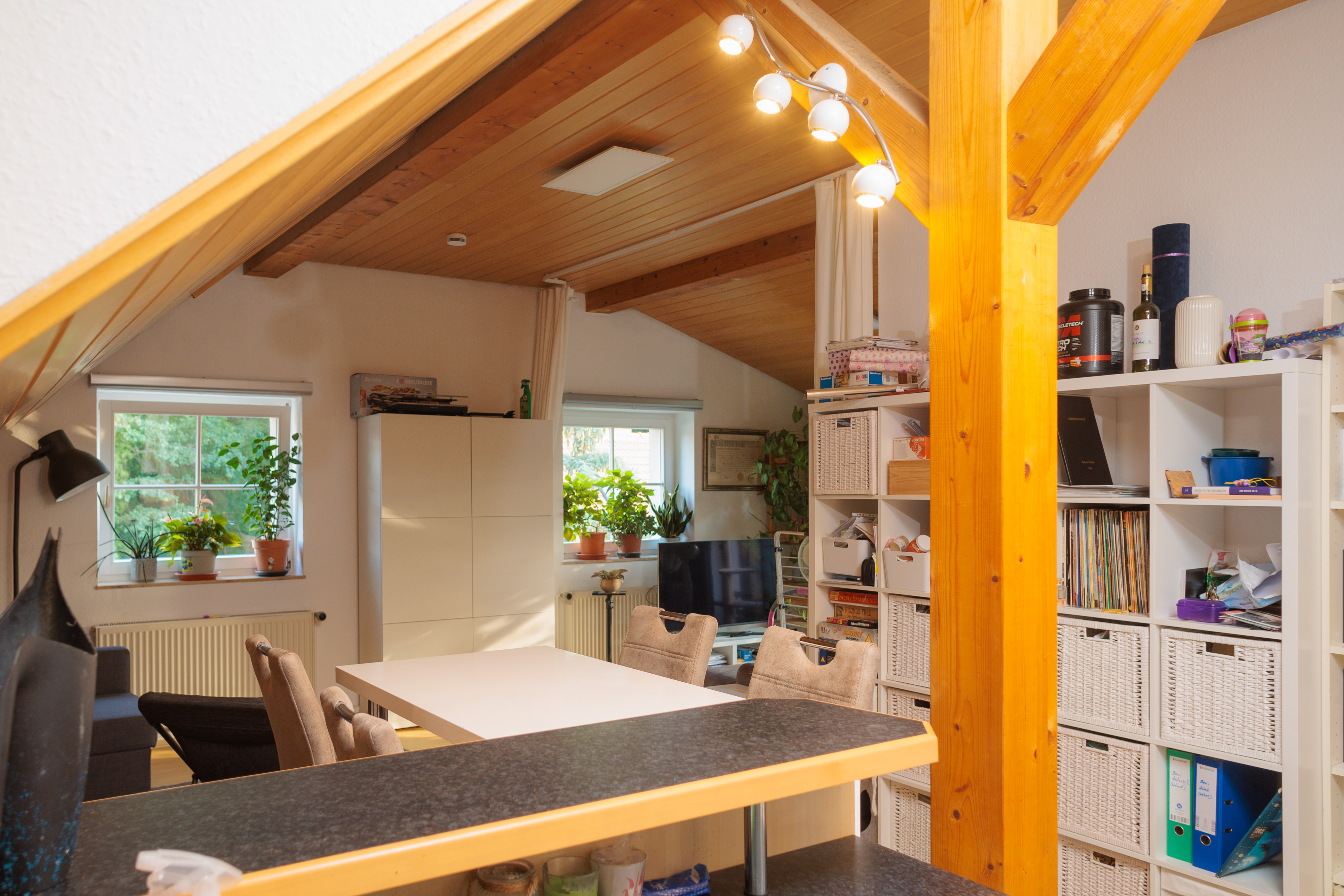 - Im Wohnzimmer Holzdecke aus Kiefernpaneel.
