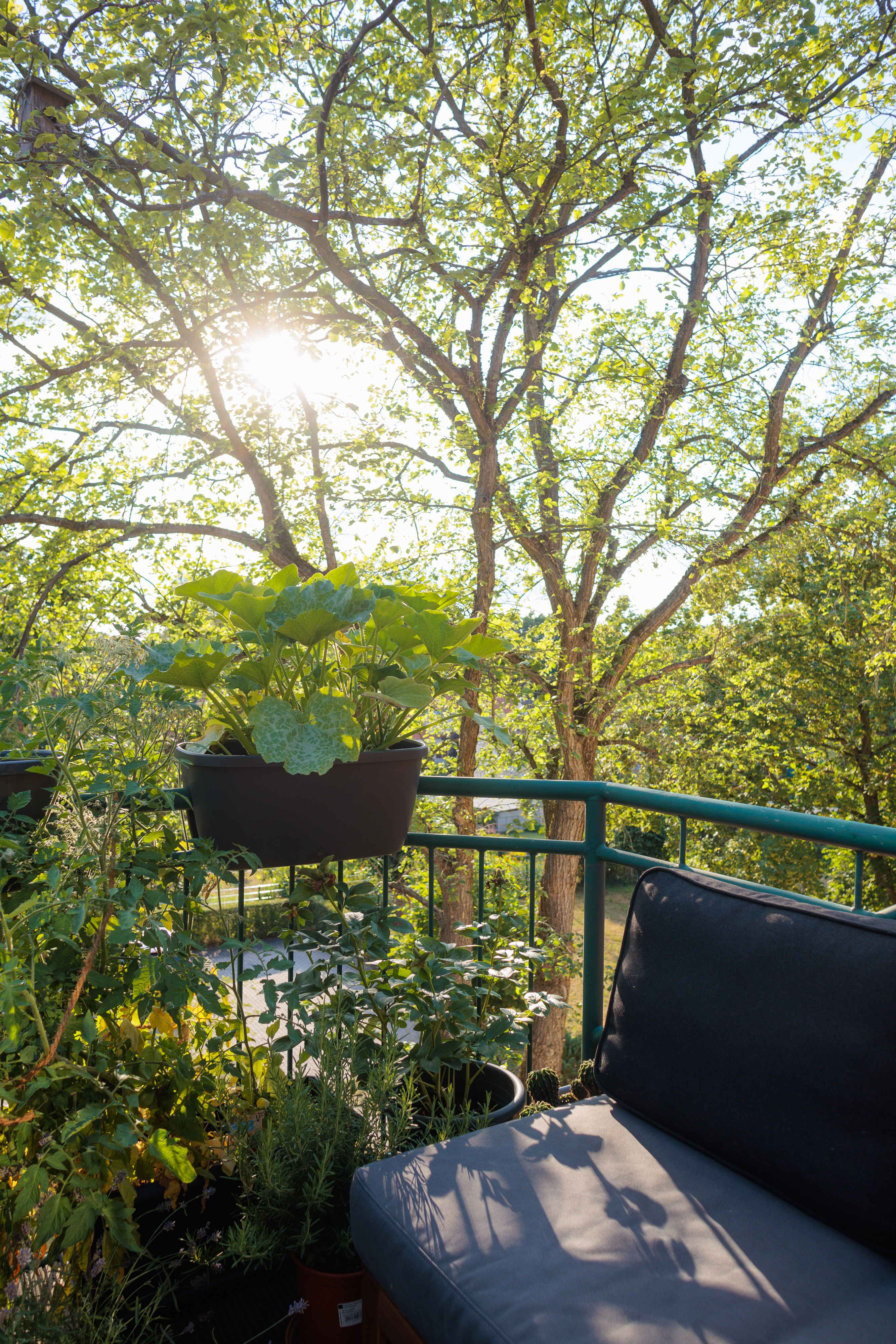 - Großer Balkon mit Holzpaneelen.