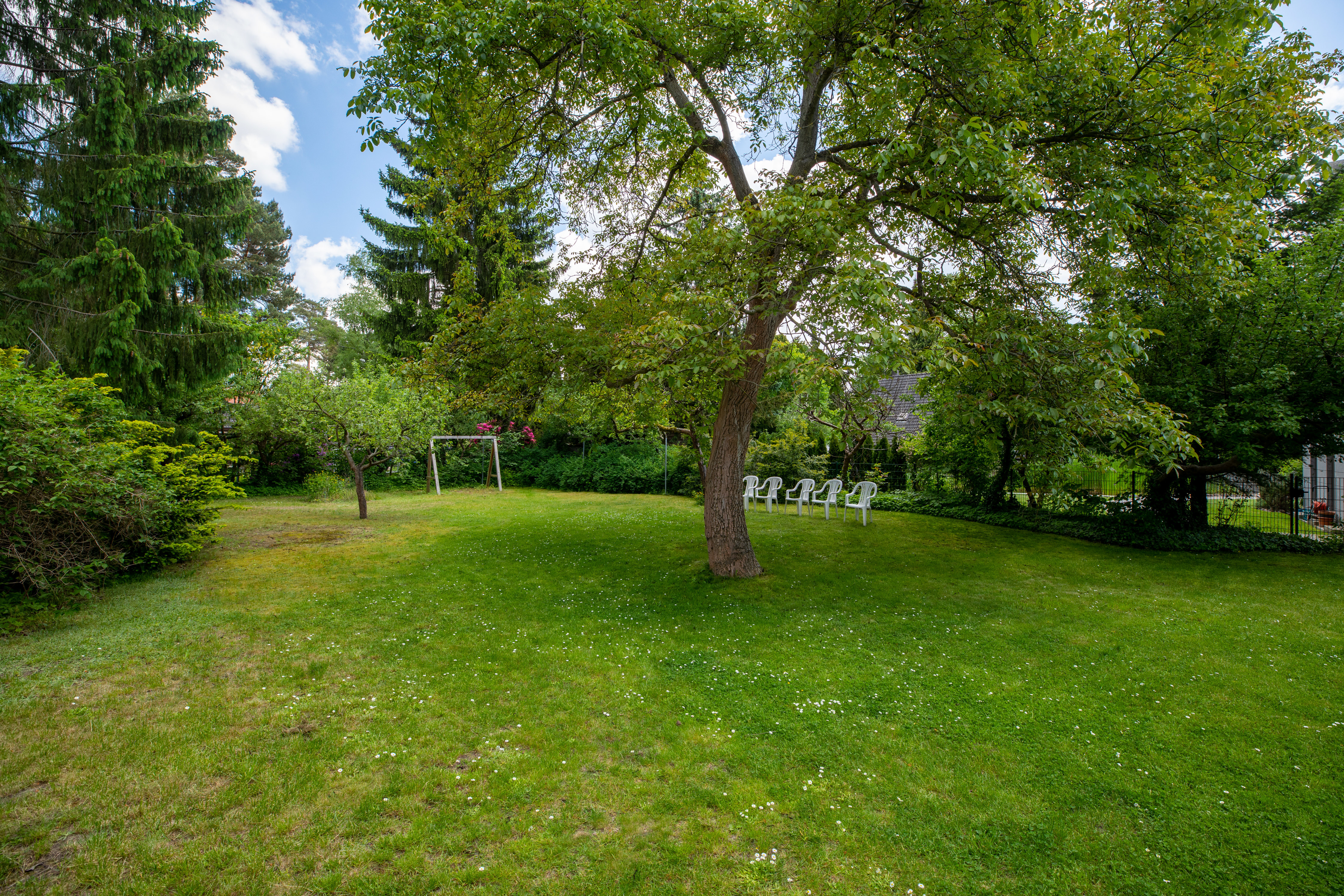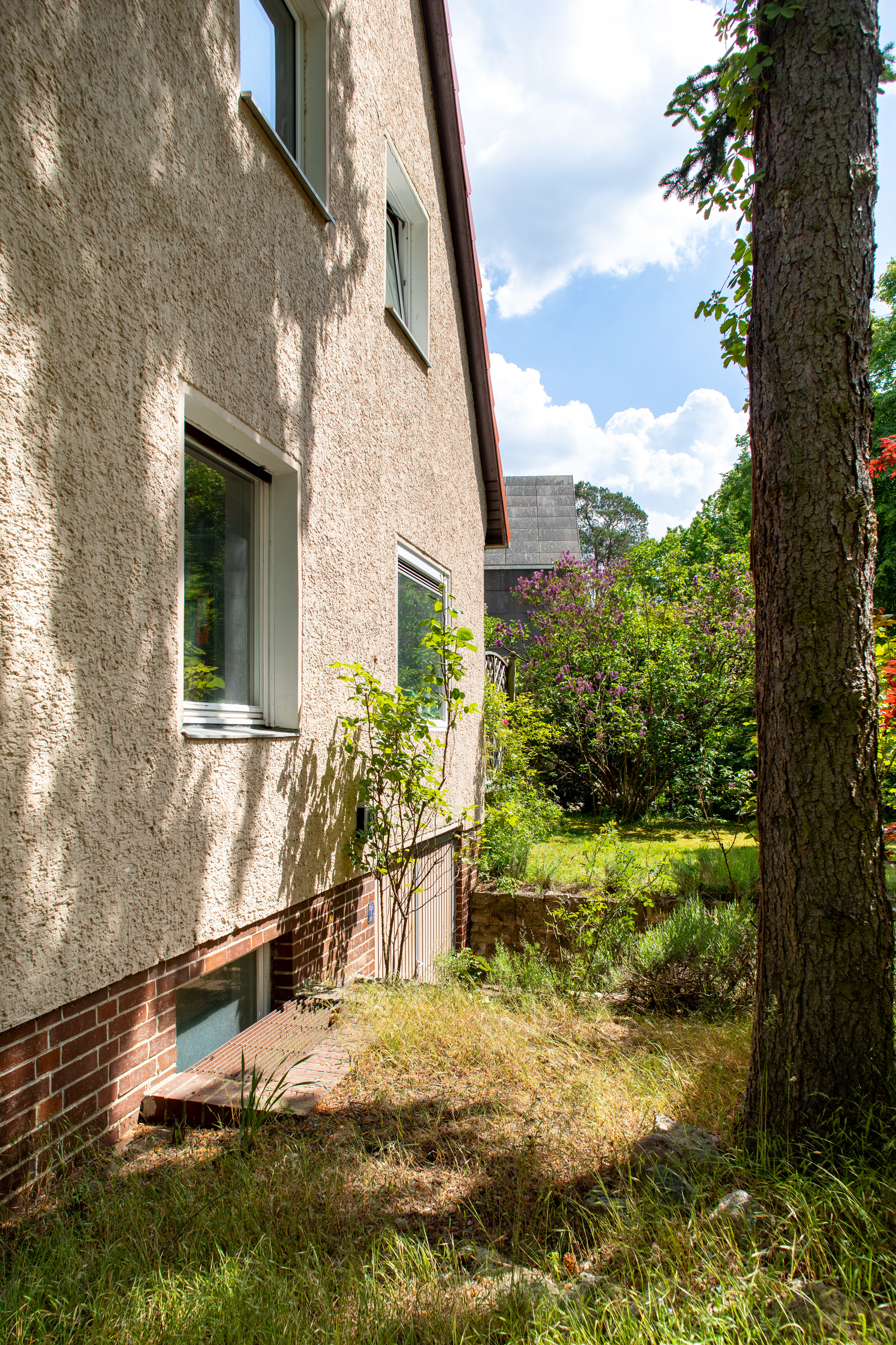 Das Einfamilienhaus wird abgerissen. Im vorderen Teil des Grundstücks ist eine Bebauung mit zwei Vollgeschossen und einer Wohnfläche bis zu 300 m² möglich, zzgl. Vollunterkellerung. Der große Garten wird für das Familienleben genutzt.