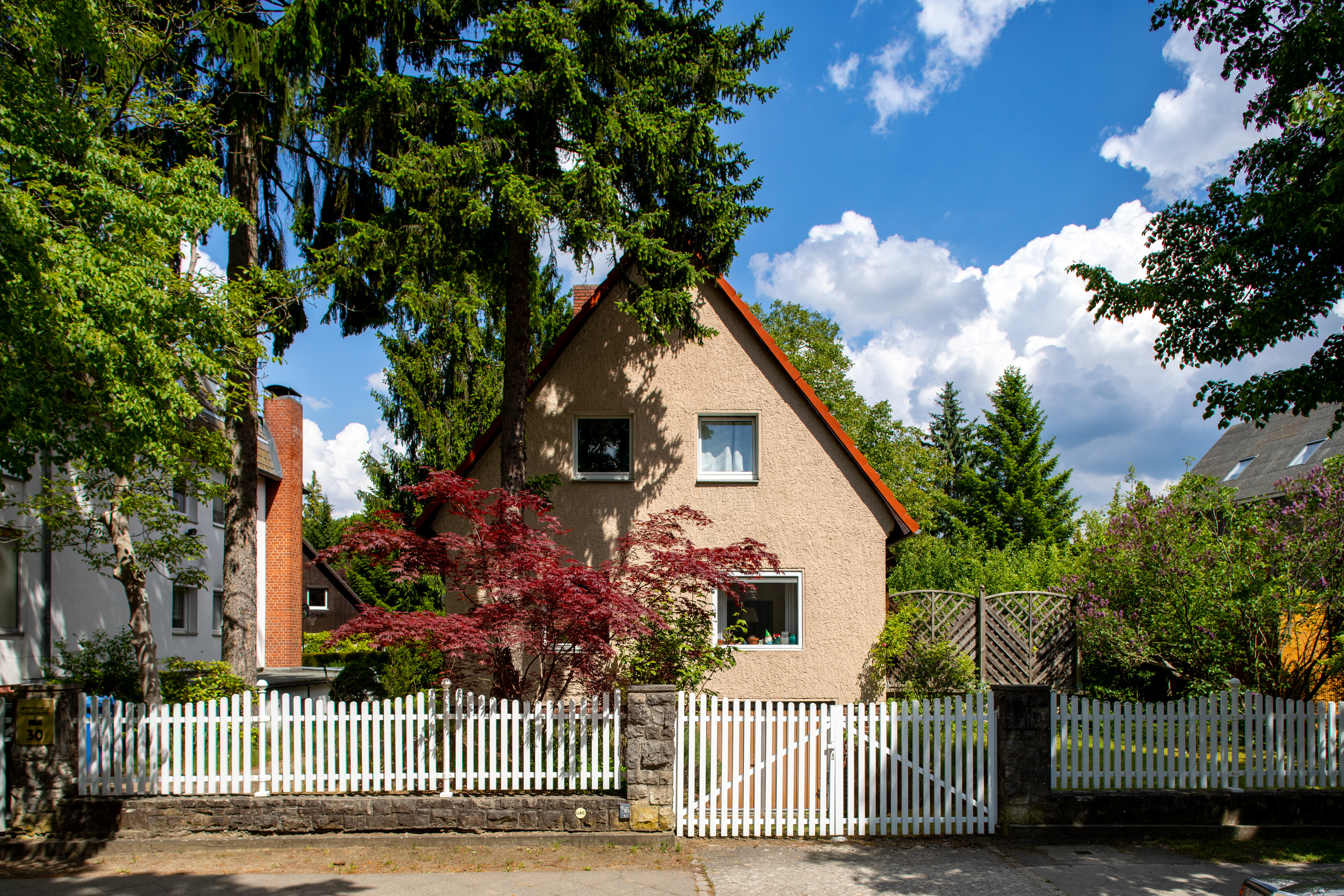Das 1954 gebaute Einfamilienhaus steht mittig in der vorderen Hälfte eines fast 1000 m² großen sonnigen Grundstücks in Frohnau im Norden Berlins. Die 122 m² Wohnfläche verteilen sich auf zwei Ebenen und fünf Zimmer, von denen sich zwei im Erdgeschoss und drei im Obergeschoss des Hauses befinden. Auf der unteren Ebene befinden sich Wohn- und Esszimmer, eine Einbauküche mit großem Fenster zur Abendsonne und ein Gäste-WC. Vom Wohnzimmer gelangt man auf eine große Südterrasse. Im Obergeschoss liegen zwei Kinder- und das Elternschlafzimmer und ein gefliestes Familien-Duschbad.