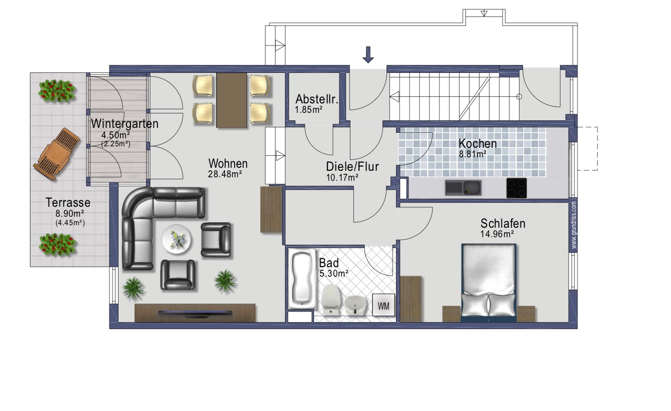 Eine Abstellkammer gehört zu den praktischen Extras der Wohnung. Vom Flur geht es in das offene, großzügige Wohnzimmer. Es ist nach Süden ausgerichtet und bietet sehr viel Platz für vielfältige Wohnwünsche. Einzigartig an der Wohnung ist der helle Wintergarten mit der sich daran anschließenden Südterrasse. Das kleine, zugehörige Gartenstück lässt sich in ein eigenes Blumenparadies verwandeln.