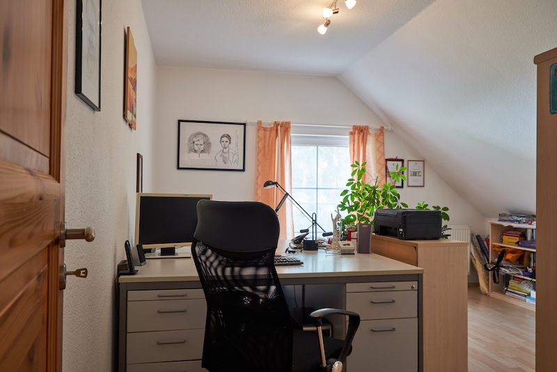 Im Dachgeschoss befinden sich vier Zimmer, das Schlafzimmer, zwei gleichgroße Kinderzimmer, sowie ein viertes Zimmer, welches als weiteres Kinderzimmer oder Arbeitszimmer genutzt werden kann. Außerdem befindet sich hier das schöne Badezimmer welches über eine Dusche und eine Badewanne verfügt.