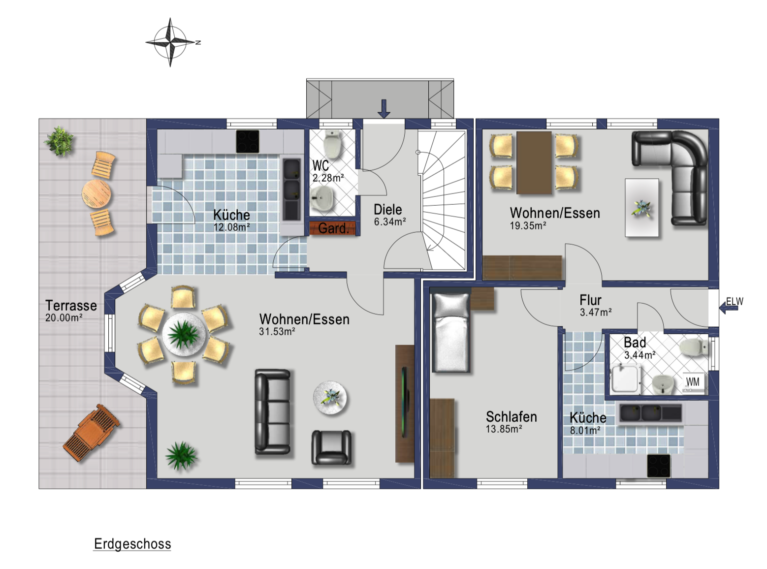 Empfangen werden Sie in Ihrem neuen Zuhause in einer großen tagesbelichteten Diele, von der aus ein Gäste-WC abgeht. Das ca. 31,5 m² große und helle Wohnzimmer mit Essbereich lädt zum Wohlfühlen ein, die großzügige offene Küche ist mit einer schönen Einbauküche mit modernen Elektrogeräten eingerichtet. Hier macht das gemeinsame Kochen so richtig Spaß. Vom Wohnzimmer aus gelangen Sie auf die ca. 40 m² große Südterrasse und dem schönen Garten, der direkt am Waldrand endet.
