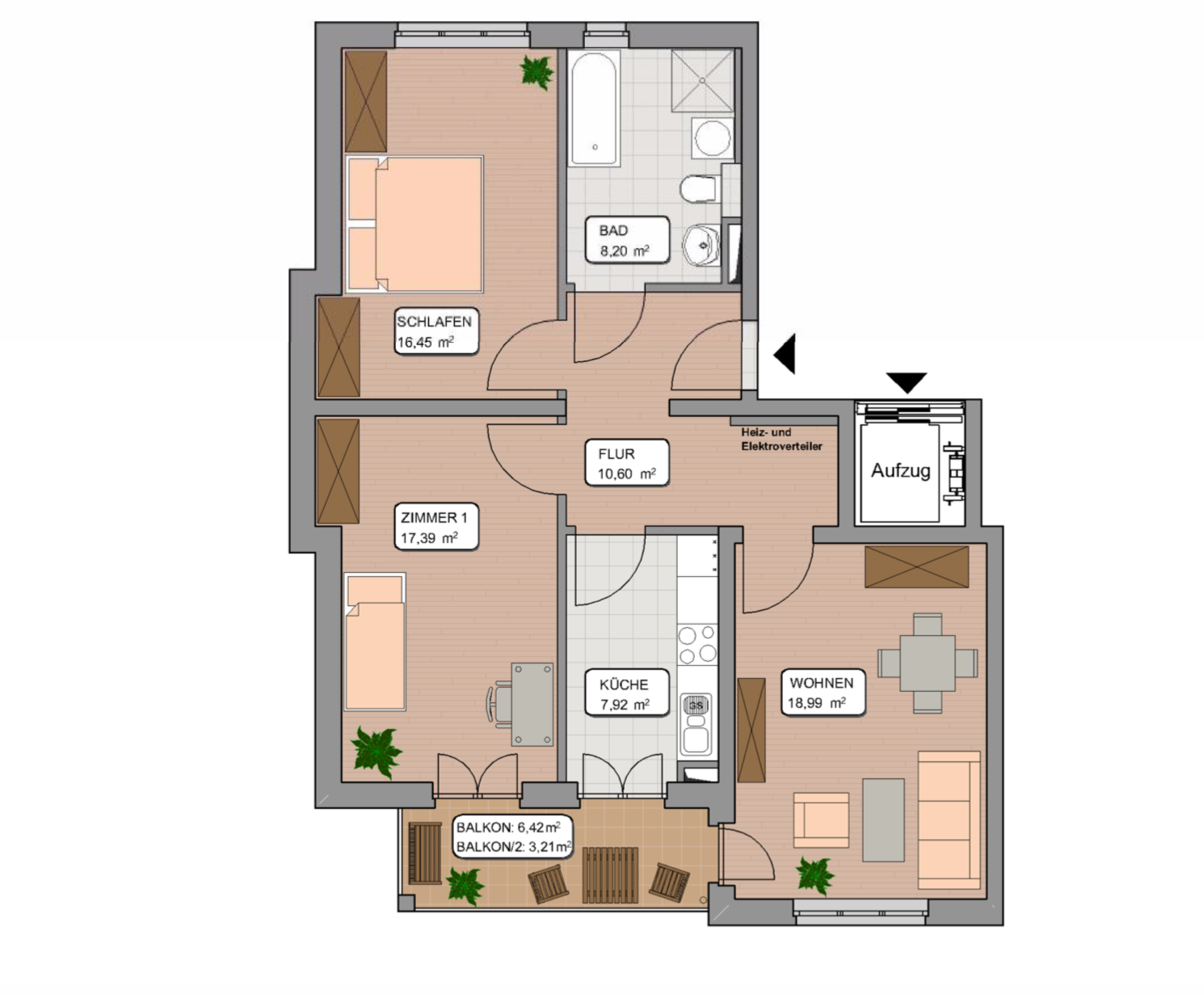 Von dem Wohnzimmer und von einem der Schlafzimmer haben Sie einen Zugang zu dem 6,42 qm großen Balkon, auf dem Sie sich mit Ihren Lieblingsblumen umgeben können. Die moderne Küche sowie ein tagesbelichtetes Bad komplettieren diese gut geschnittene Wohnung.