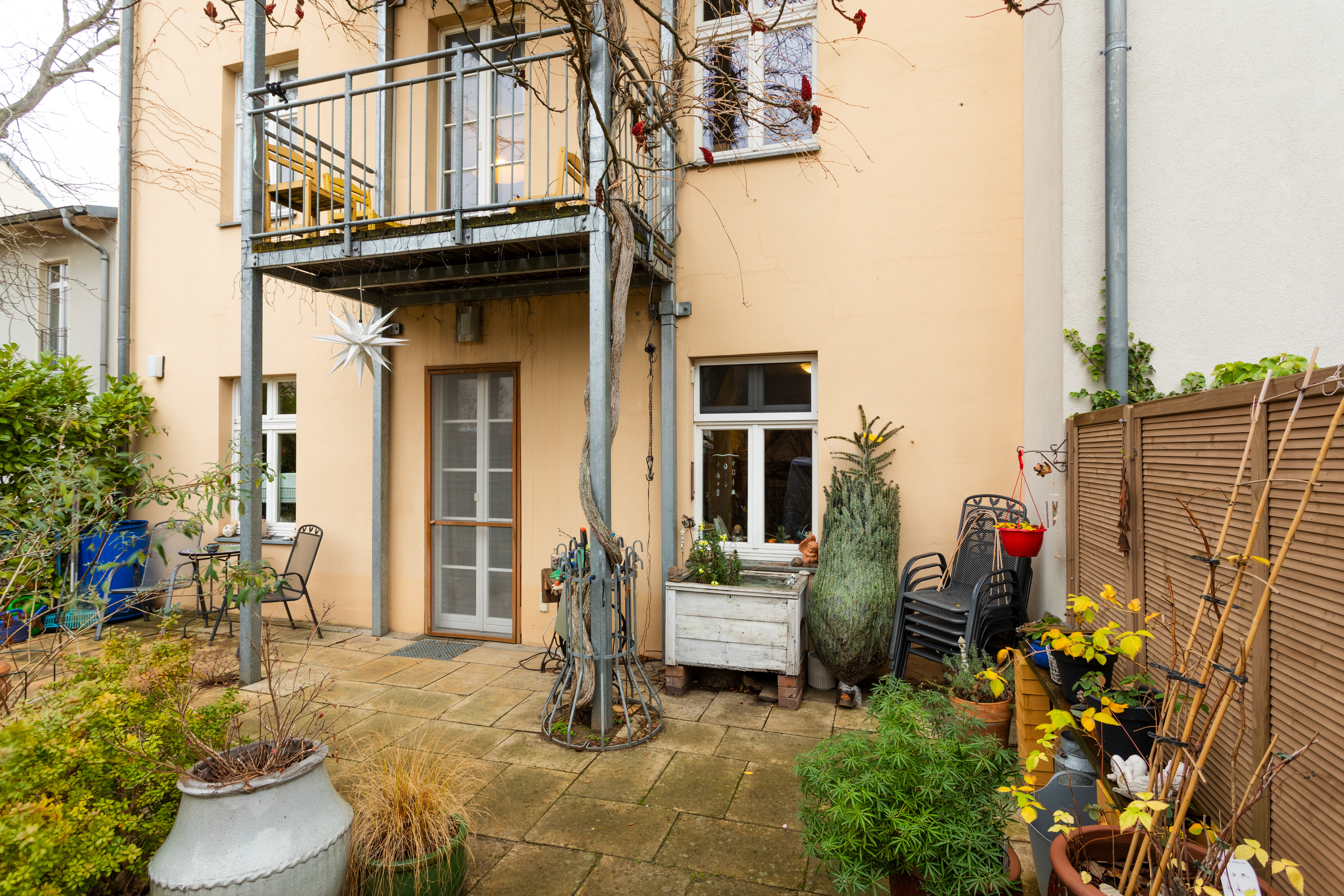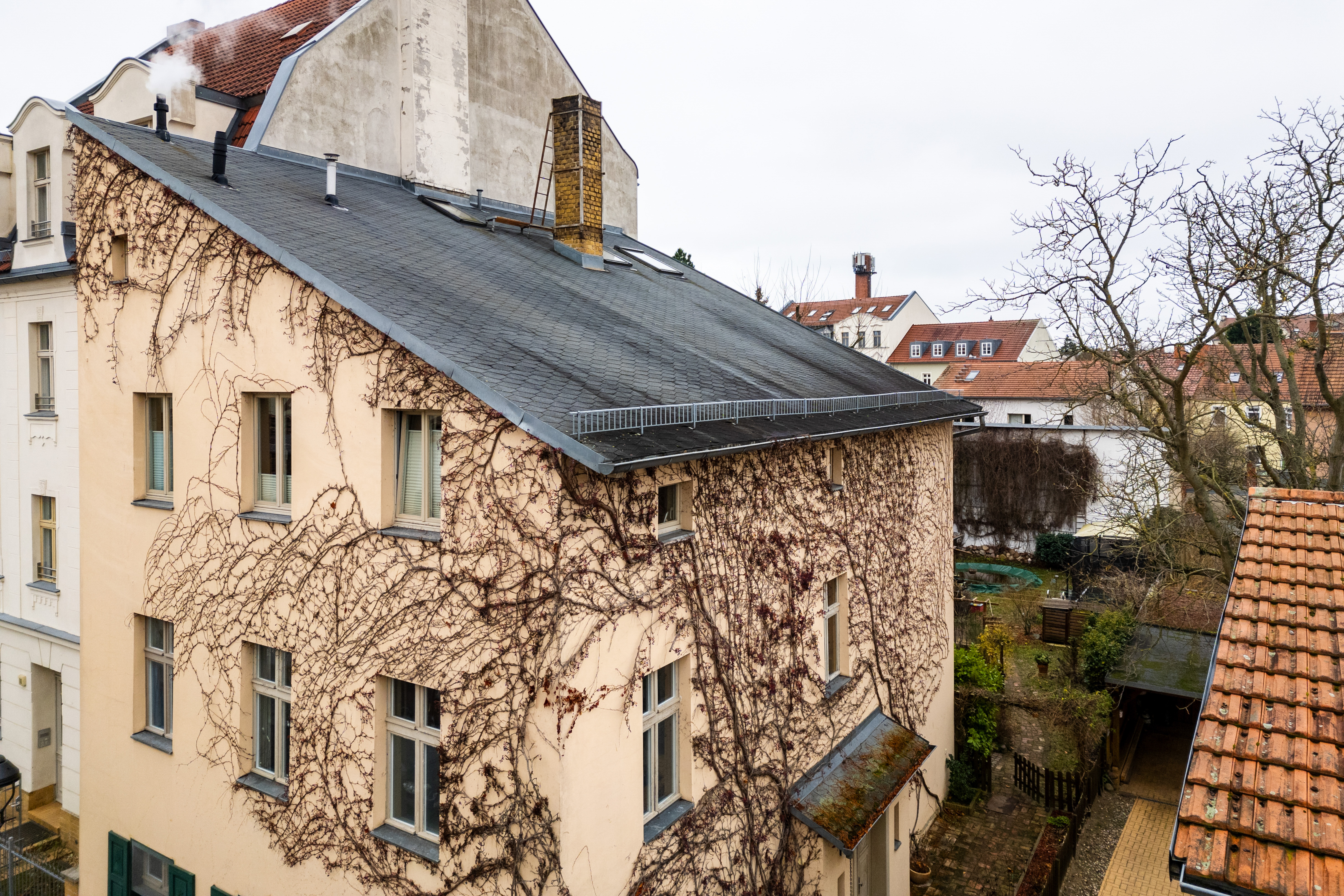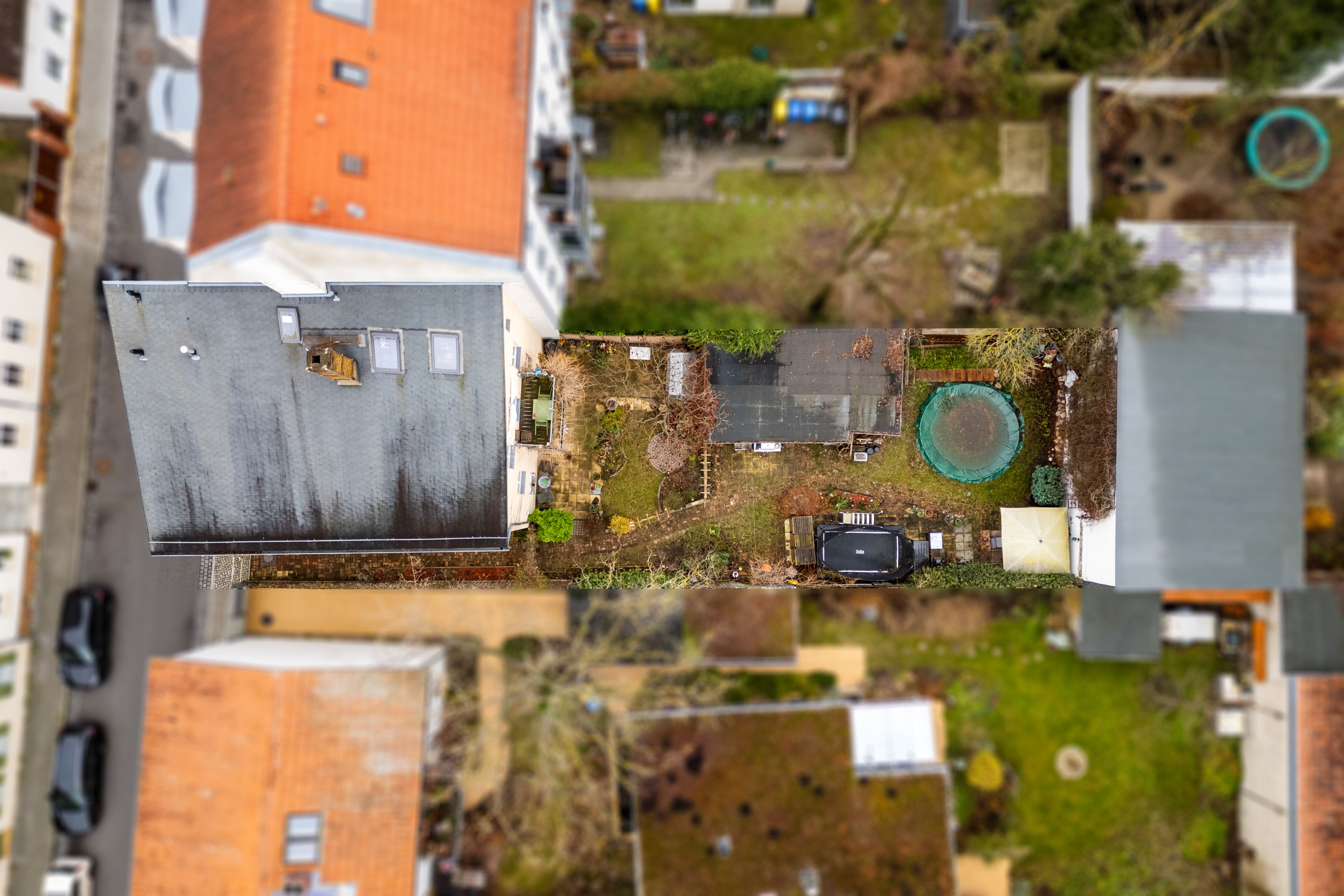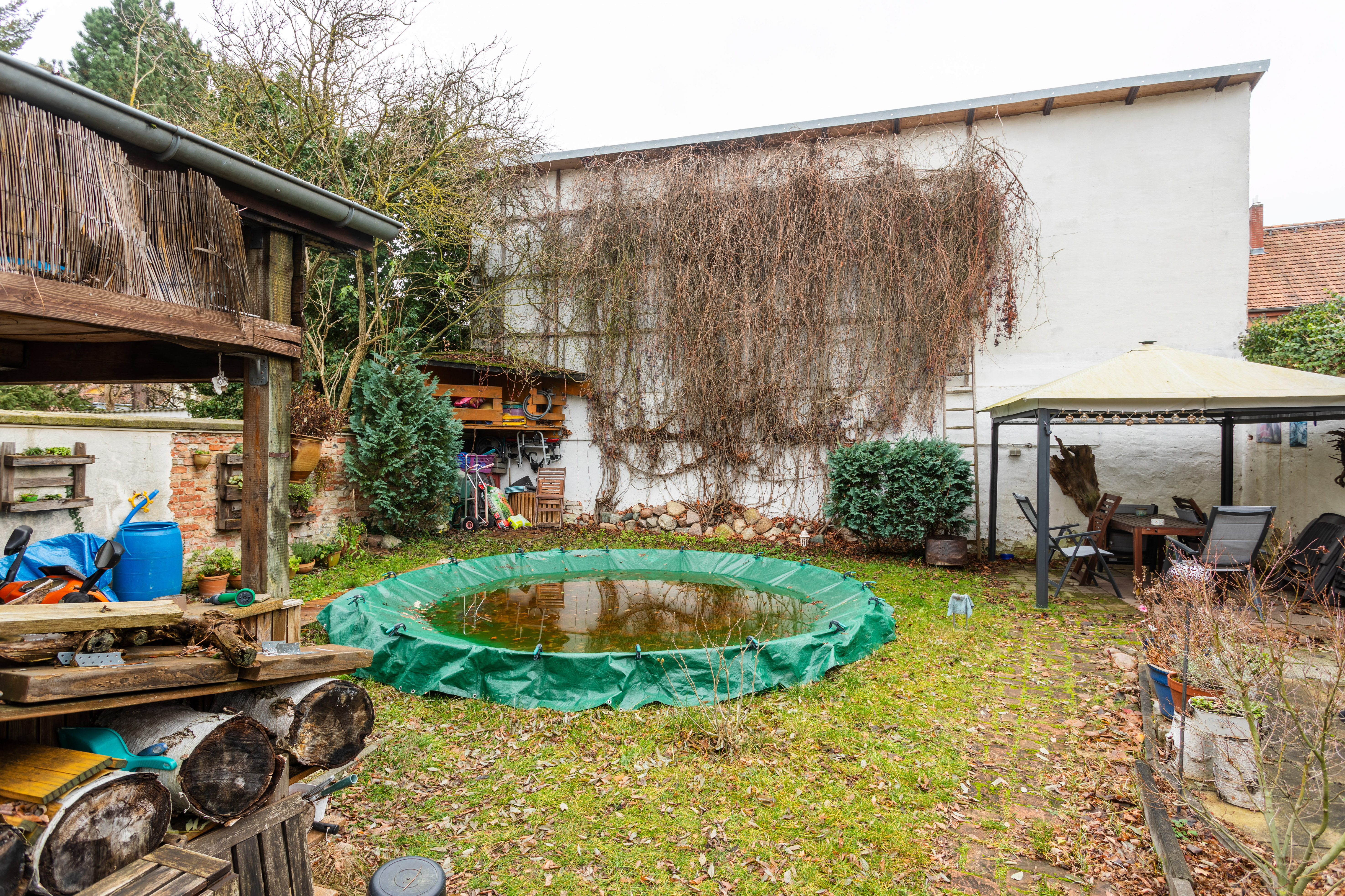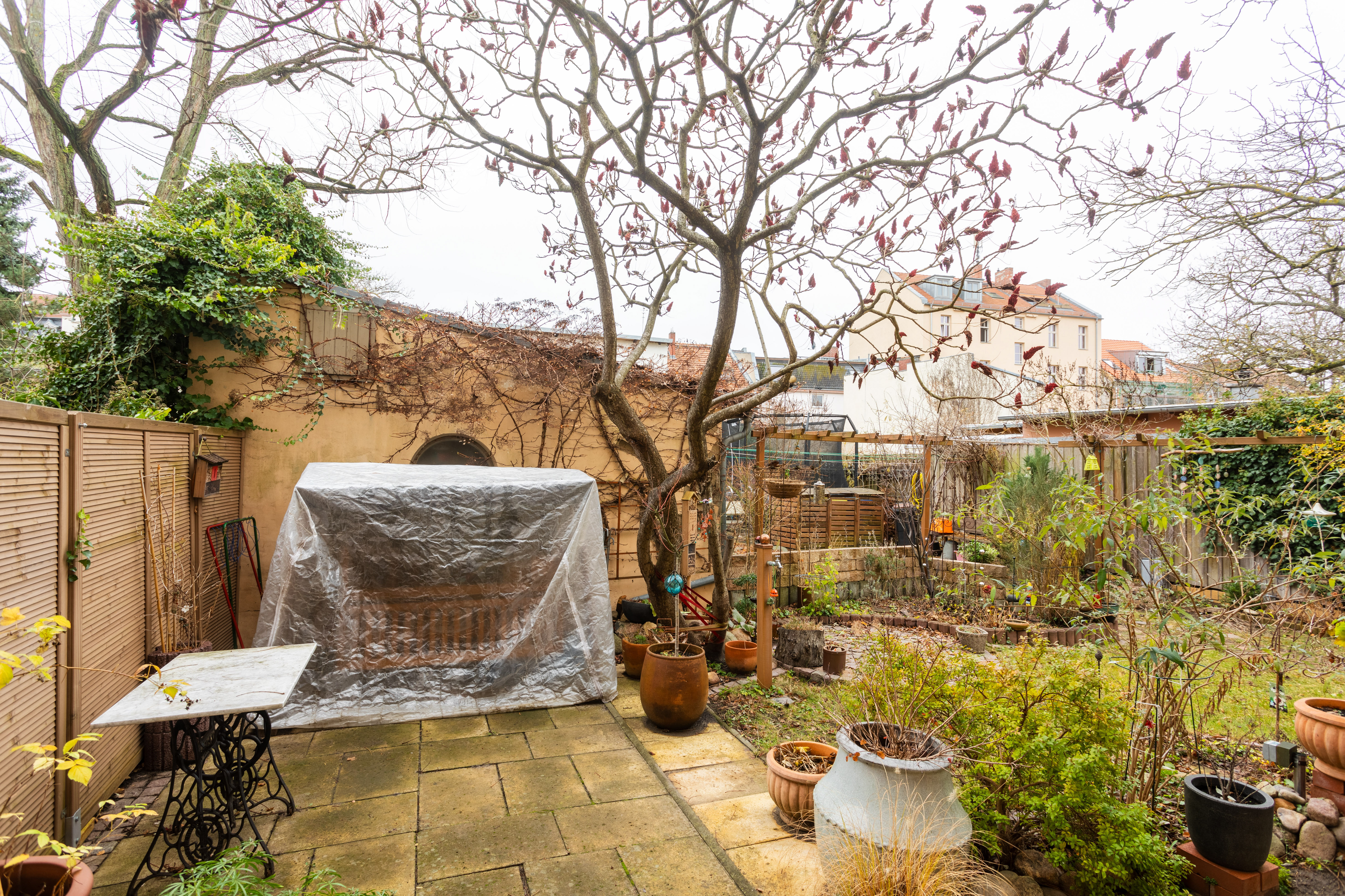 - Wildromantischer Garten: Ein gemeinsamer Rückzugsort für gesellige Stunden, Spiel und Entspannung – ein kleines Paradies mitten in der Stadt. Der Aufstellpool verbleibt im Garten.