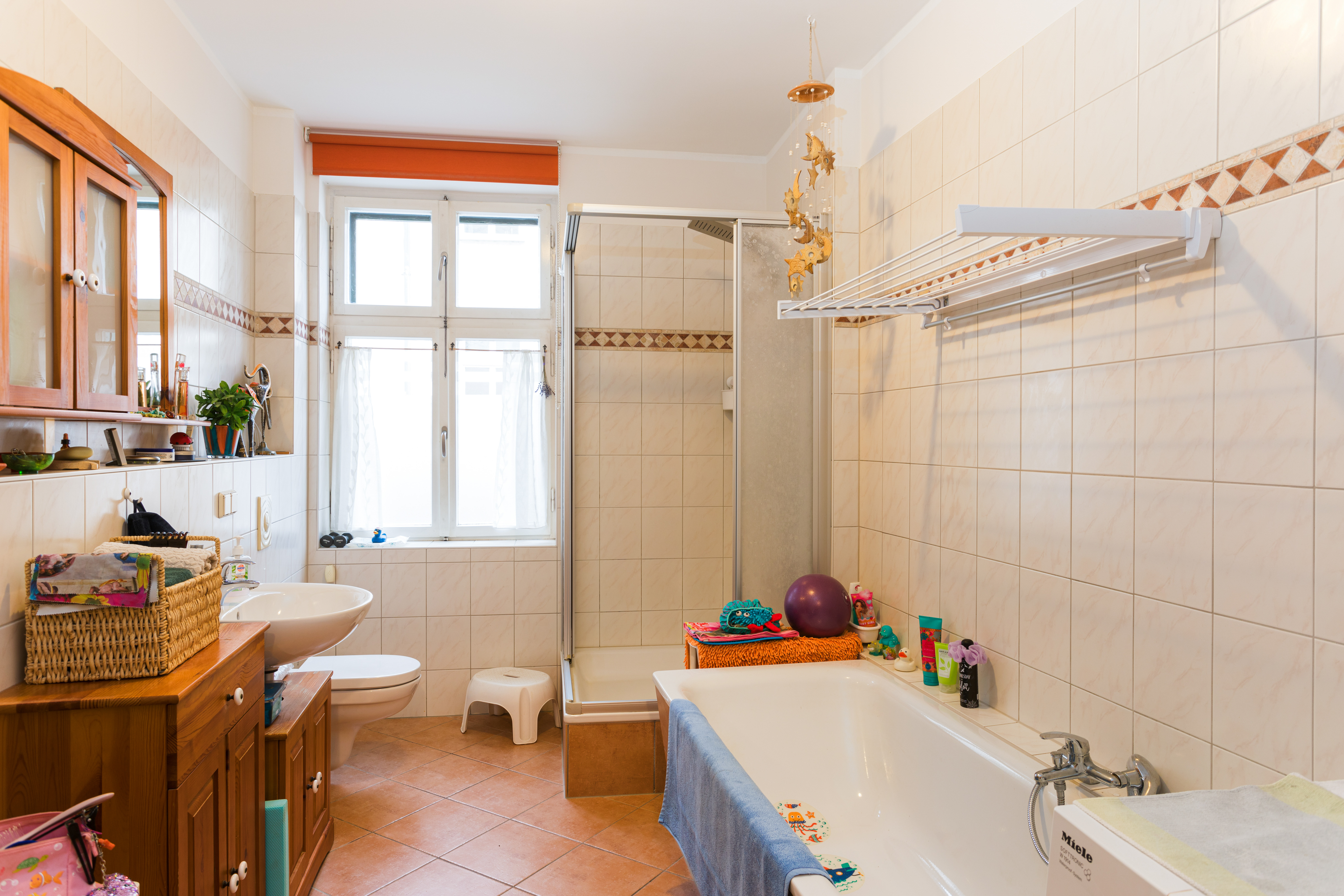 - Großzügiges Tageslichtbad: Ausgestattet mit Wanne, Dusche, Waschmaschinenanschluss und einem großen Handtuchheizkörper – eine echte Wohlfühloase.