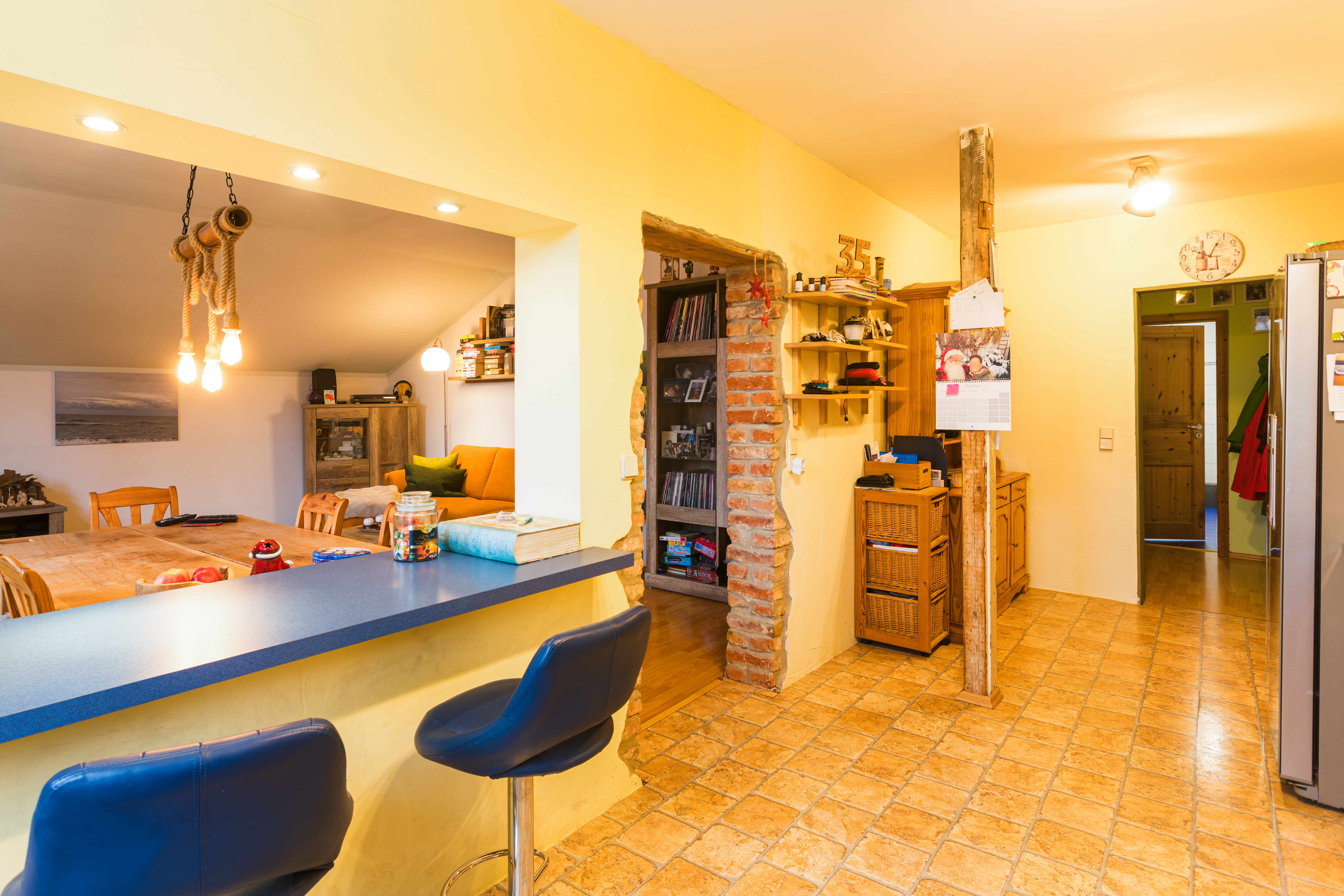 - Zentrale Wohnküche: Die geräumige Küche bildet das Herz der Etage. Eine Durchreiche und der offene Durchgang zum Wohnbereich machen diesen Raum ideal für gesellige Stunden.