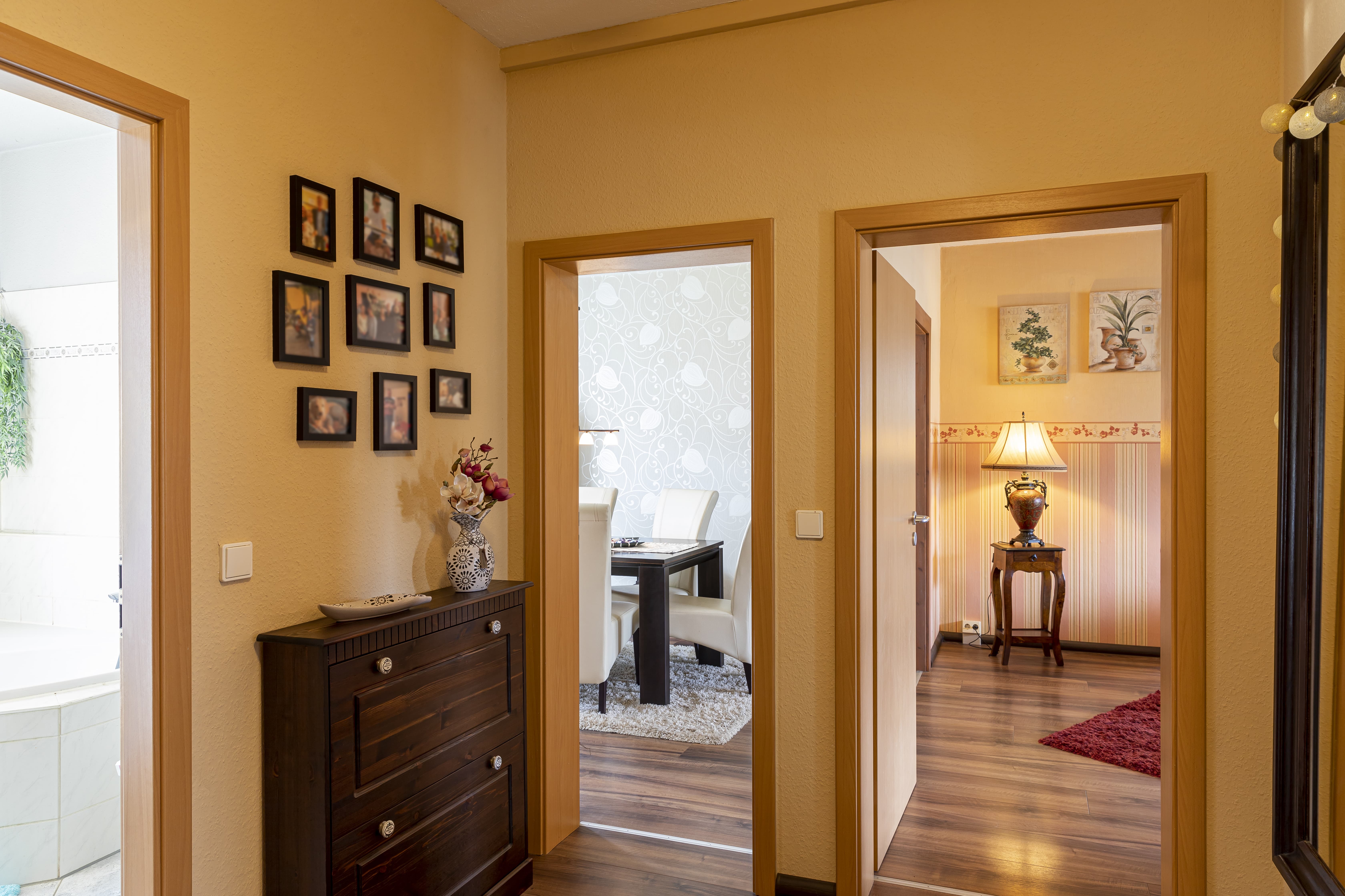 Genauso gut kann eine Familie mit Kind hier leben, da der Durchgang vom Wohn- ins Esszimmer erst nachträglich geöffnet wurde. Mit wenig Aufwand kann diese Wand auch wieder geschlossen werden, so dass drei einzelne Räume entstehen.