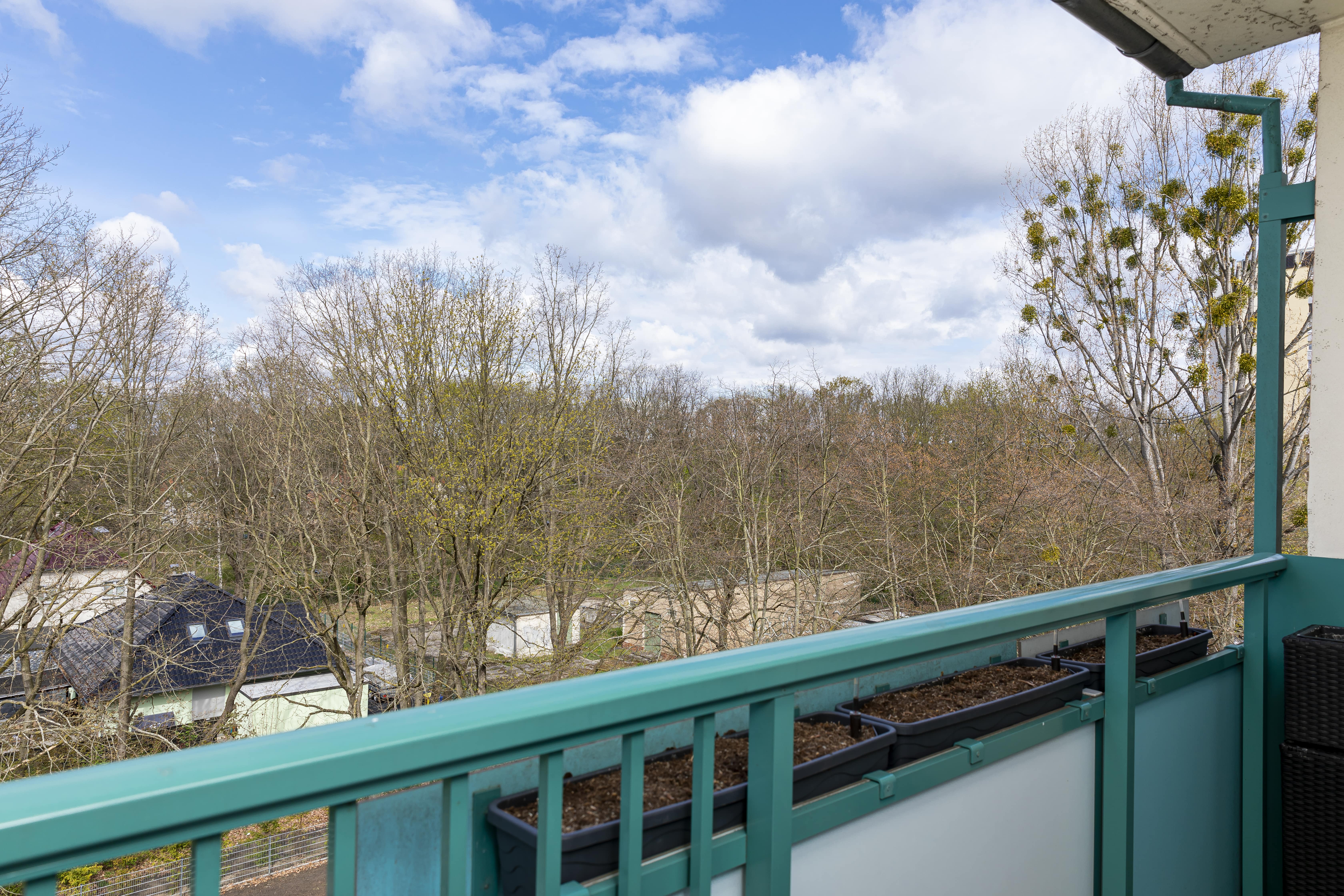 Die Wohnung zeichnet sich durch drei gut geschnittene Zimmer mit insgesamt 78 m² Wohnfläche und Laminatfußboden aus. Das Wohn- und Esszimmer, das in Himmelsrichtung Ost-West verläuft, ist mit einem offenen Durchgang versehen, wodurch viel Tageslicht einfällt. Das vom Wohnzimmer abgehende Schlafzimmer bietet Platz für einen deckenhohen Wandschrank mit viel Stauraum. Ebenfalls vom Wohnbereich treten Sie auf einen großen Balkon, der überdacht ist und so auch im Hochsommer gut genutzt werden kann. Von dort haben Sie einen tollen Blick in die grüne Umgebung.