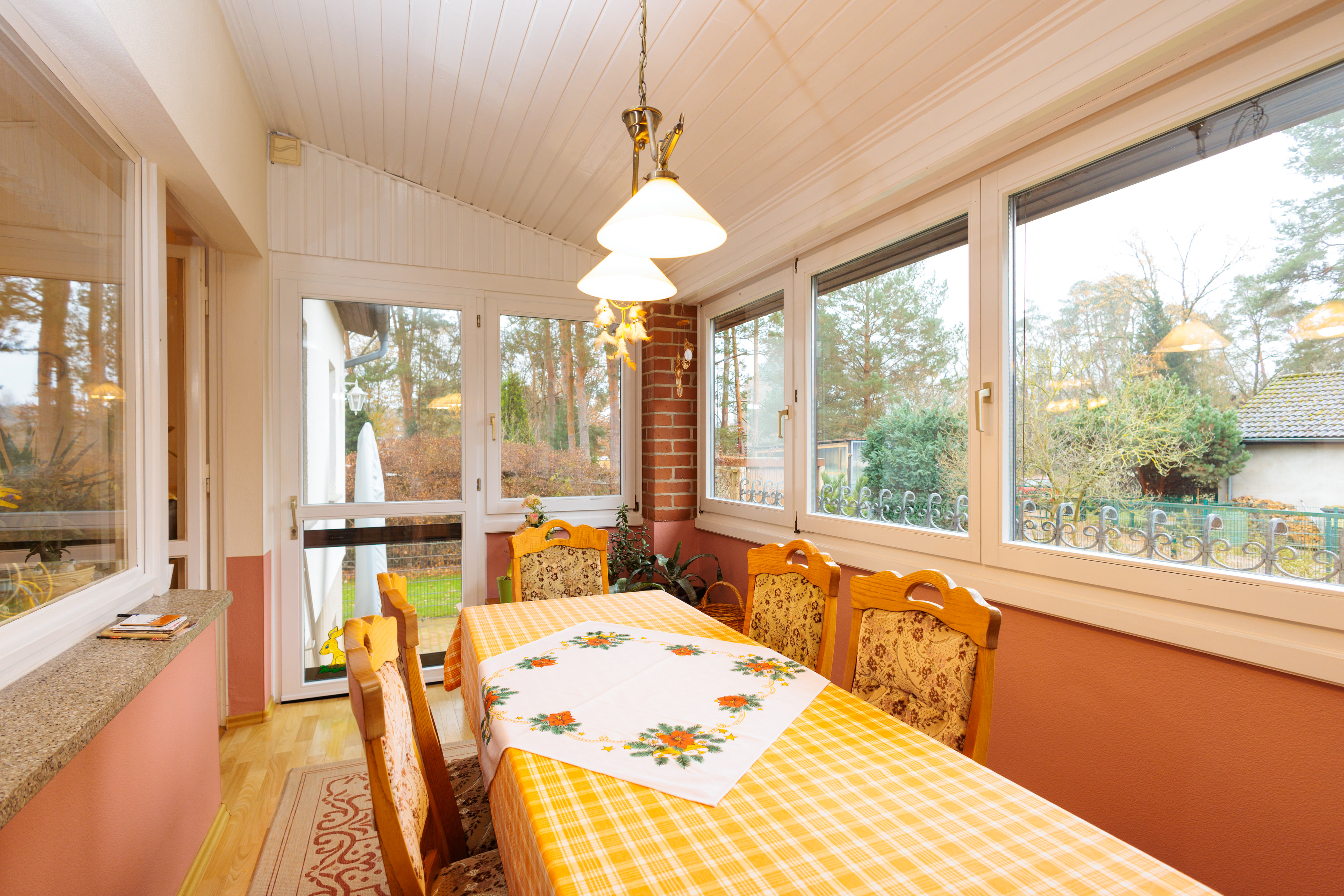 - Wintergarten mit Parkettboden und Holzdecke.