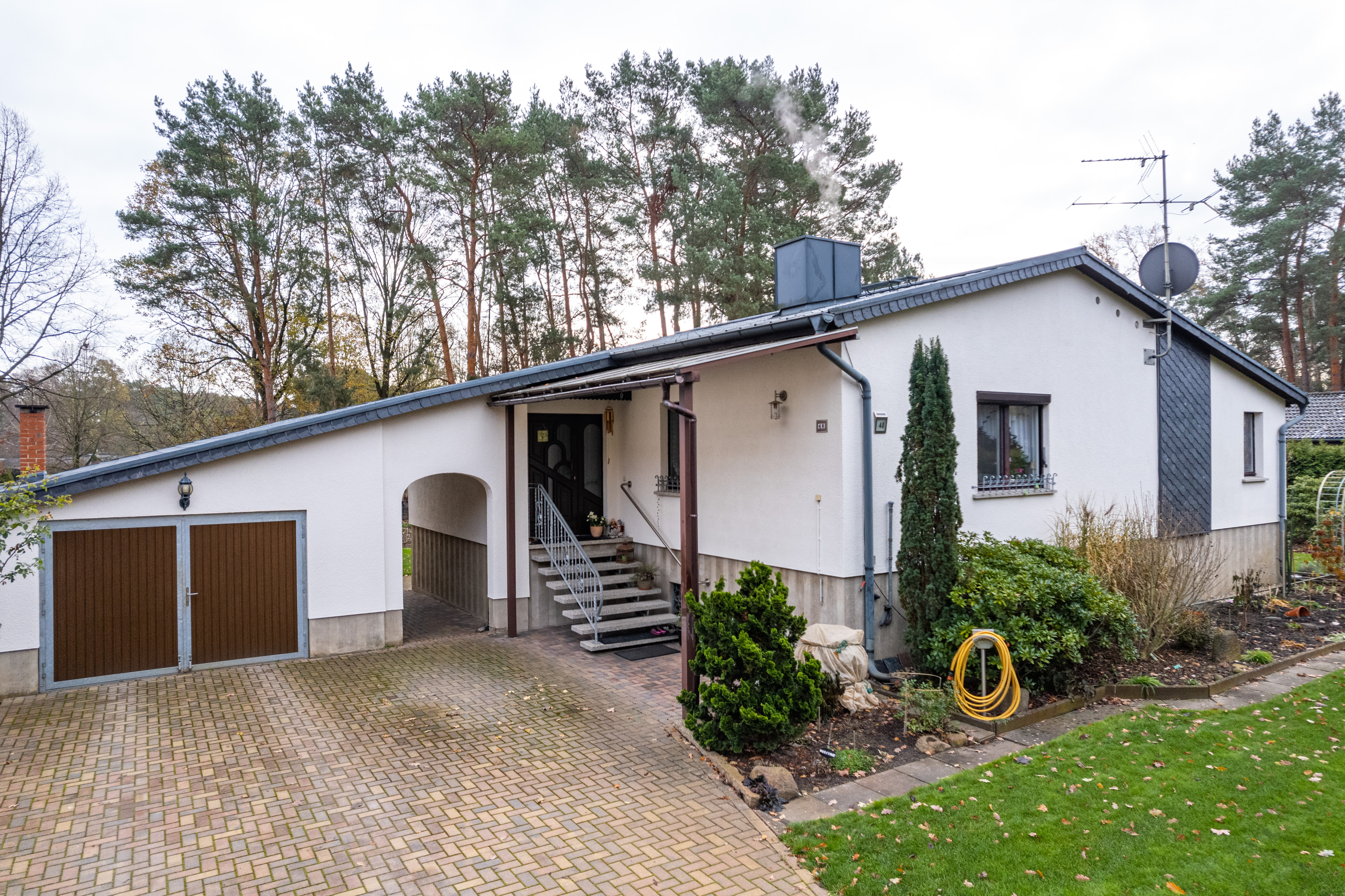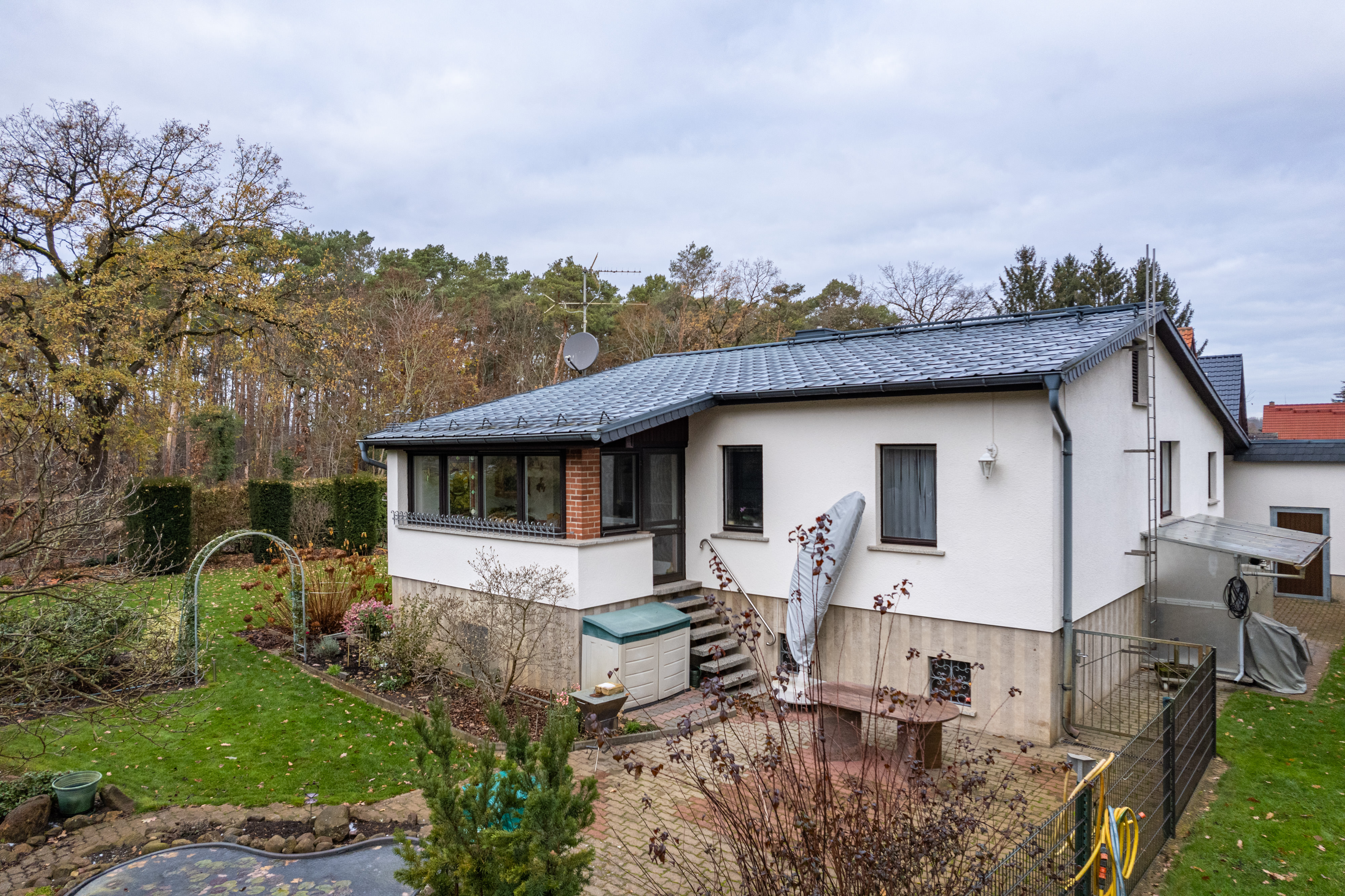 Das freistehende Einfamilienhaus liegt mittig auf einem rund 1.850 m2 großen Grundstück, das nach Süden unmittelbar an ein Waldgebiet grenzt. Es wurde 1987 in Massivbauweise errichtet und über all die Jahre liebevoll vom Eigentümer gepflegt und sehr gut in Schuss gehalten. Das bungalowähnliche Haus bietet 160 m2 Wohnfläche auf zwei Etagen. Zusätzlich gibt es einen knapp 80 m2 großen Werkstattkomplex, in welchem mehrere Jahrzehnte die Schlosserei des Eigentümers untergebracht war. Beide Gebäude sind durch das Dach miteinander verbunden und ein Durchgang zwischen den Gebäudeteilen verbindet den großen gepflasterten Zufahrtsbereich mit dem hinteren Gartenteil. Dieses Arrangement ist besonders interessant für alle, die eine große Hobbywerkstatt einrichten möchten, Autos schrauben oder Oldtimer reparieren wollen, oder sonstwie Platz für eine Freizeitbeschäftigung benötigen oder Lagerbedarf haben.