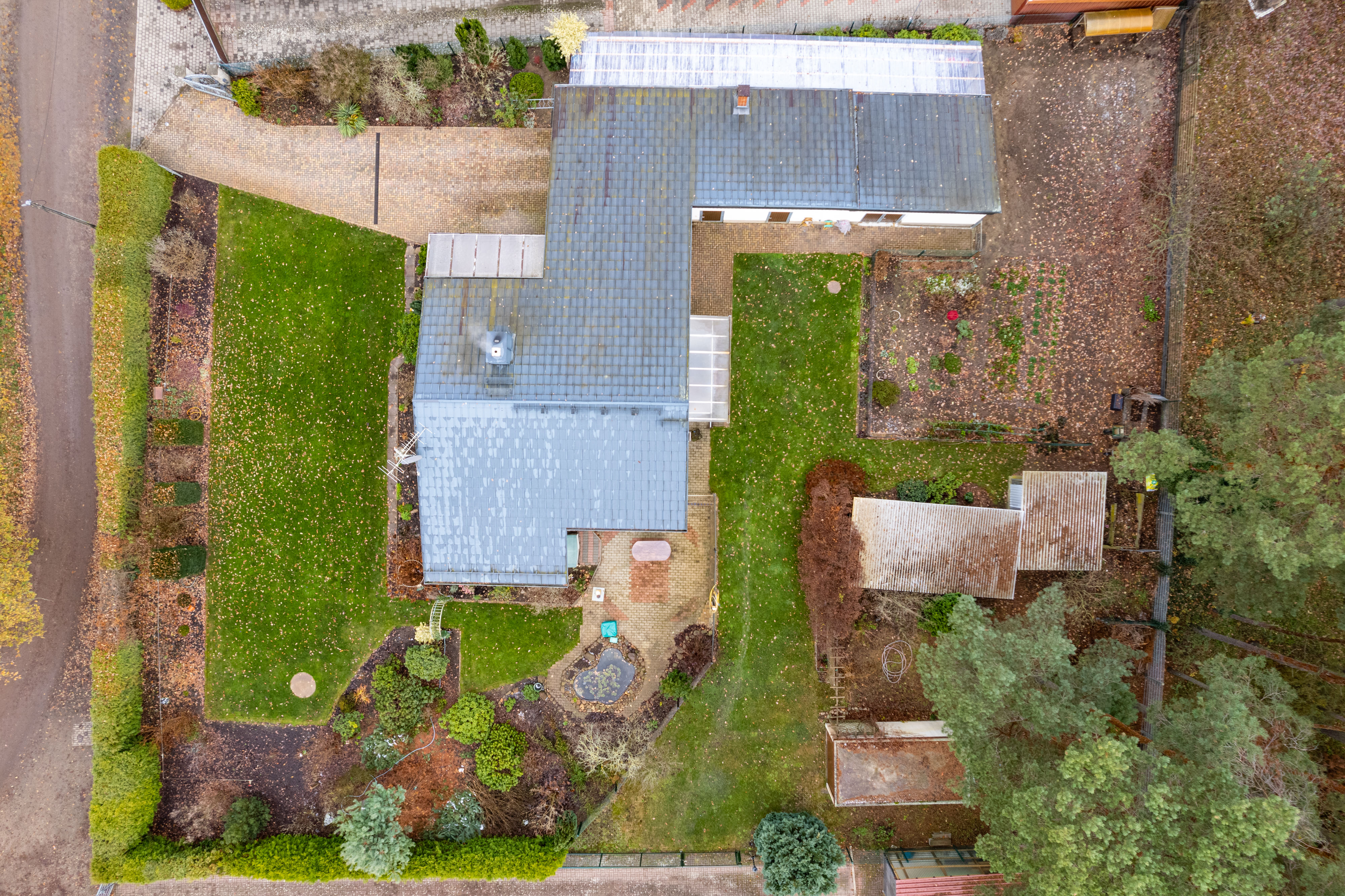 Der Garten ist in drei Bereiche gegliedert und bietet sehr viel Platz für verschiedene Nutzungen. Aktuell befinden sich vor und hinter dem Haus große freie und sehr gut gepflegte Rasenflächen. Dazwischen dehnt sich eine große gepflasterte Terrasse mit Teich aus. Im hinteren Gartenbereich ist ein größeres Stück als Nutzgarten abgetrennt und wird für die Selbstversorgung bewirtschaftet.