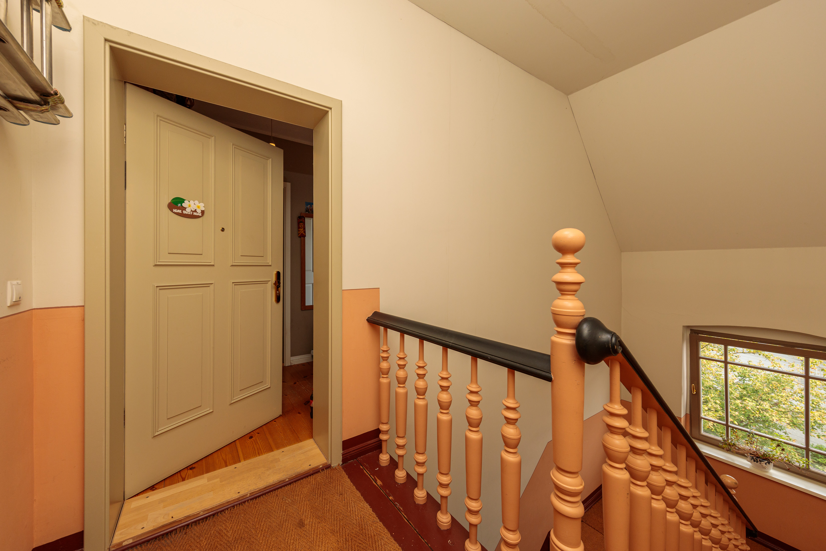 Das Treppenhaus wurde detailgetreu aufgearbeitet und glänzt durch seine historische Holztreppe, die mit einem Sisalteppichläufer versehen ist – ein eleganter Hingucker und gleichzeitig praktisch.