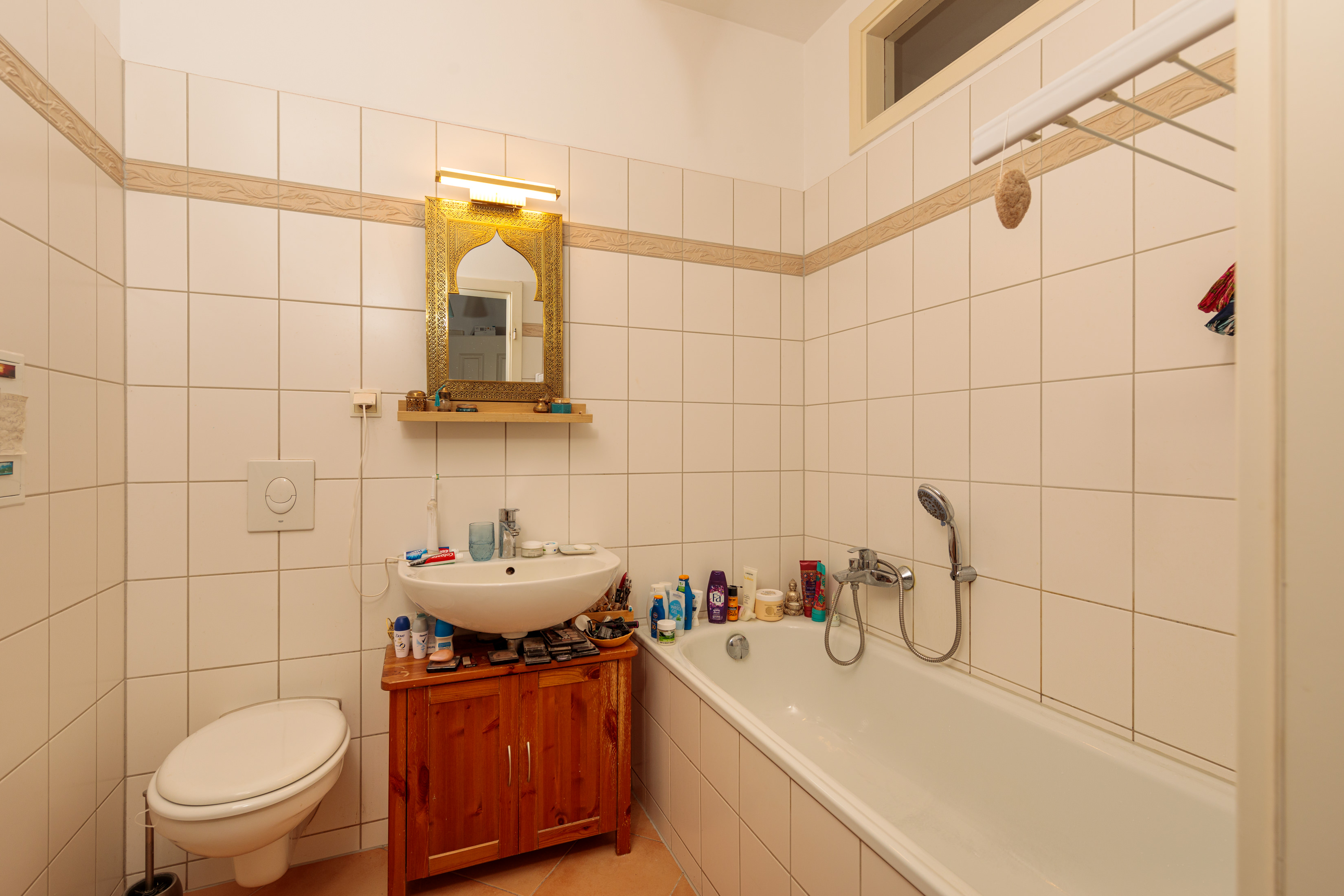 Zentral in der Wohnung gelegen, ist das Badezimmer ein heller Rückzugsort. Tageslicht gelangt durch ein Oberlicht zwischen Bad und Küche. Das Badezimmer ist mit einer Badewanne, einem Handtuchheizkörper und einer Abluftanlage ausgestattet.