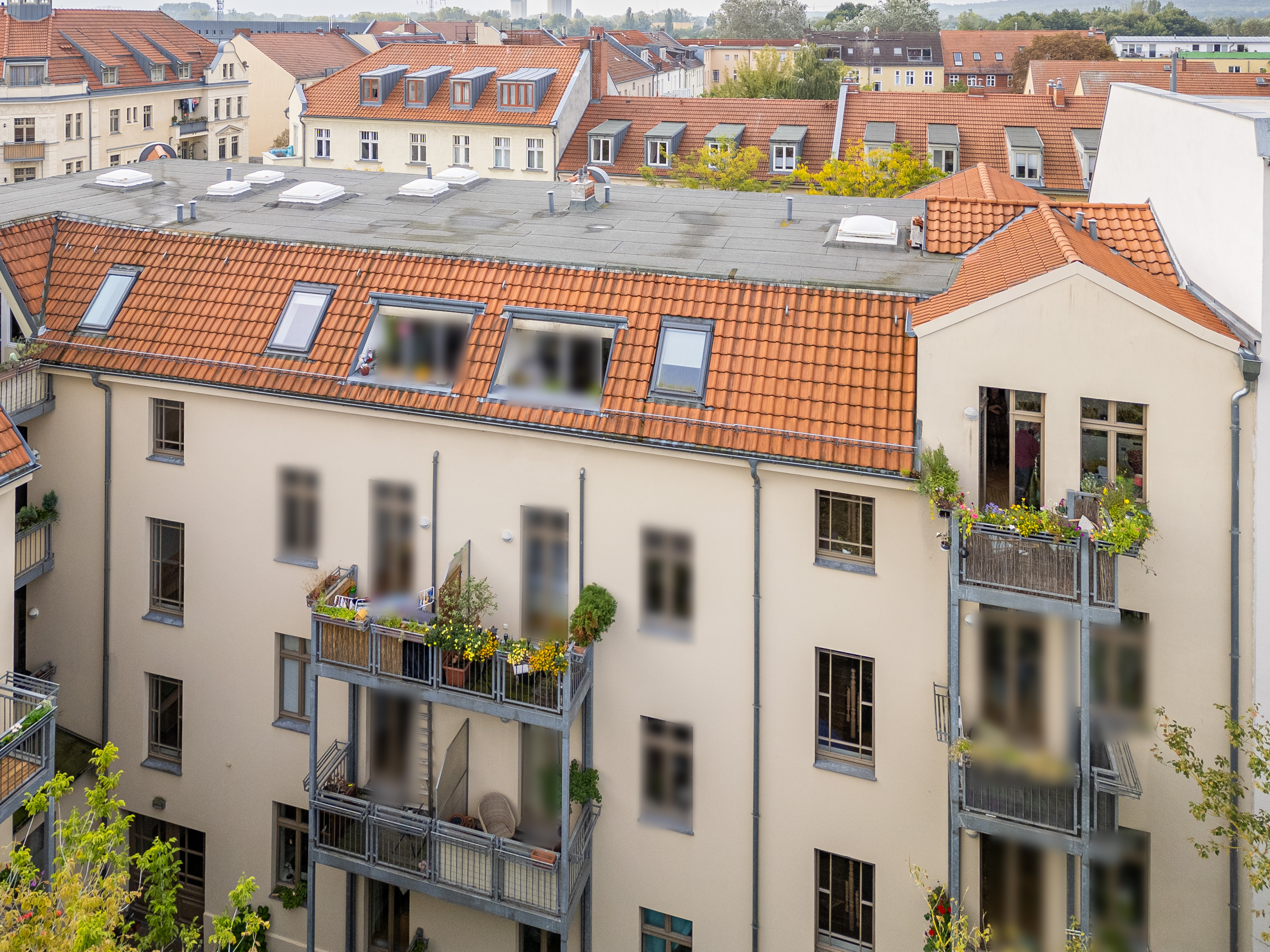 Der Balkon erstreckt sich zum ruhigen Innenhof hin und bietet einen weiten Blick über die Dächer Babelsbergs. Der Bodenbelag besteht aus Bangkirai-Holz und sorgt für ein hochwertiges Ambiente. Die Balkone wurden im Rahmen der Sanierung 2006 neu angebracht.
