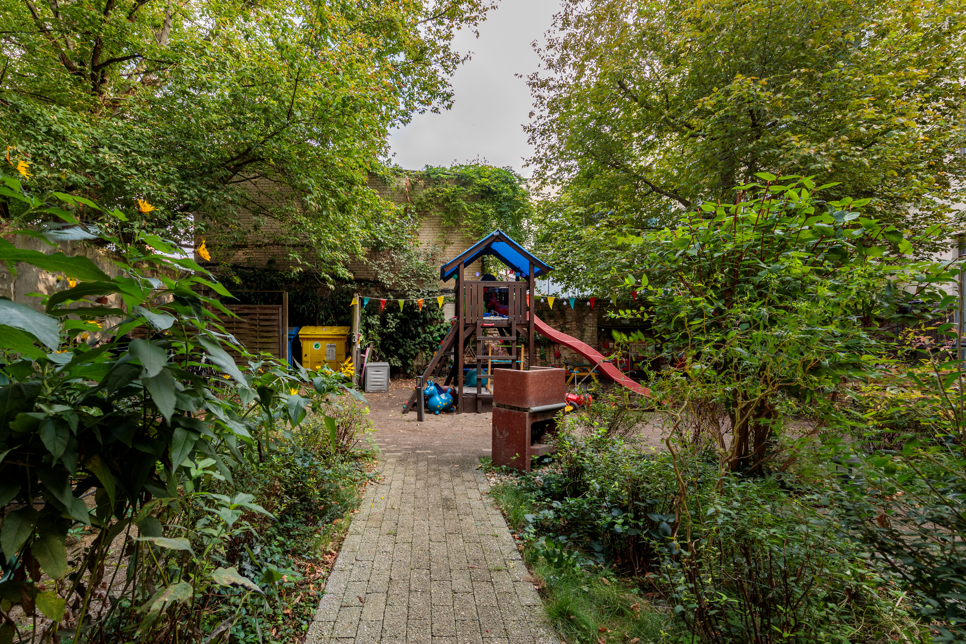 Innenhof: Der idyllische Innenhof bietet neben Sitzgelegenheiten zur gemeinschaftlichen Nutzung auch ein Spielgerät für Kinder, sodass nachbarschaftliches Beisammensein gefördert wird.