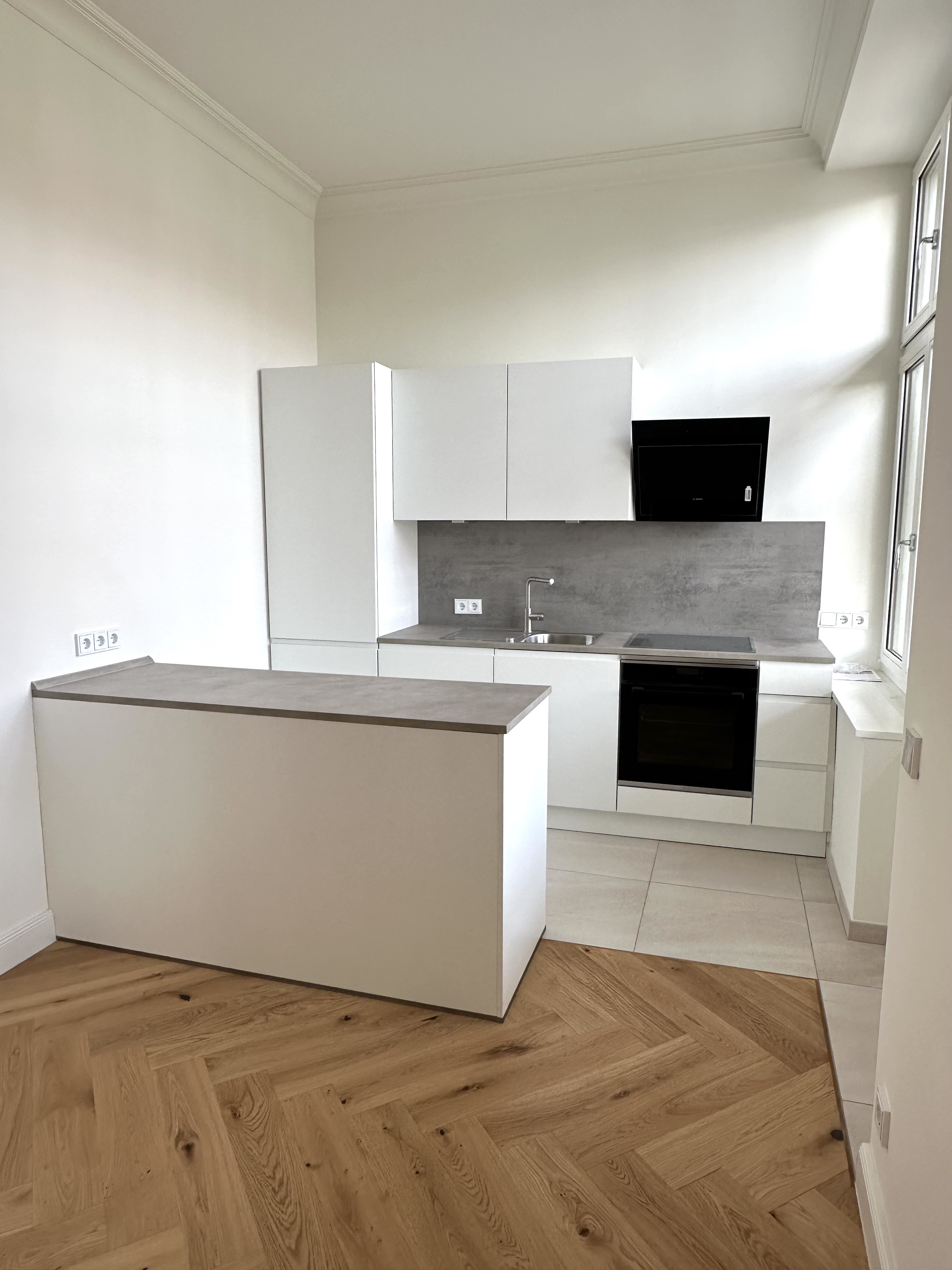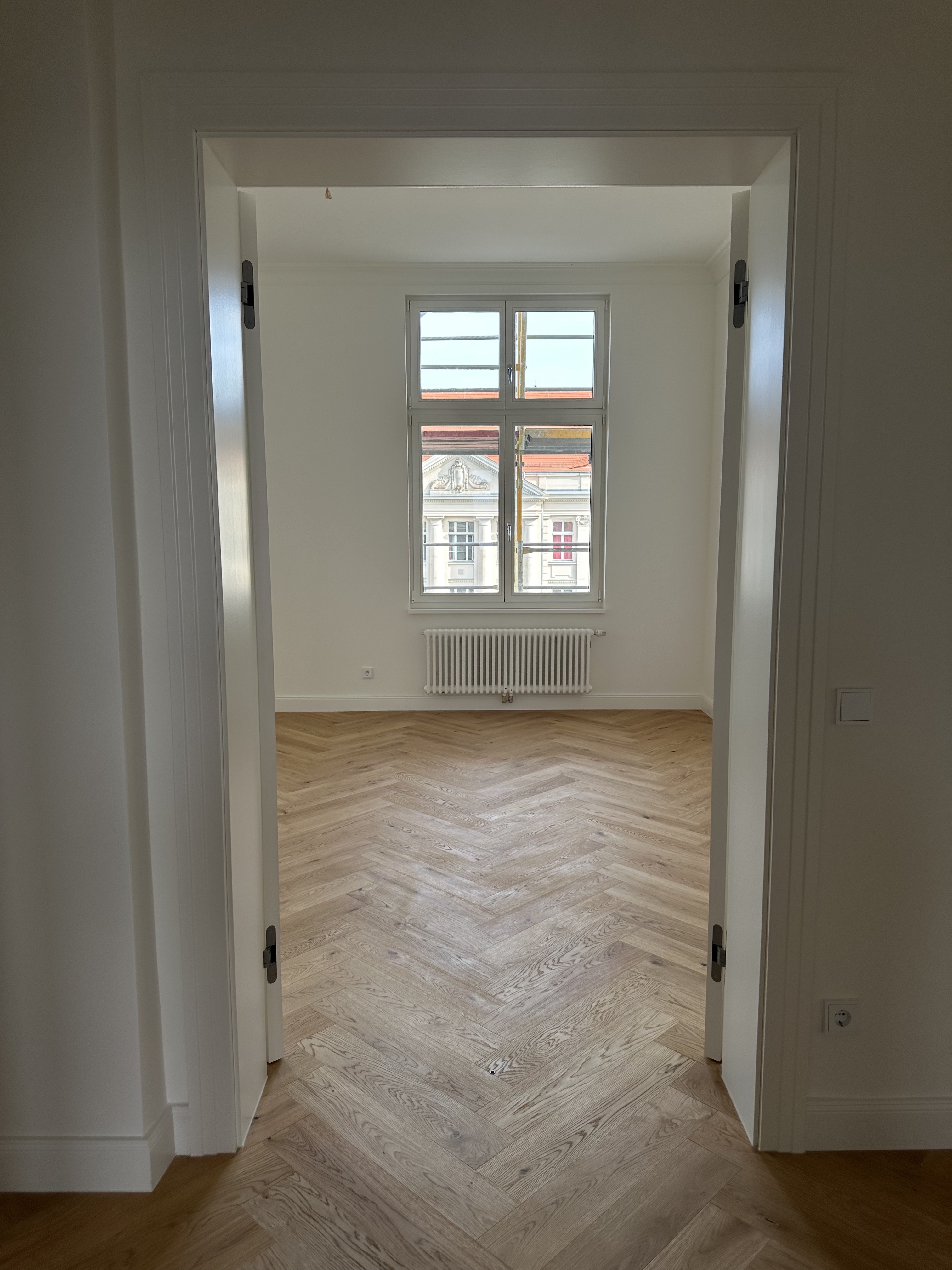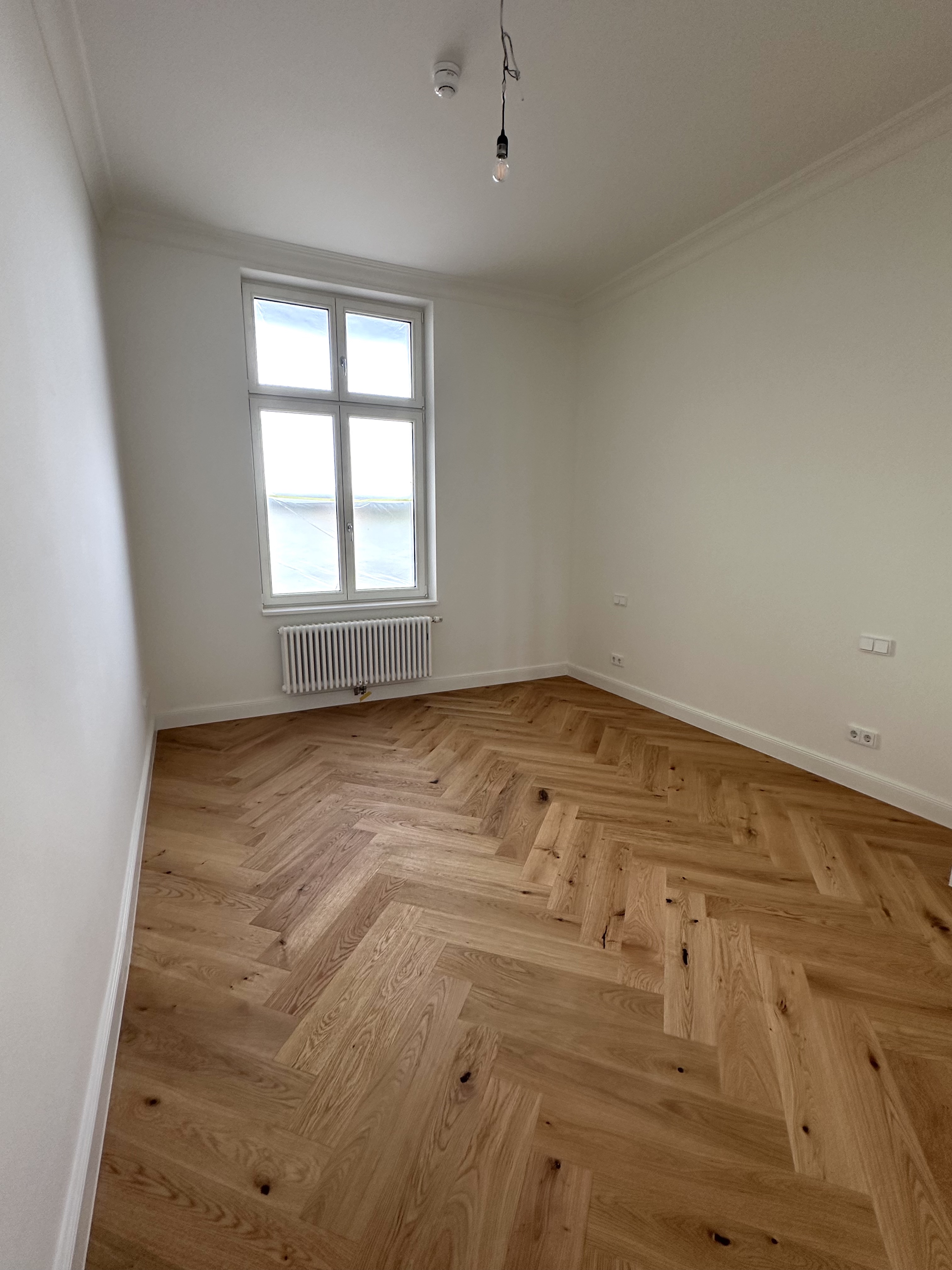 Wenn Sie die Wohnung betreten, gelangen Sie in einen geräumigen Eingangsbereich, welcher genug Platz für einen Schuhschrank und eine Garderobe bietet. Auf den ersten Blick fallen sofort die für Altbau-Wohnungen typischen hohen Decken ins Auge. Vom Flur aus gehen alle weiteren Räume der Wohnung ab. Der gesamte Wohnbereich ist mit hochwertigem Eichenholzparkett in Fischgrätoptik ausgestattet.