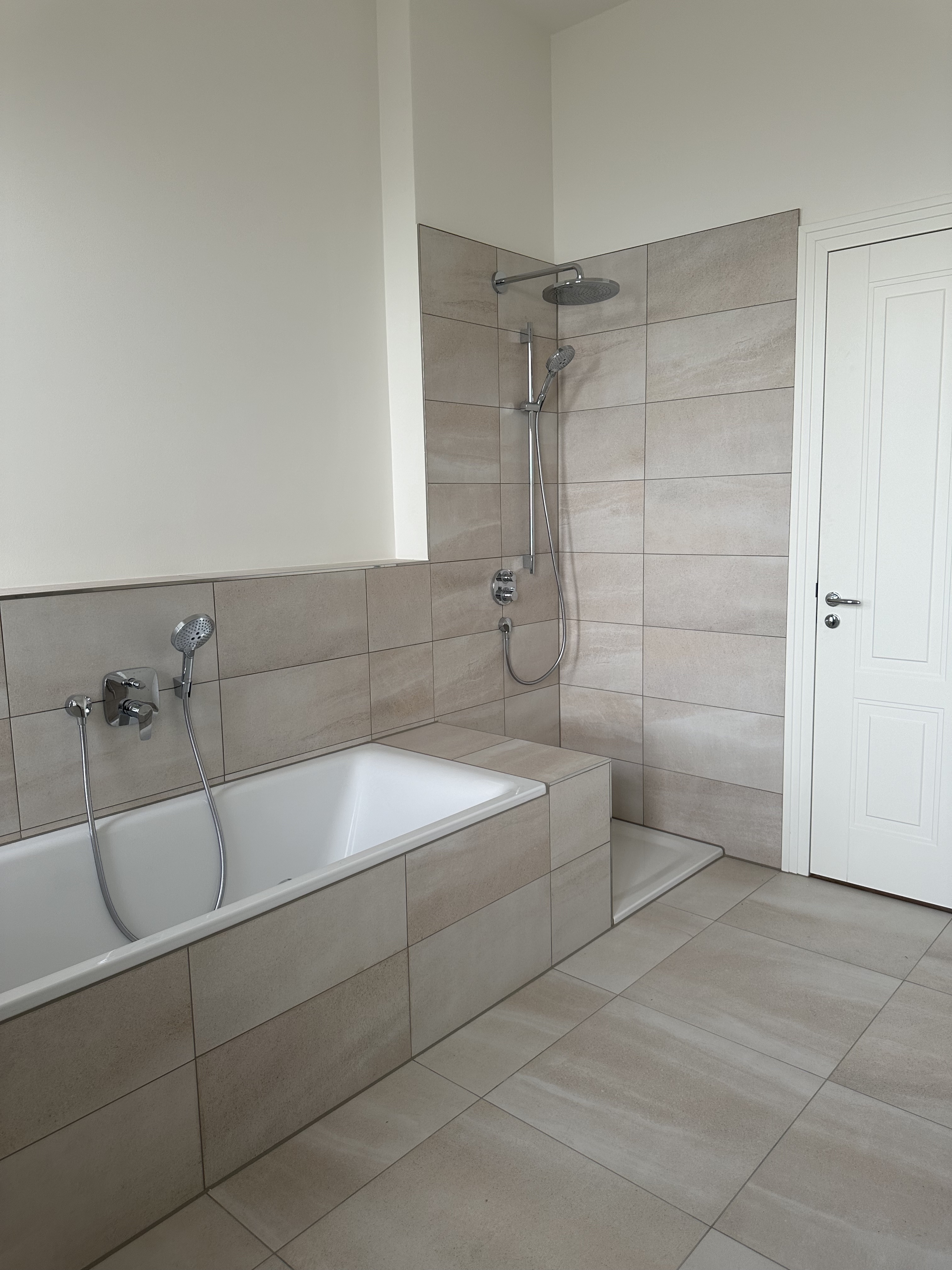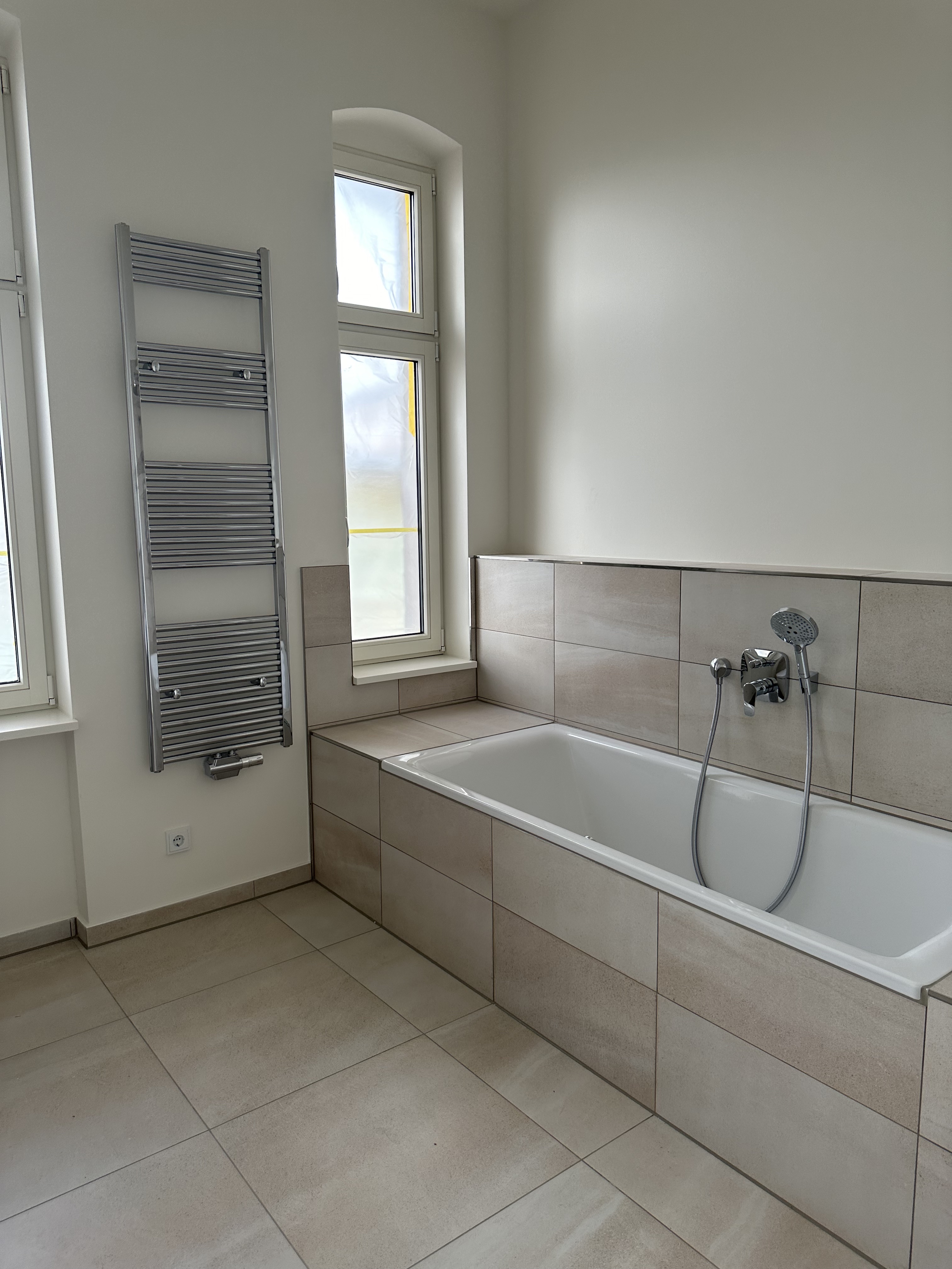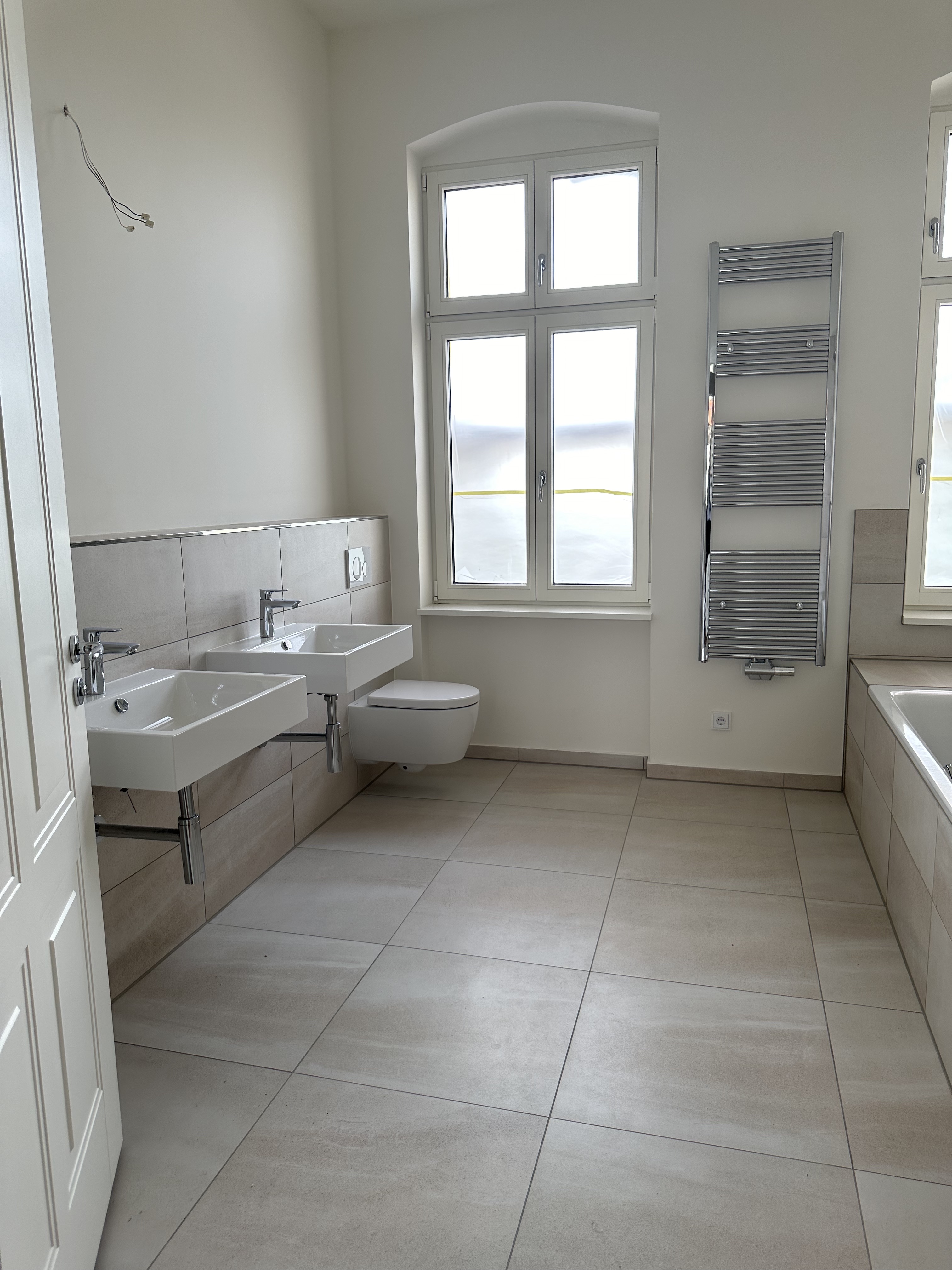 Gleich rechts vom Eingang aus, gelangen Sie in ein großes Badezimmer. Es besitzt neben Badewanne und Dusche auch zwei Waschbecken. Beheizt wird der Raum mit einem Röhrenheizkörper, auf dem jedes Handtuch schnell trocknet. Das Bad ist mit großen modernen Fliesen in Steinoptik halbhoch gefliest und wirkt dadurch sehr wohnlich.