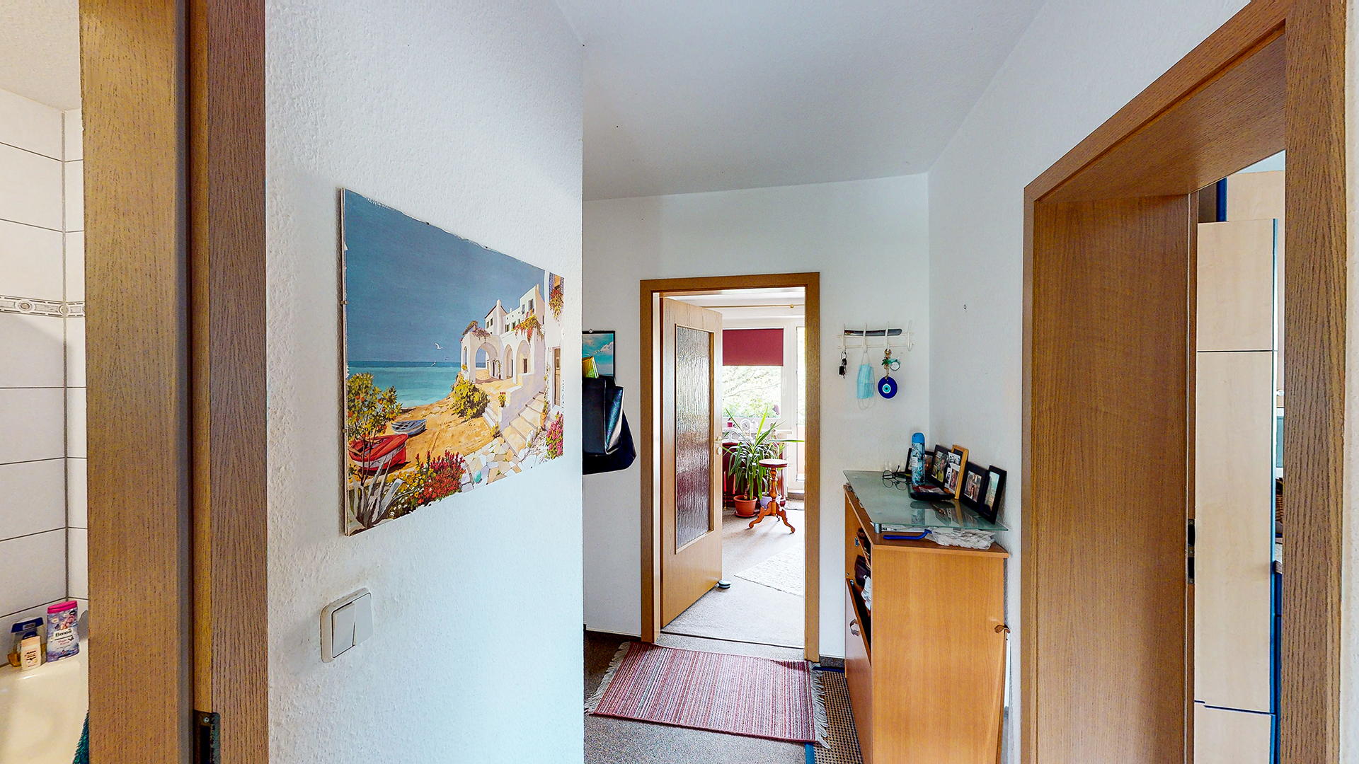 Die Wohnung verfügt über ein großes Wohnzimmer, zwei Schlafzimmer, ein Bad mit Badewanne und Waschmaschinenstellplatz, eine Küche und einen Balkon. Ein Kellerabteil sowie ein Stellplatz gehören ebenfalls zur Wohnung.