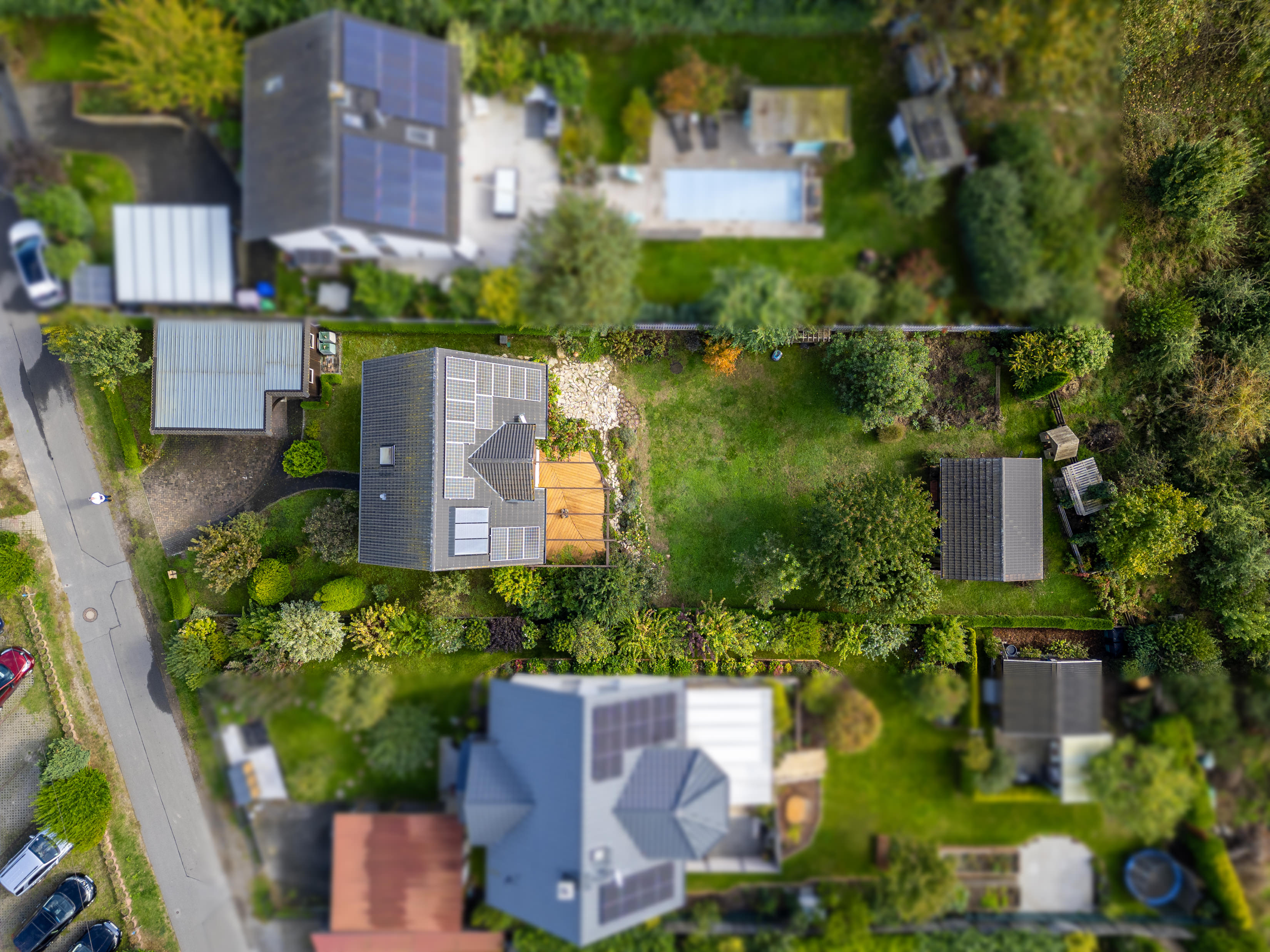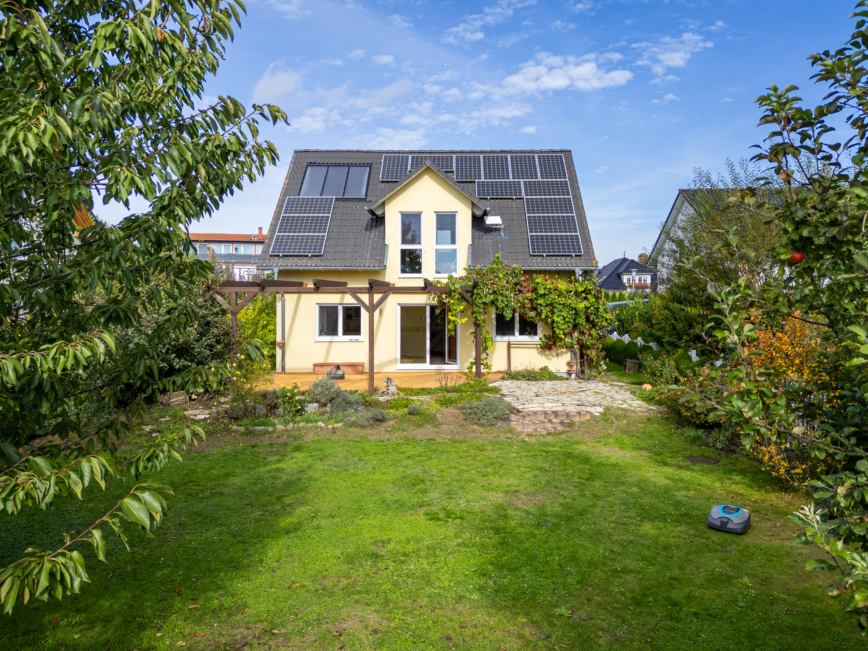 Der gepflegte Garten lässt keine Wünsche offen: Zahlreiche Bäume, Beerensträucher und ein Bereich für Kartoffeln, Tomaten und andere Gemüsesorten bieten Hobbygärtnern ein kleines Paradies. Ein Brunnen mit Pumpe und ein Gartenwasserzähler ermöglichen eine kostensparende Bewässerung des Gartens. Die automatische Bewässerung mit App-Steuerung erleichtert den Alltag. Der Rasen wird bequem vom Rasenmähroboter gepflegt.