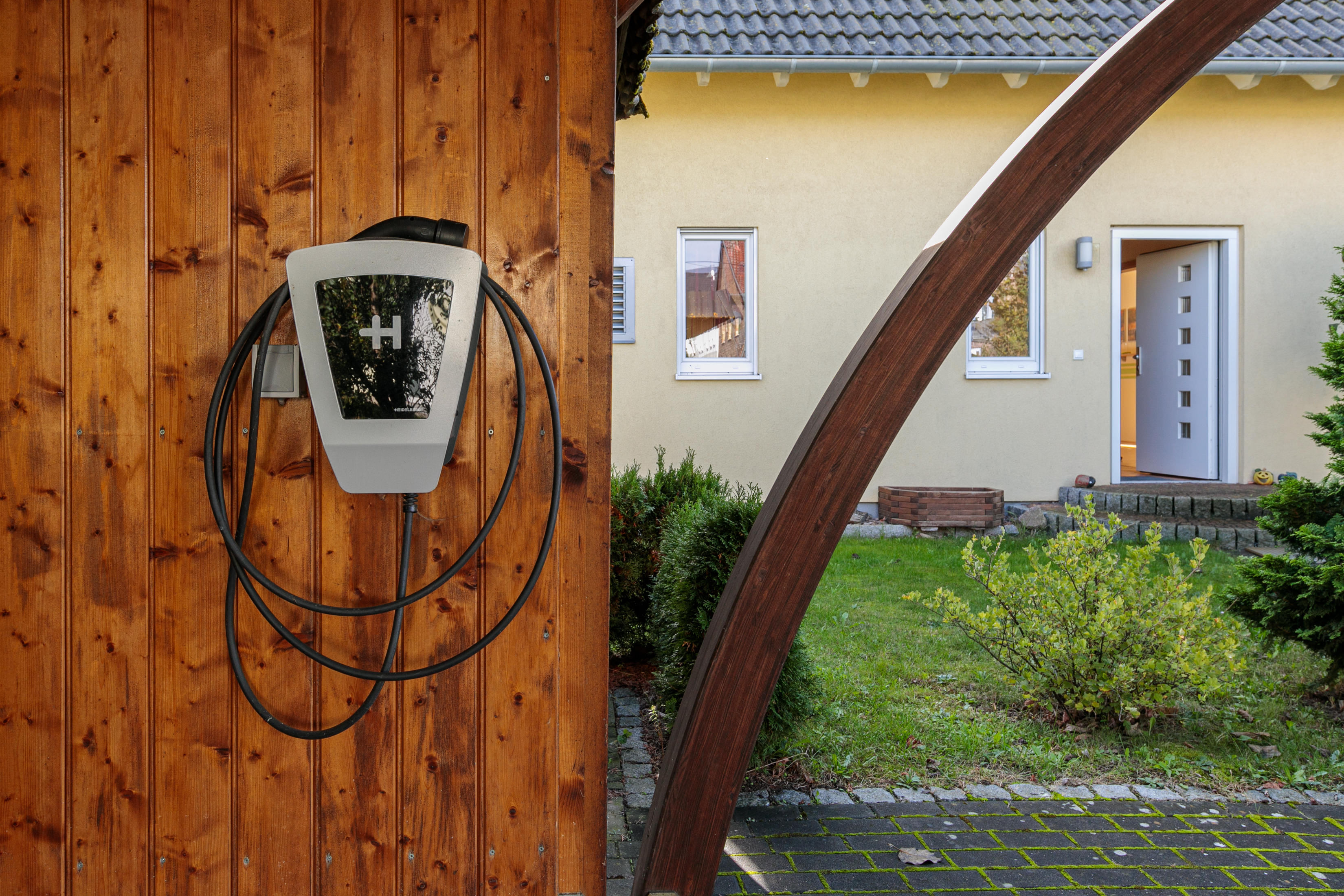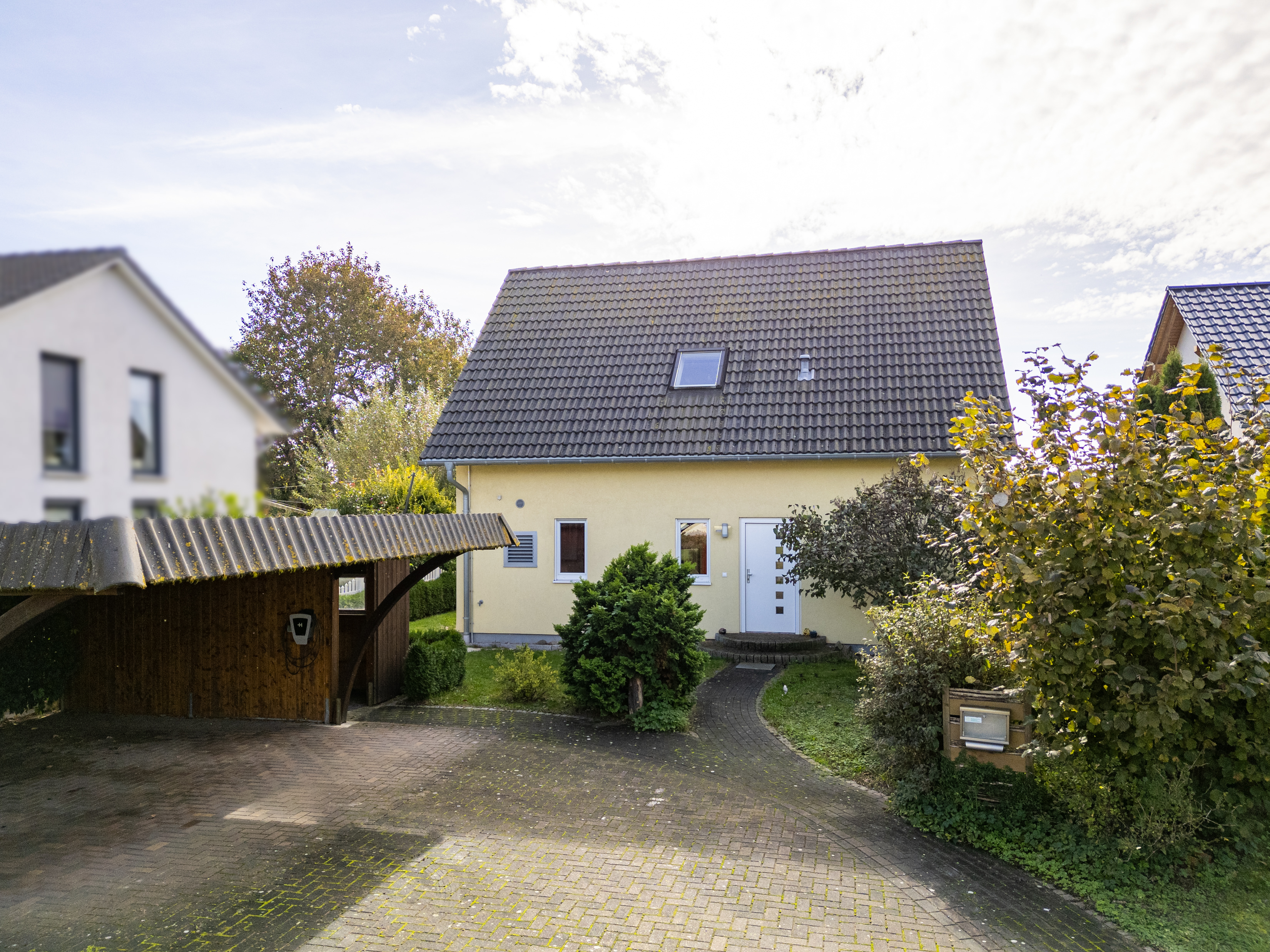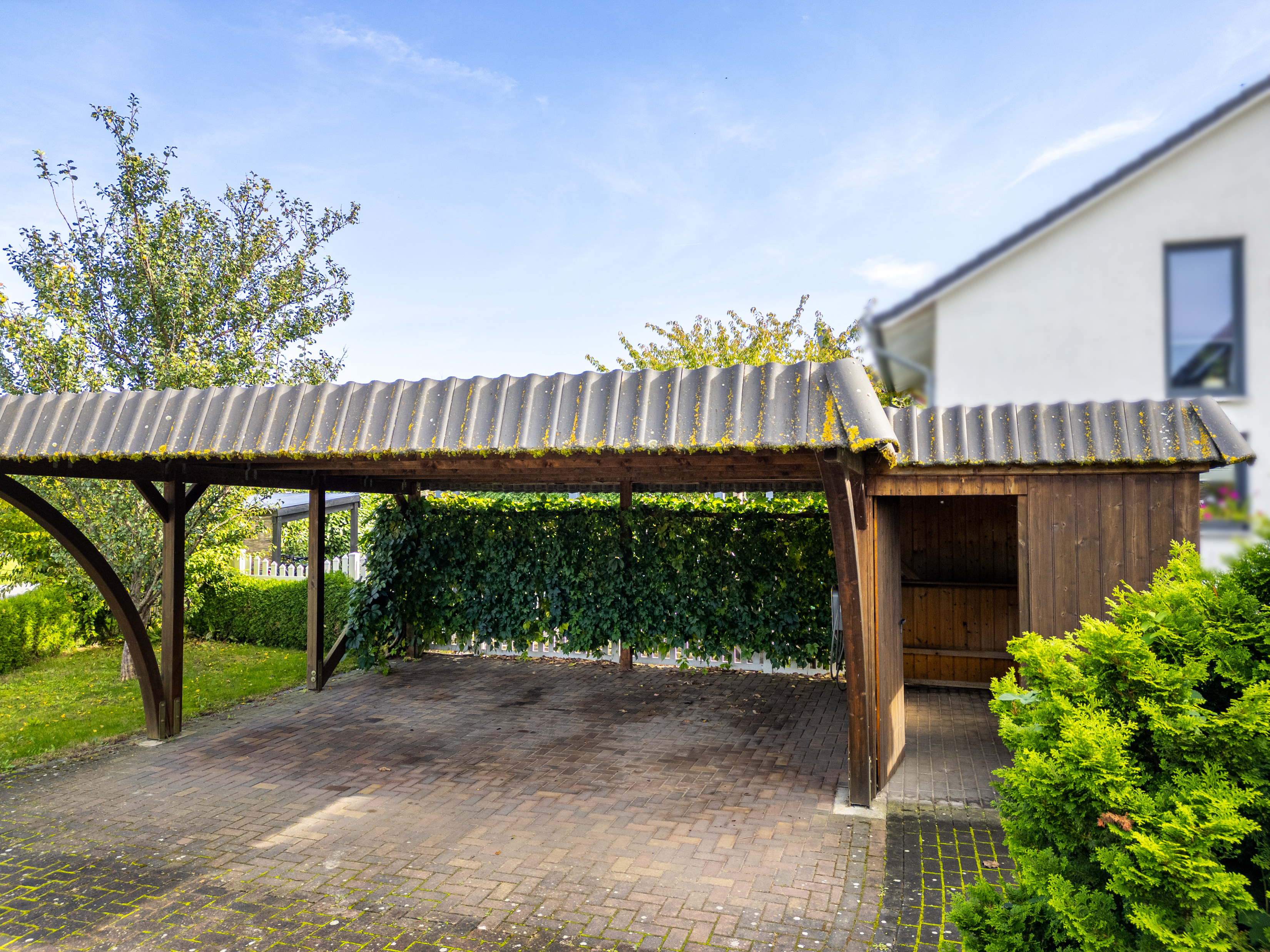 Das große Doppelcarport vor dem Haus verfügt über einen Anbau, in dem Fahrräder oder eine kleine Werkbank Platz finden, sowie über eine Wallbox für E-Autos.