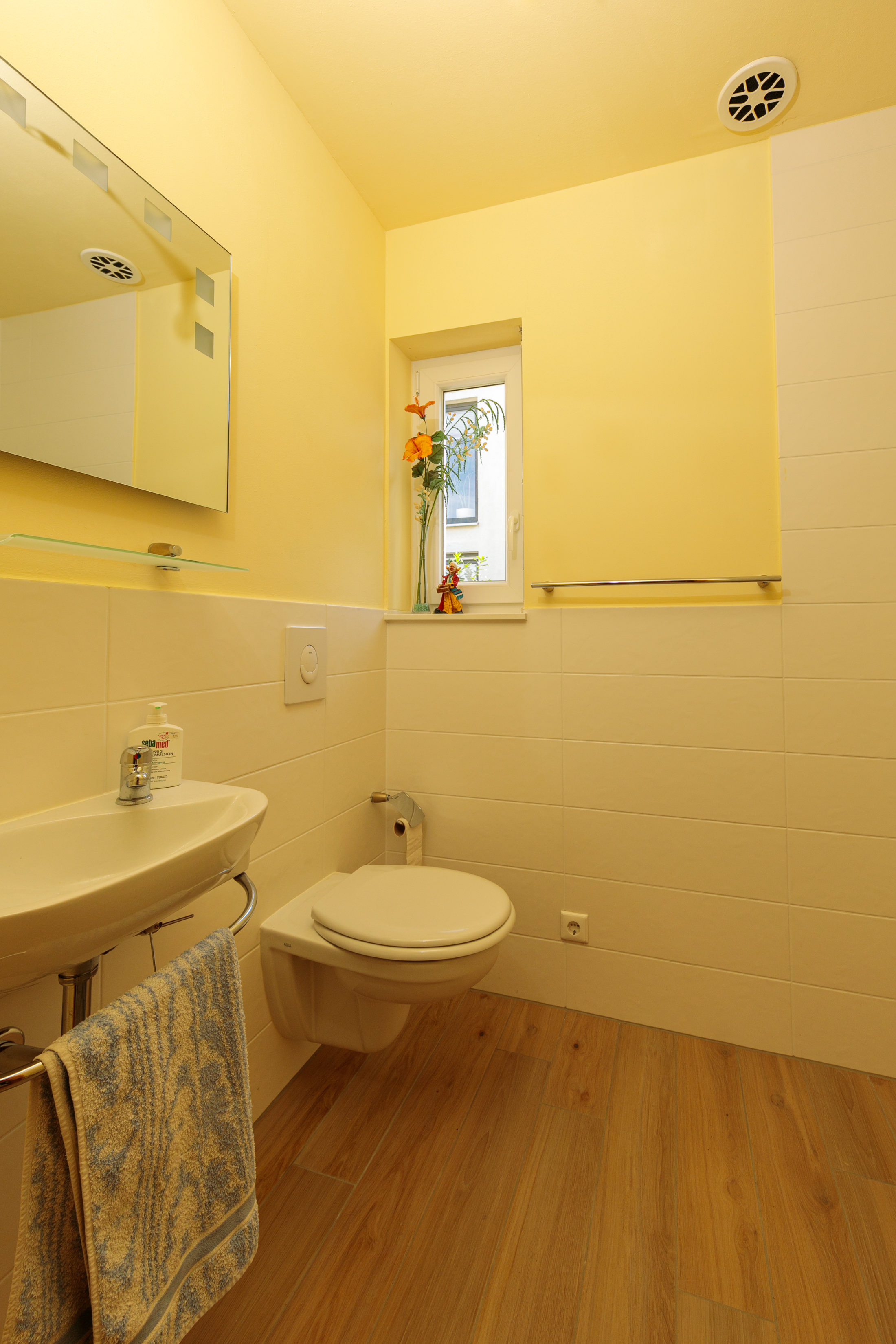 Gleich neben dem Hauswirtschaftsraum liegt das kompakte Gäste-Bad mit Fenster zur Belichtung und Belüftung. Das moderne Ambiente mit Fliesen in Echtholzoptik und hellen großformatigen Wandfliesen schafft eine angenehme Atmosphäre.