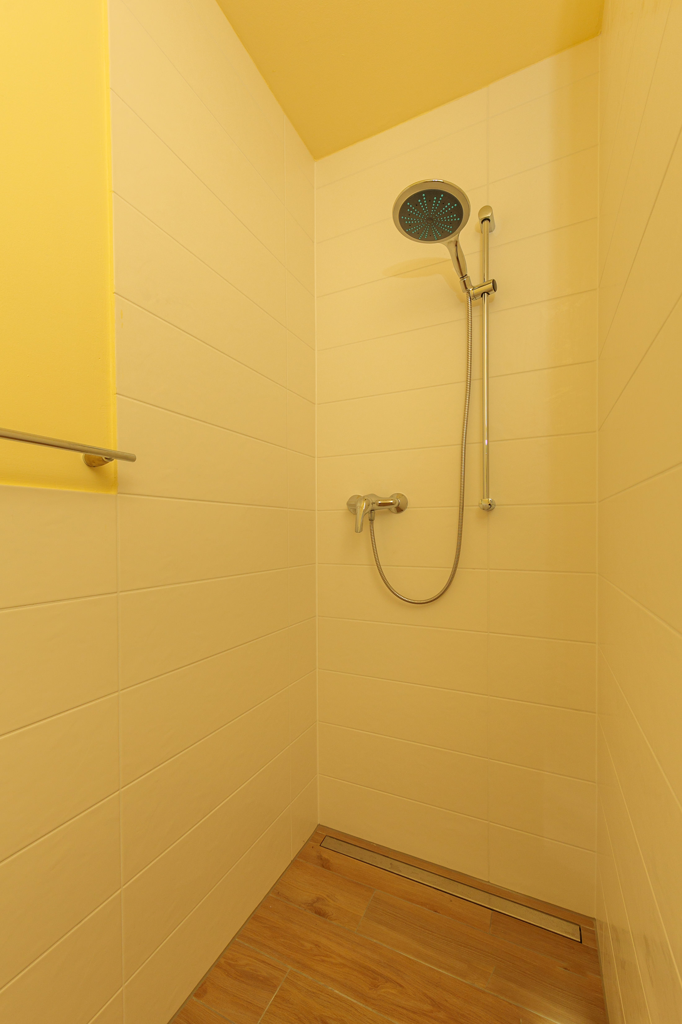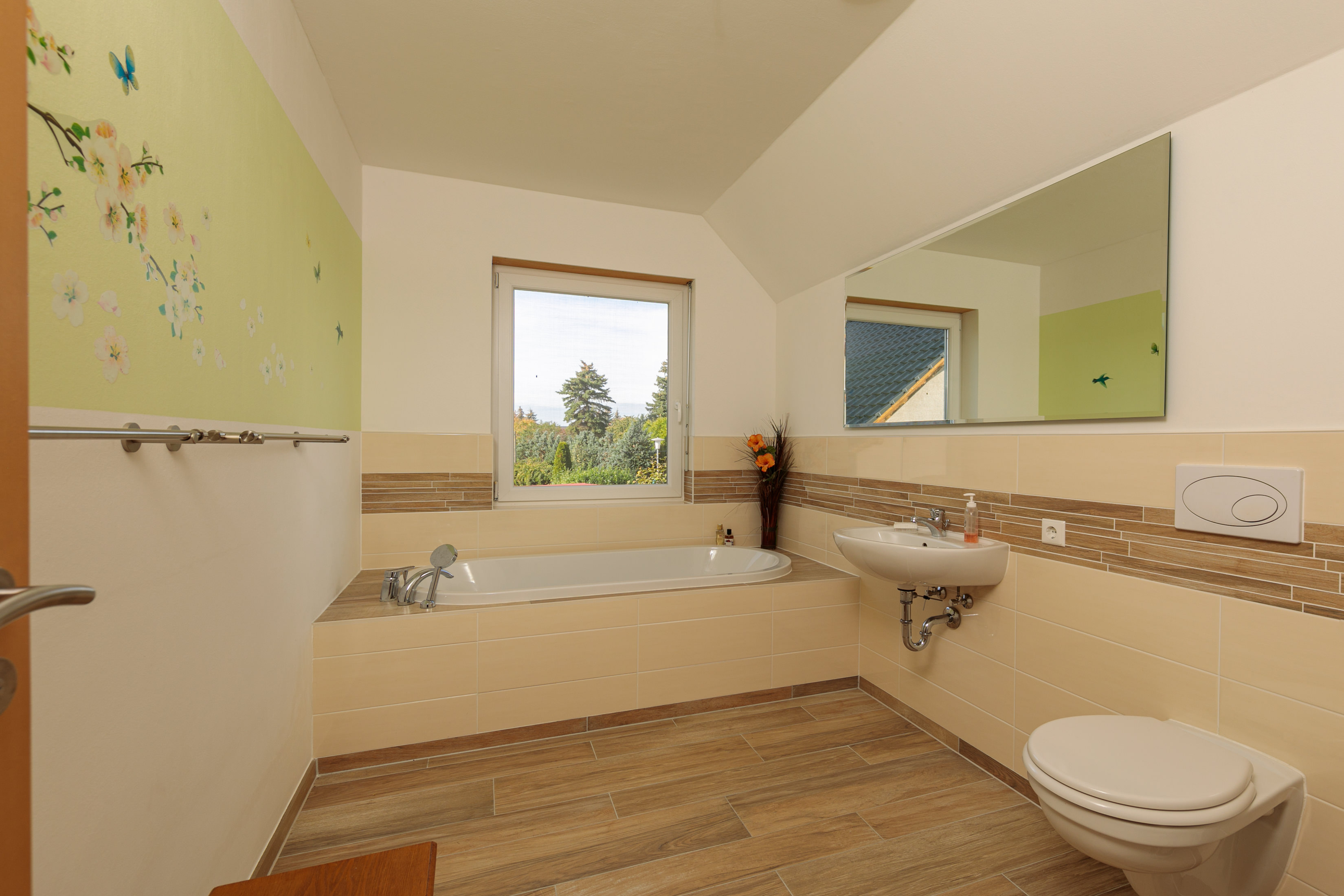 - Fliesen in Holzoptik in Haupt- und Gäste-Bad.