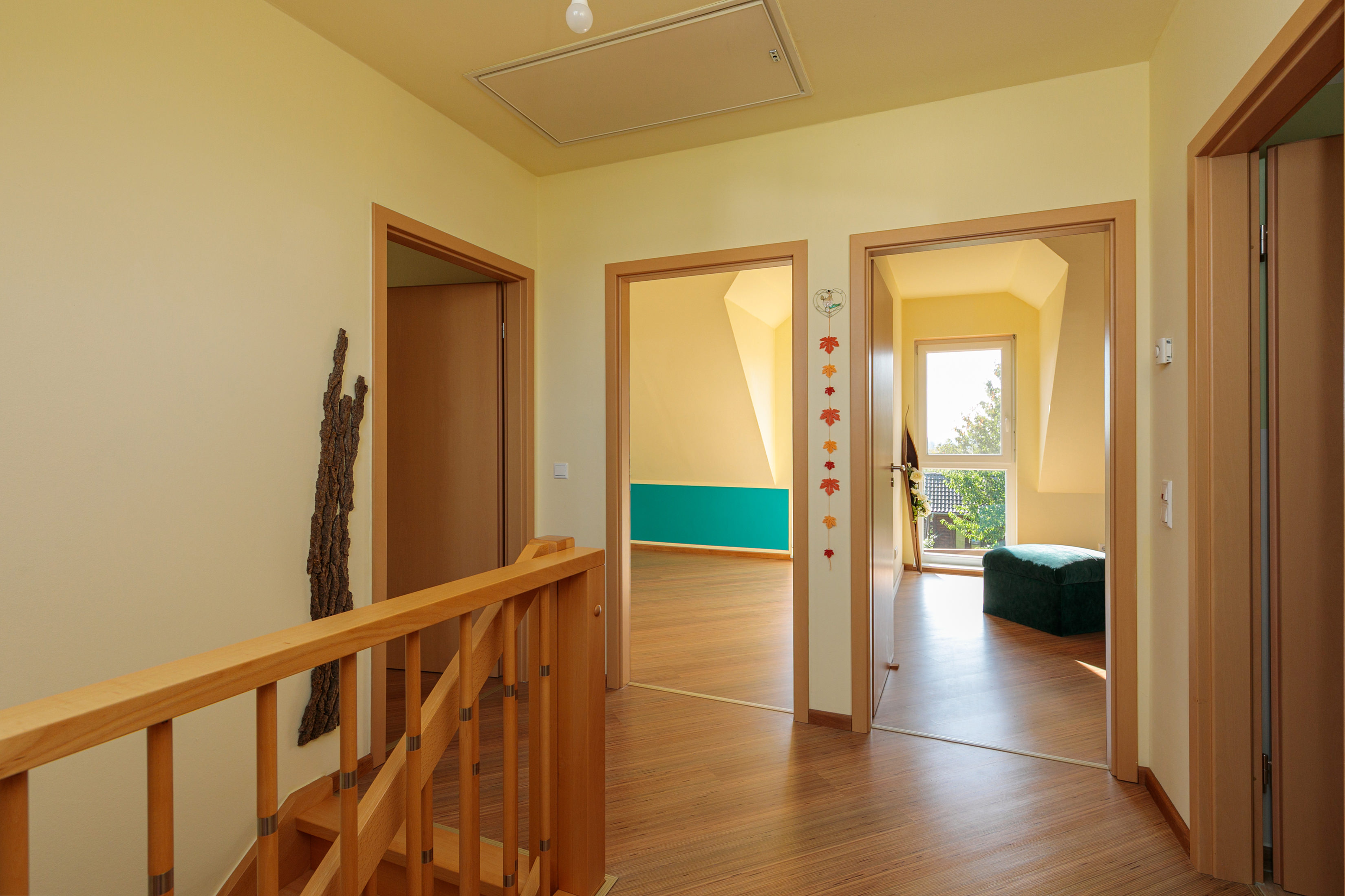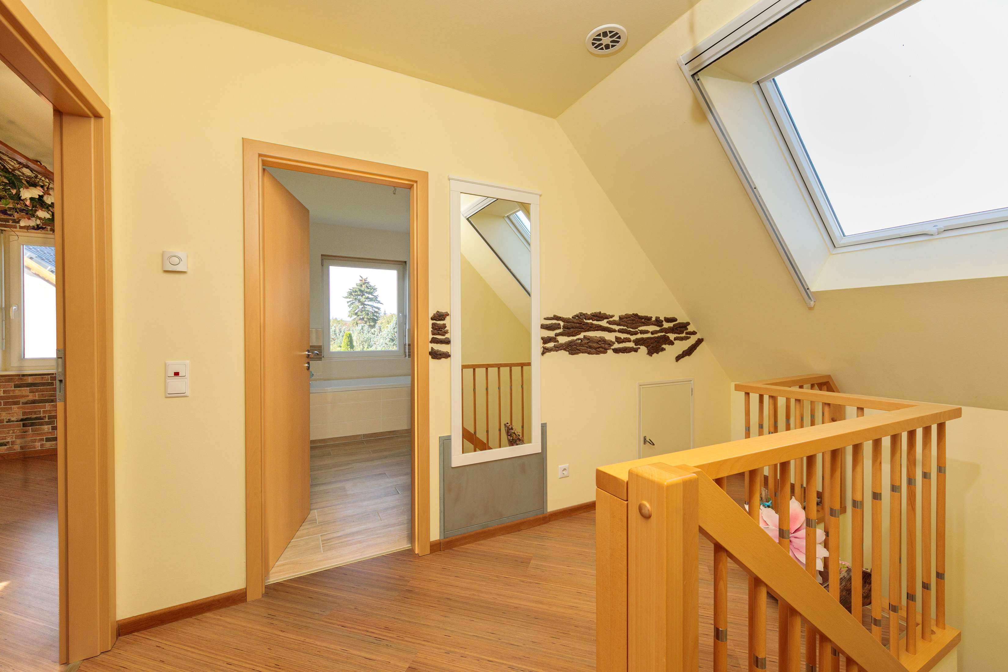 Über eine stilvolle Echtholztreppe gelangen Sie ins Obergeschoss, wo ein geräumiger Flur mit einem großen Dachflächenfenster eine helle und einladende Atmosphäre schafft. Der Flur eignet sich zudem perfekt als kleine Galerie oder Leseecke.
