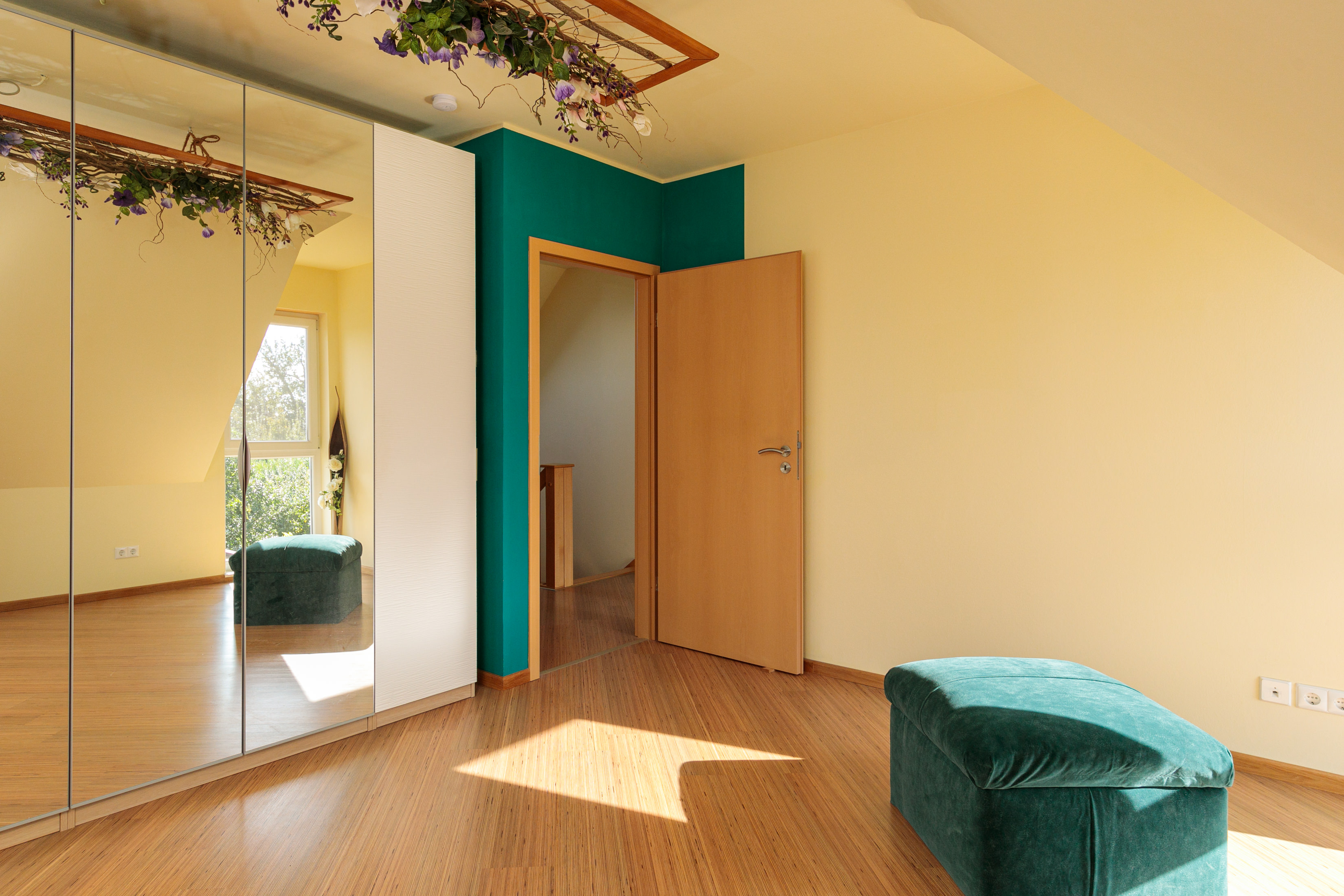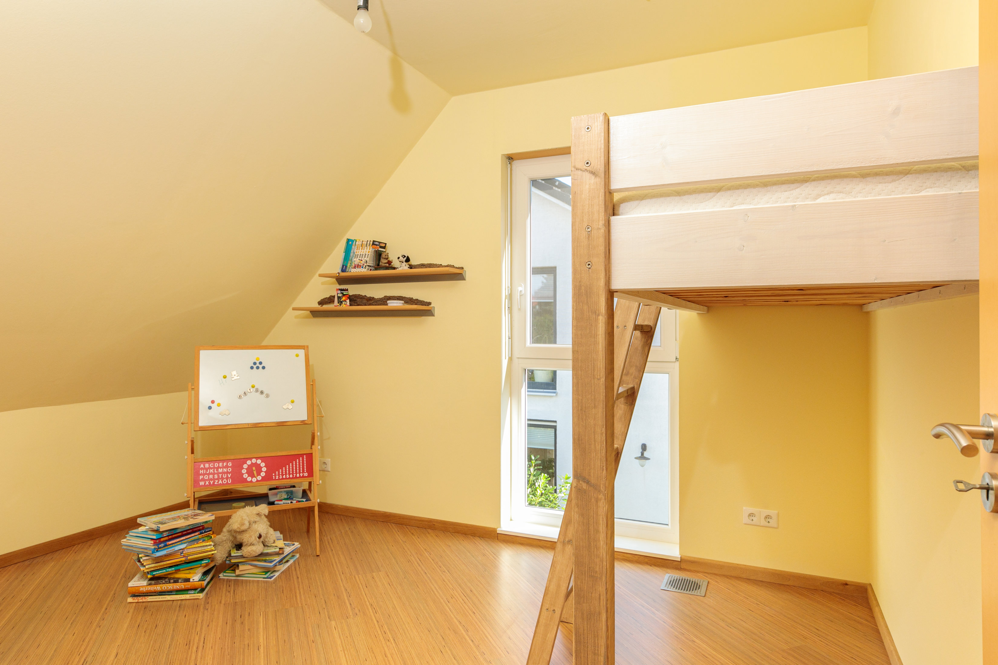 Im Obergeschoss finden Sie zwei gut geschnittene Kinderzimmer, mit bodentiefen Fenstern. Das eine Kinderzimmer hat einen schönen Blick in den Garten und über die Felder.