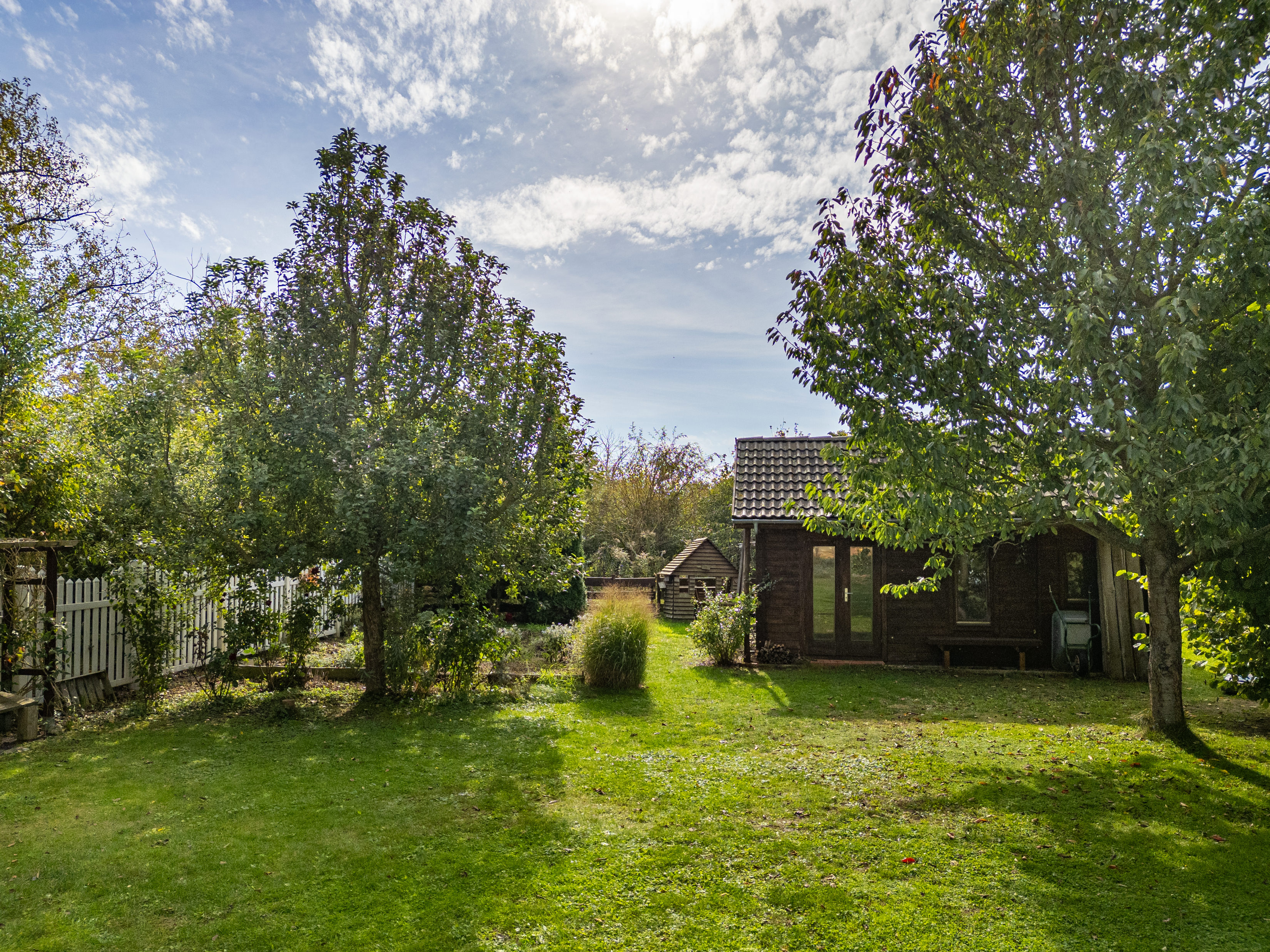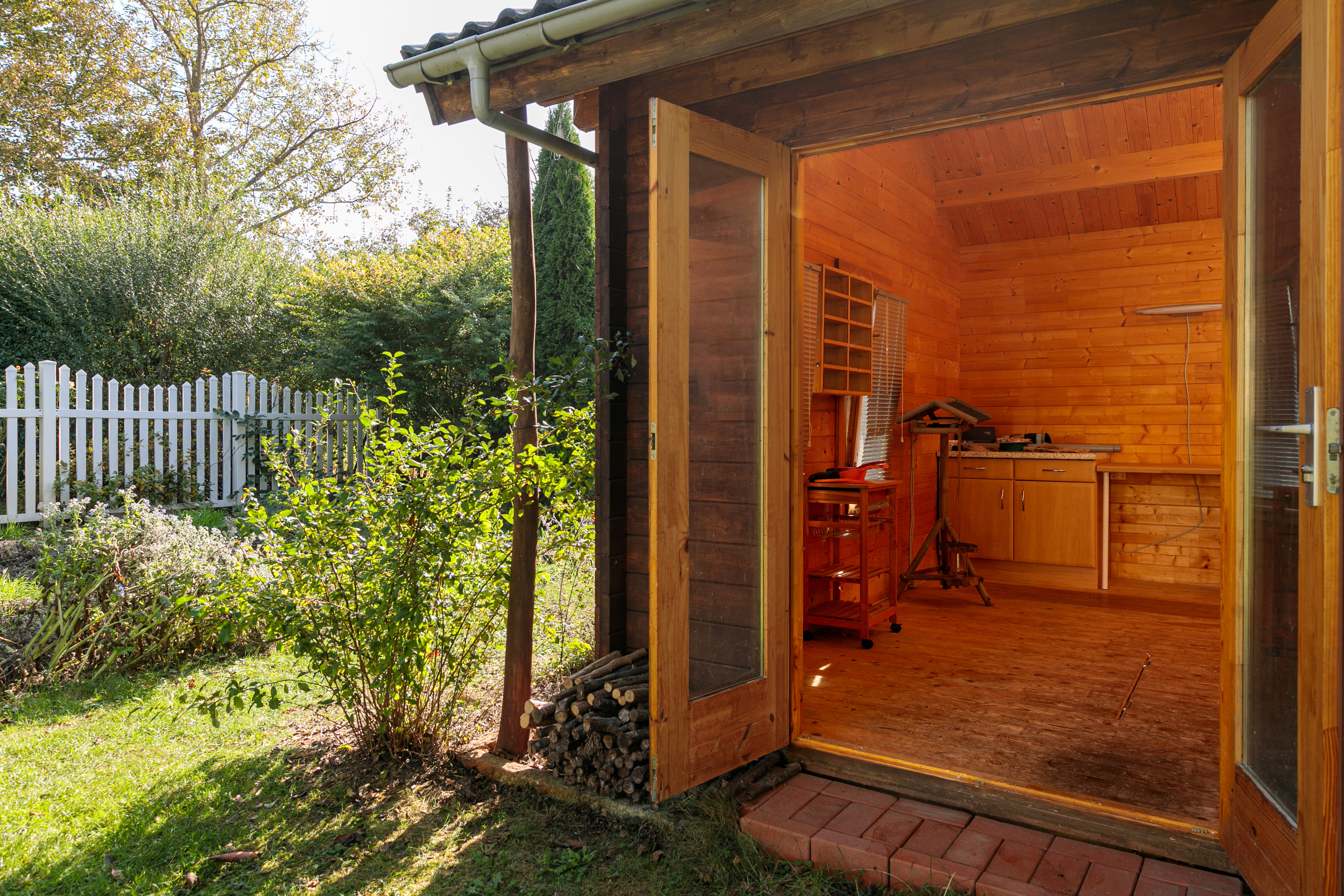 Ein großes Gartenhaus bietet zusätzlich vielseitige Nutzungsmöglichkeiten. Es verfügt über zwei Bereiche: ein großer Raum für Werkstatt, Atelier oder ein Homeoffice der Extraklasse und einem zusätzlichen kleineren Raum für Gartengeräte. Im Gartenhaus befindet sich zudem ein Aufbewahrungskeller für Konserven und Vorräte, und der Oberboden kann als spannendes Abenteuerversteck für Kinder genutzt werden.