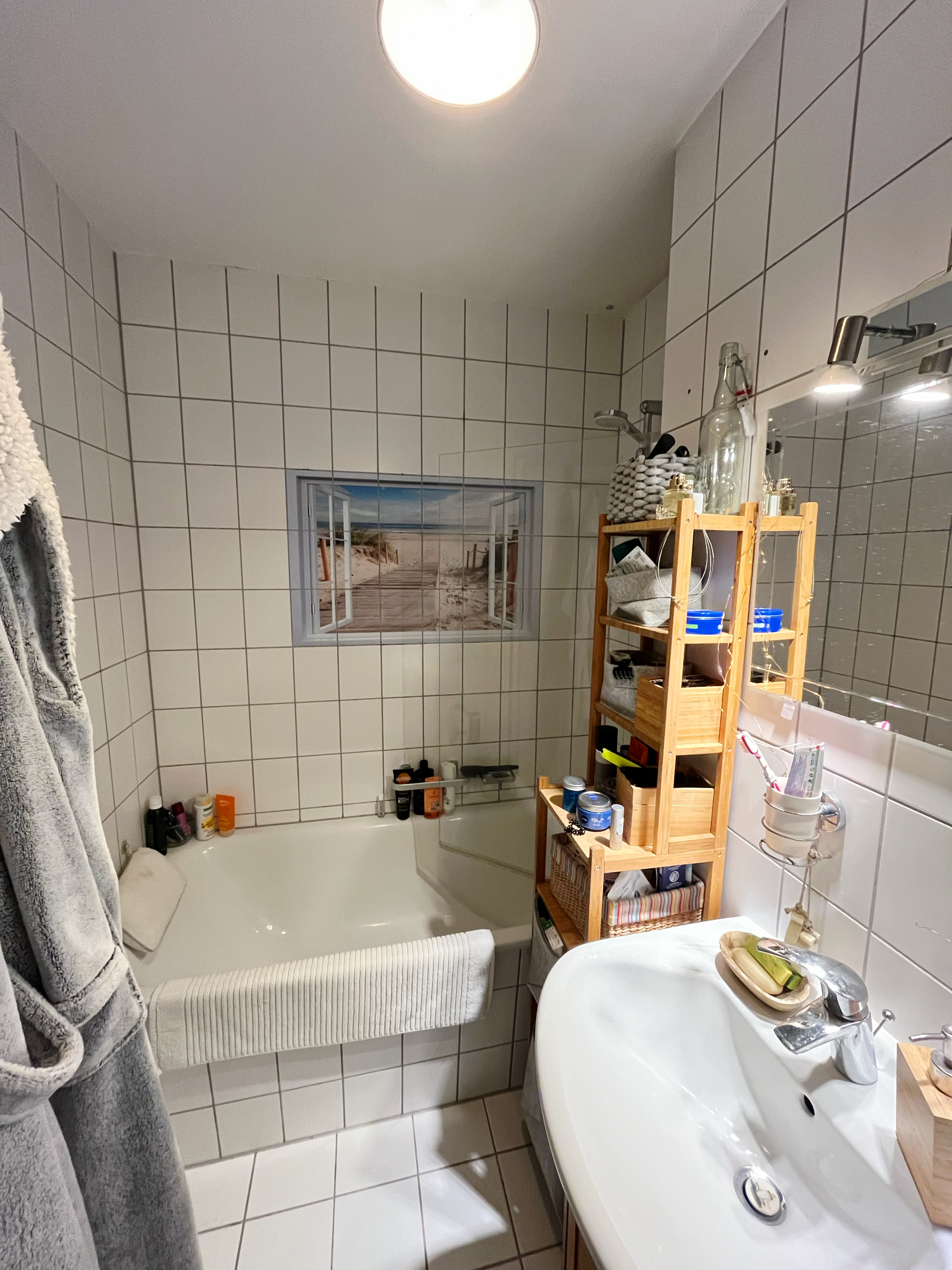 Direkt geradezu befindet sich das Bad mit Tageslicht. Dank des Fensters wird hier für reichlich Licht und die Möglichkeit zur Belüftung gesorgt. Ausgestattet ist das Badezimmer mit einer Badewanne, einem Waschbecken und einem WC. Platz für ein kleines Regal findet sich auch.