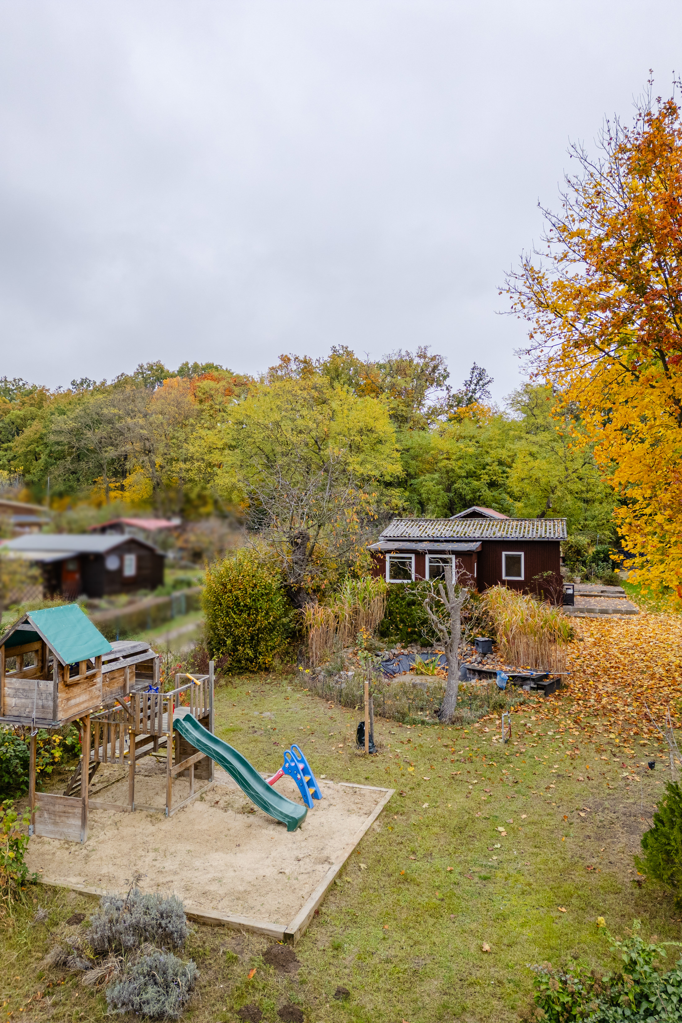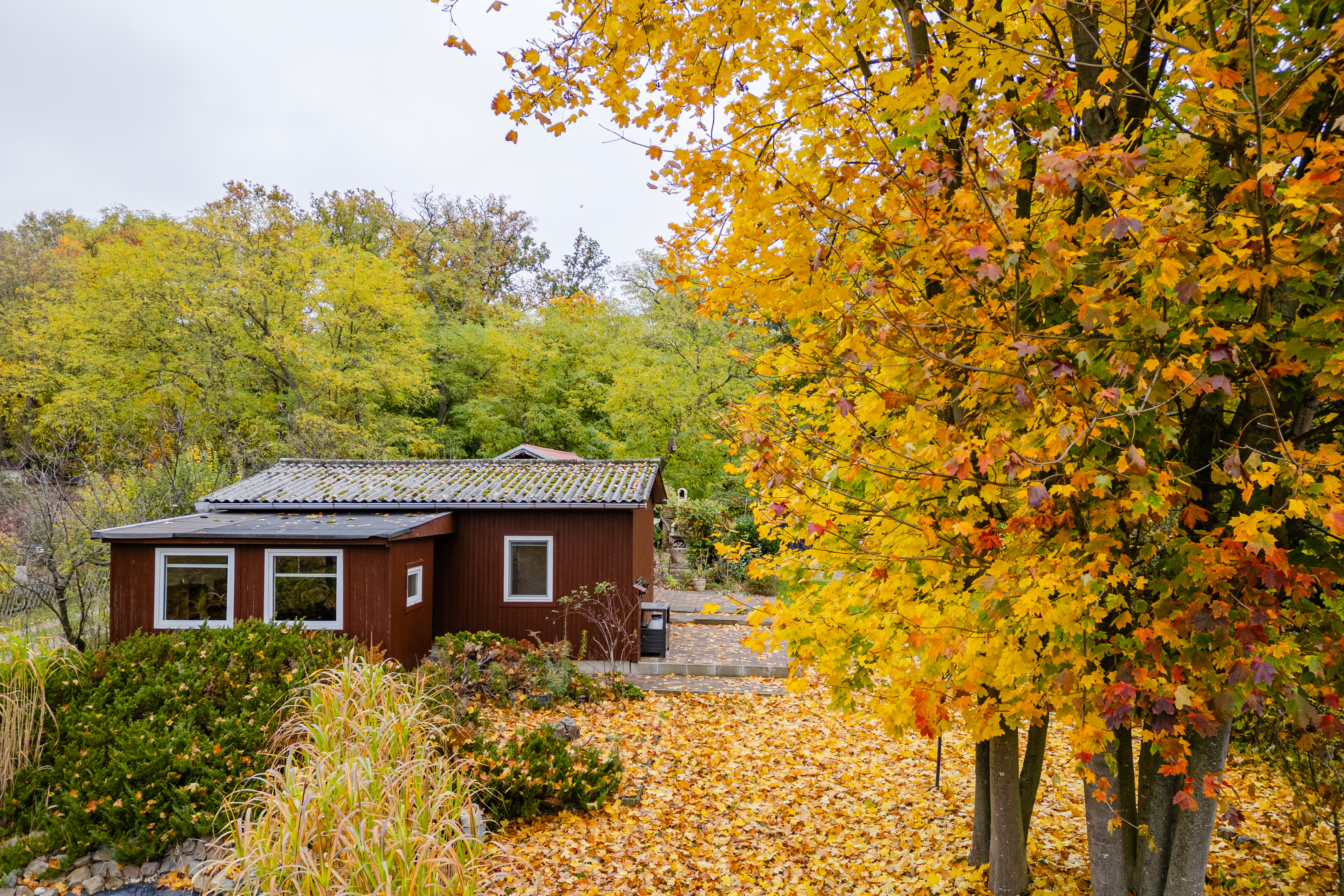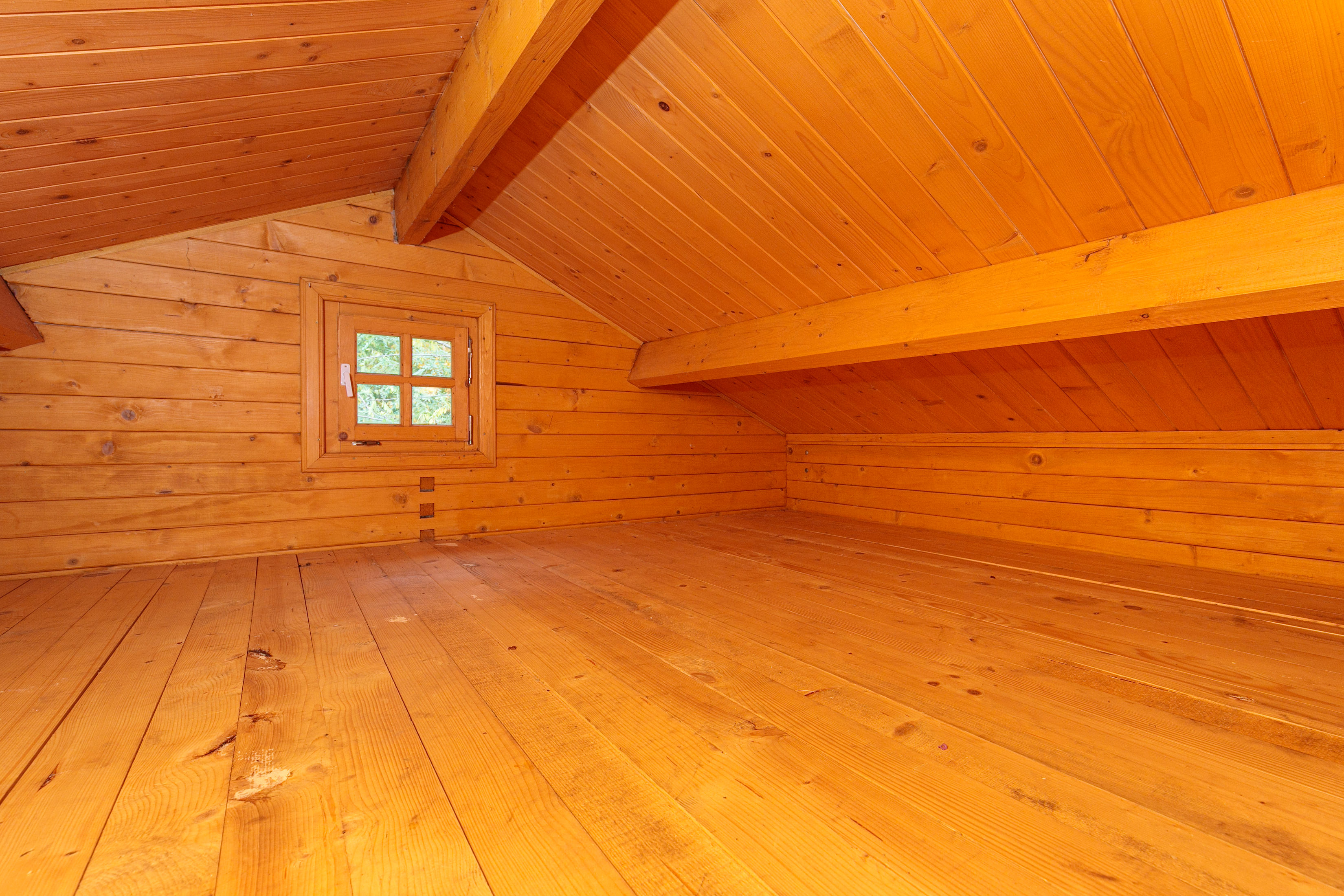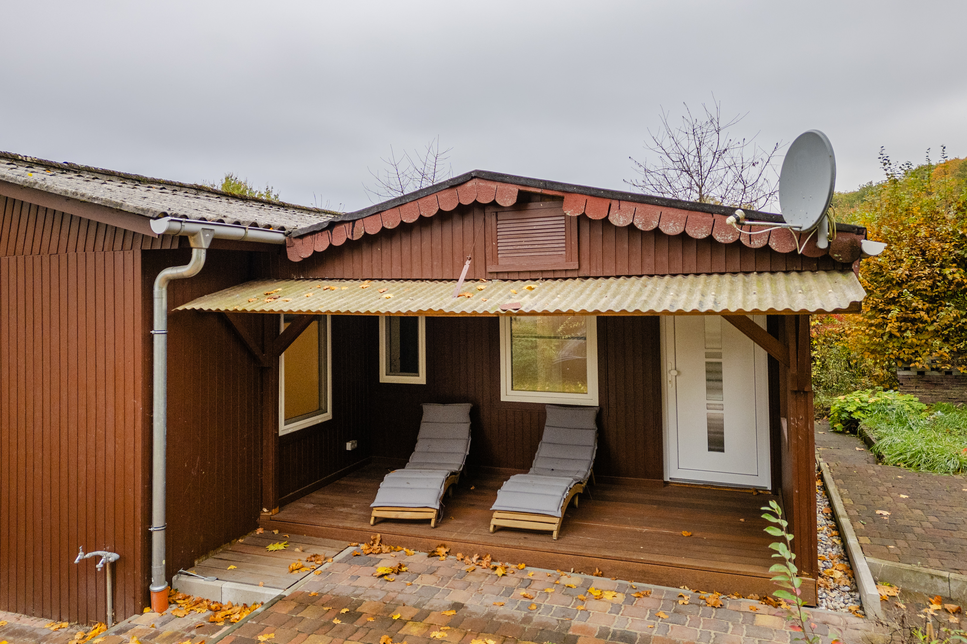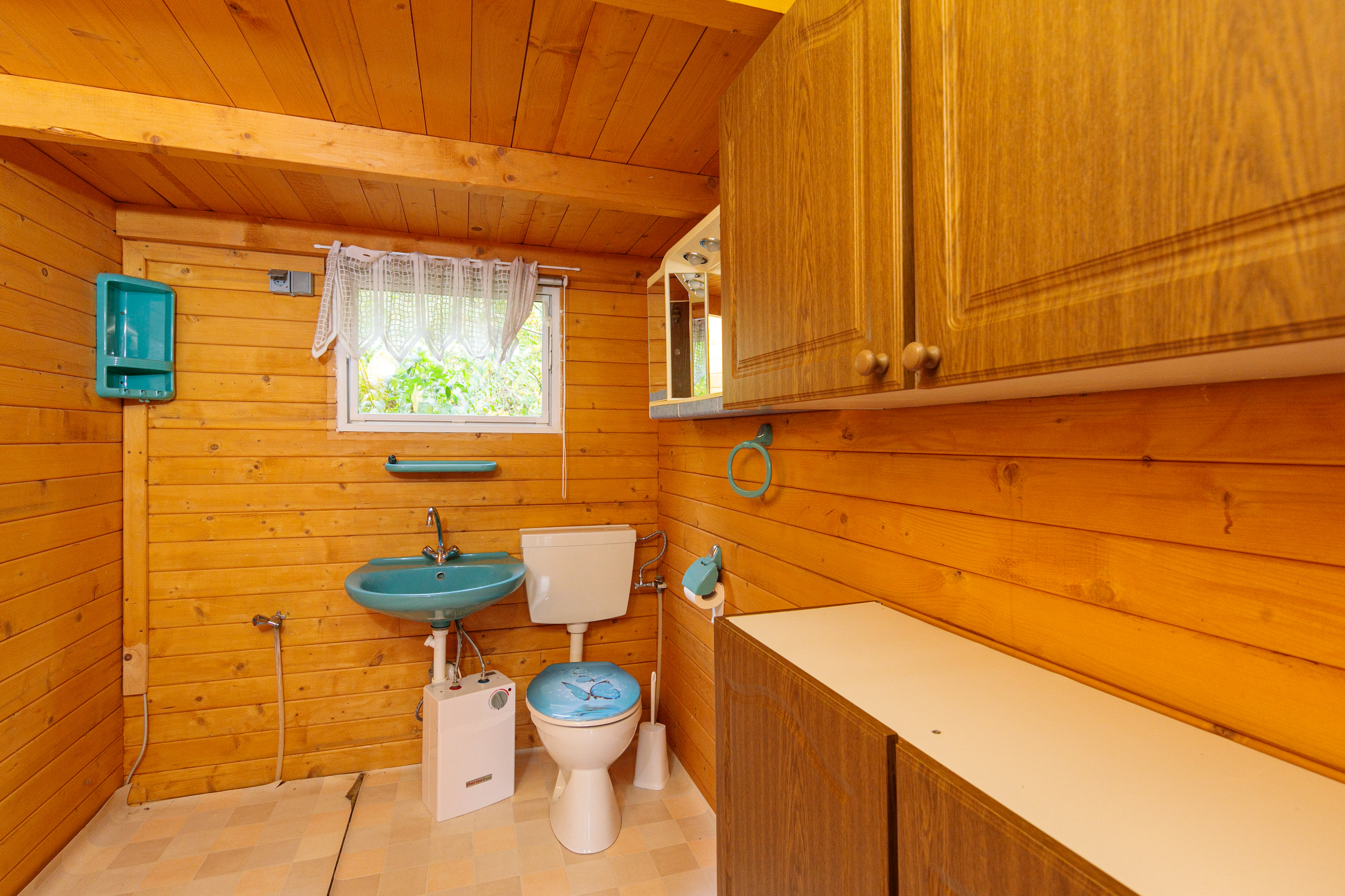 Der erste Wochenendbungalow, der im Jahr 2005 errichtet wurde, ist kompakt und bietet eine Nutzfläche von ca. 32,59 m². Mit seiner charmanten Holzfassade und Holzfenstern eignet er sich perfekt in der wärmeren Jahreszeit als Gästehaus oder für kleinere Familienmitglieder. Der Nutzfläche ist durchdacht aufgeteilt und umfasst neben dem Wohnbereich auch ein kleines Zimmer sowie einen Schlafboden, der zusätzlichen Platz schafft.