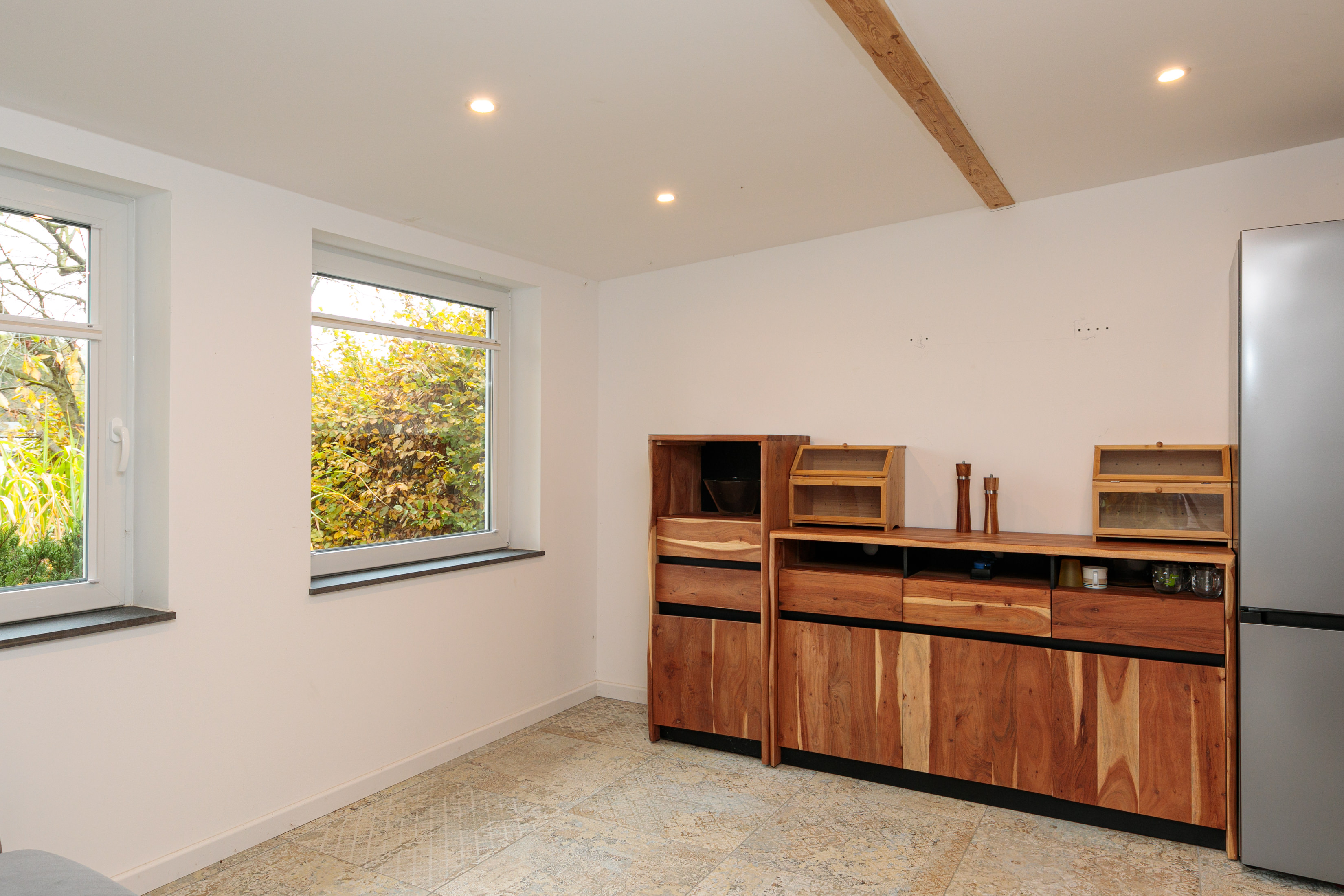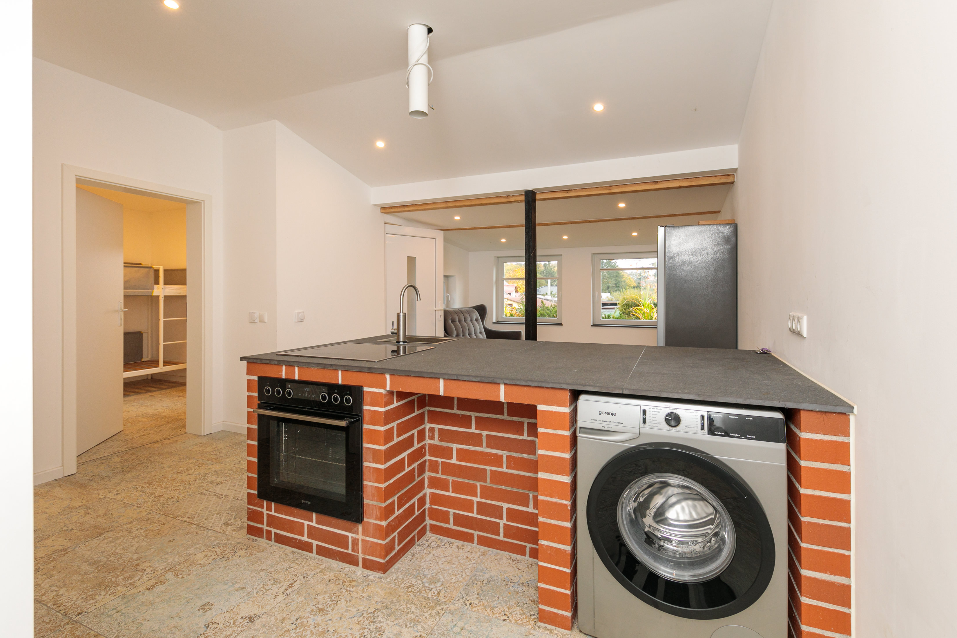 Der großzügige Wohn-Kochbereich besticht durch große Fensterflächen, die einen herrlichen Blick über das leicht abfallende Grundstück bieten und viel Licht hereinlassen. Die integrierte Küchenzeile ist mit einem praktischen Kochtresen ausgestattet und bietet ein Spülbecken aus Edelstahl, ein Ceranfeld sowie einen Backofen. Ein Waschmaschinenanschluss und eine Waschmaschine sind ebenfalls vorhanden. Ein moderner Warmwasserbereiter ist zentral zwischen dem Wohn-Essbereich und dem Schlafzimmer untergebracht.