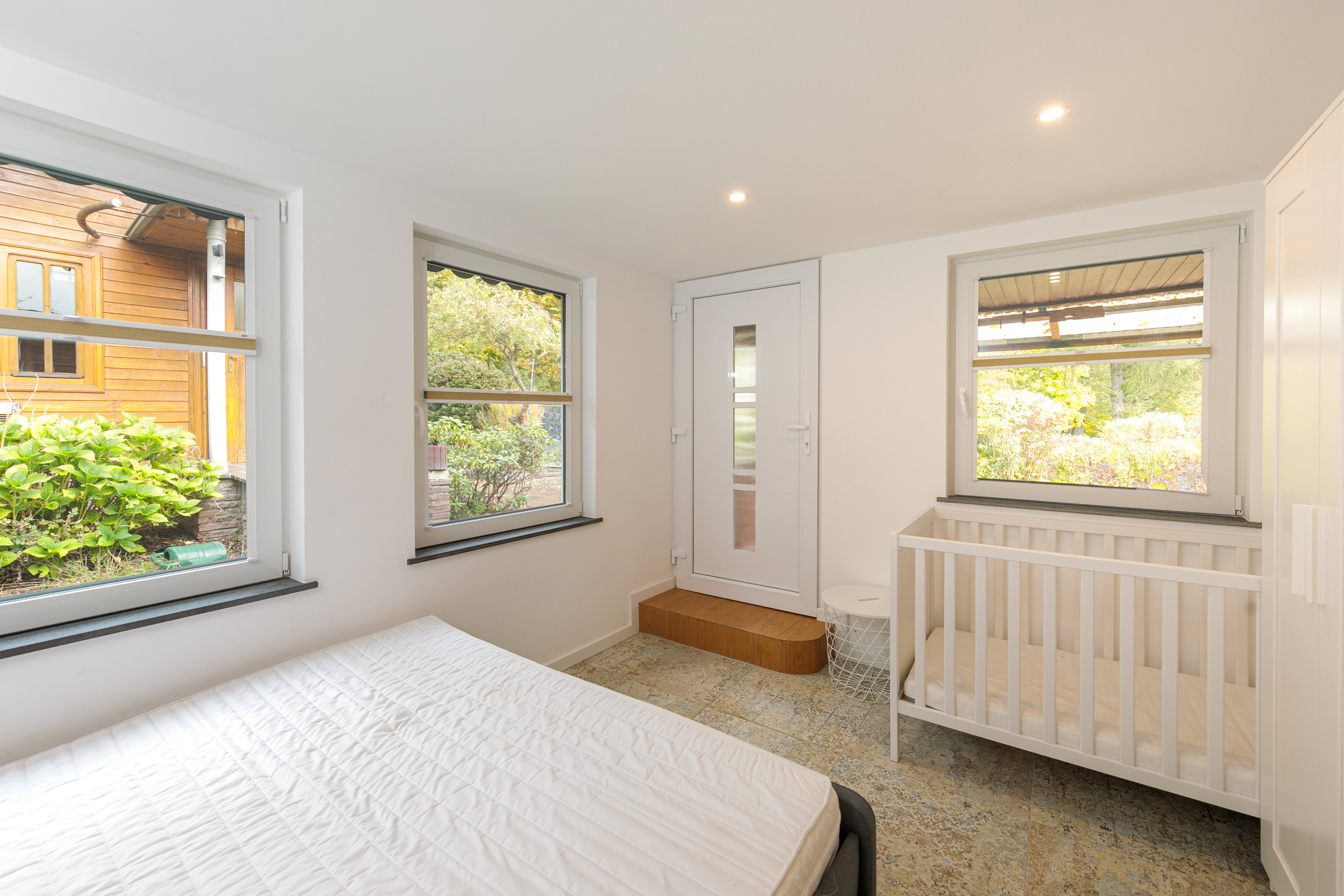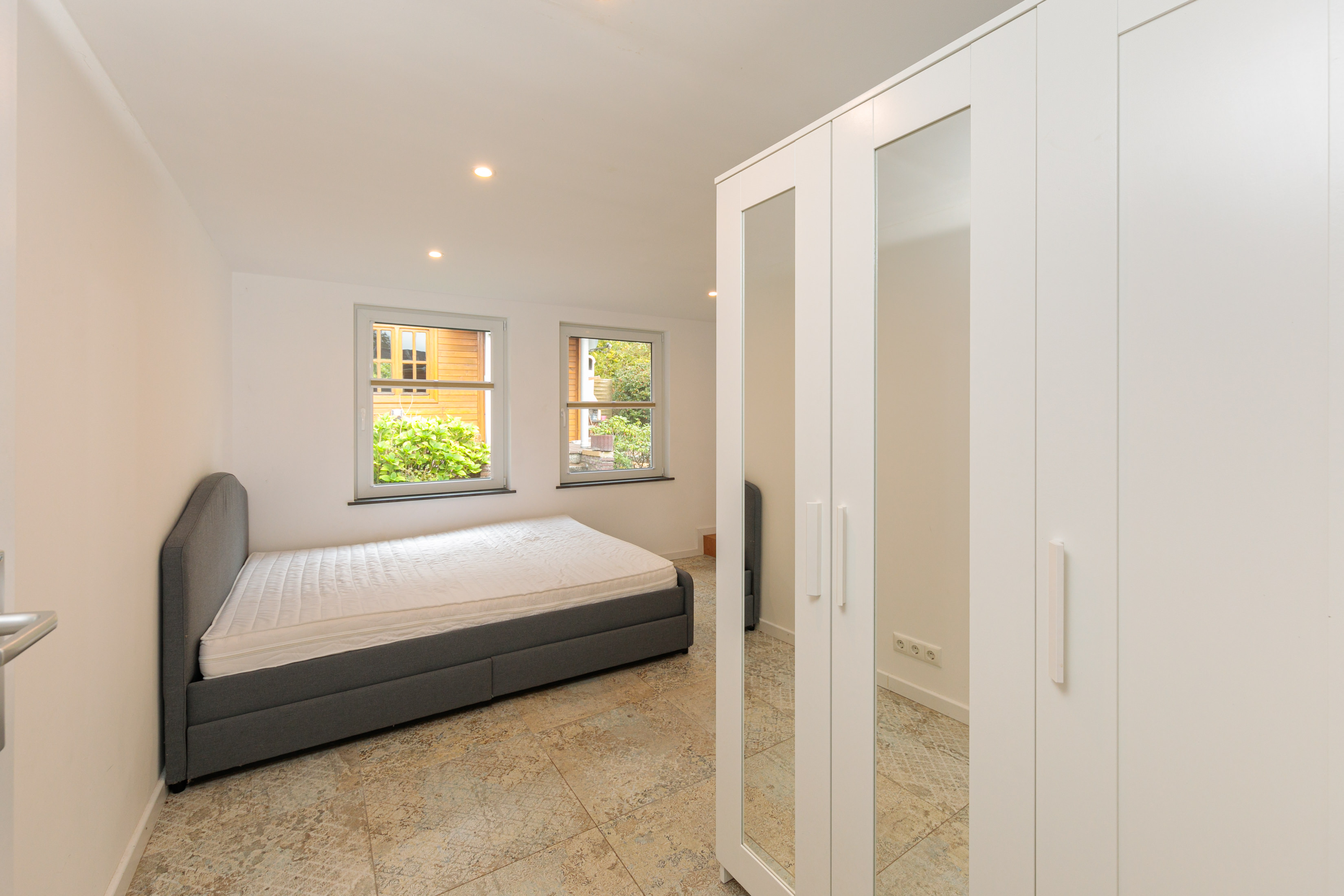 Das Schlafzimmer verfügt über einen separaten Ausgang zu einer kleinen Terrasse und bietet genügend Platz für ein großes Bett sowie Schränke.