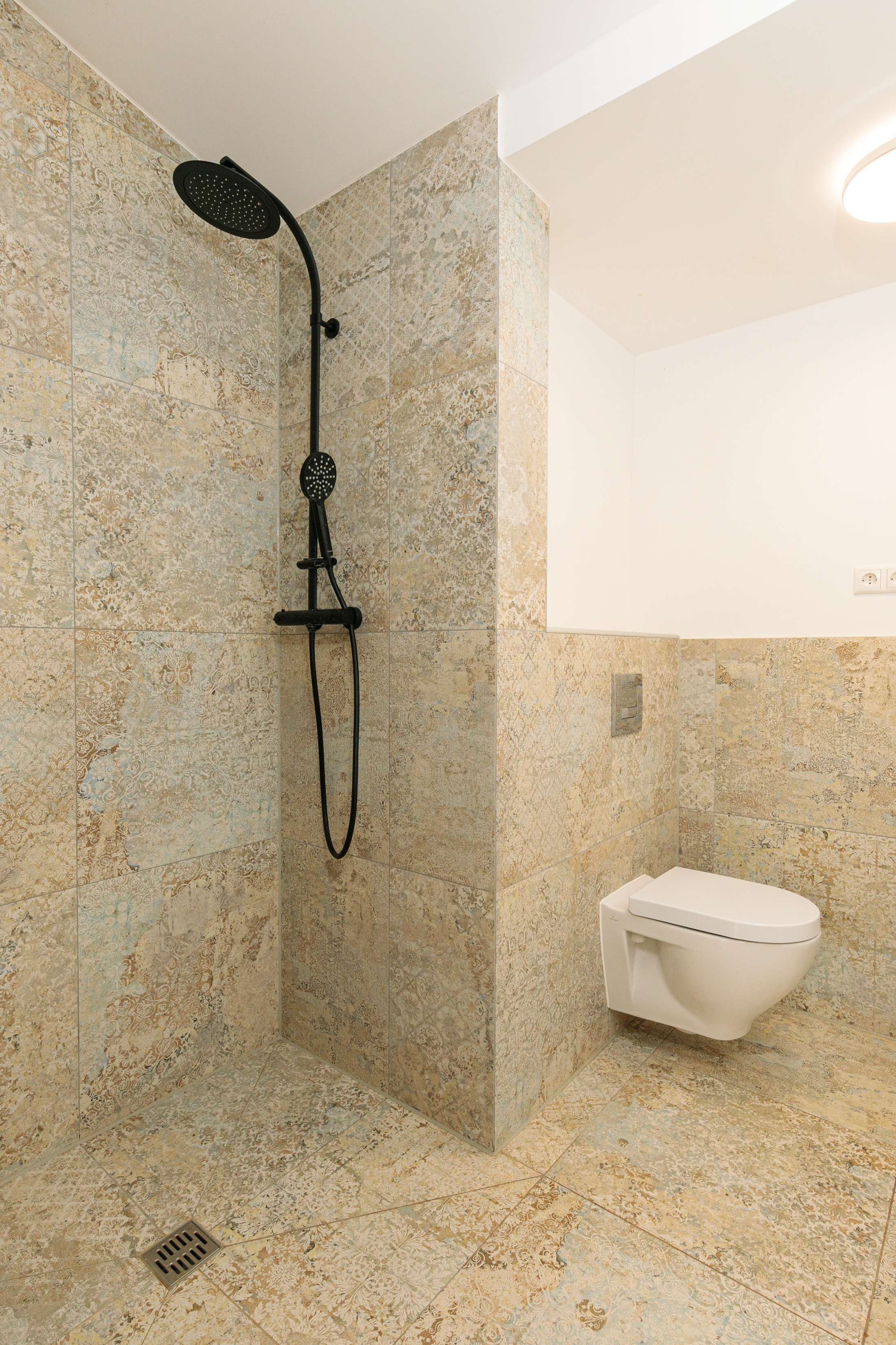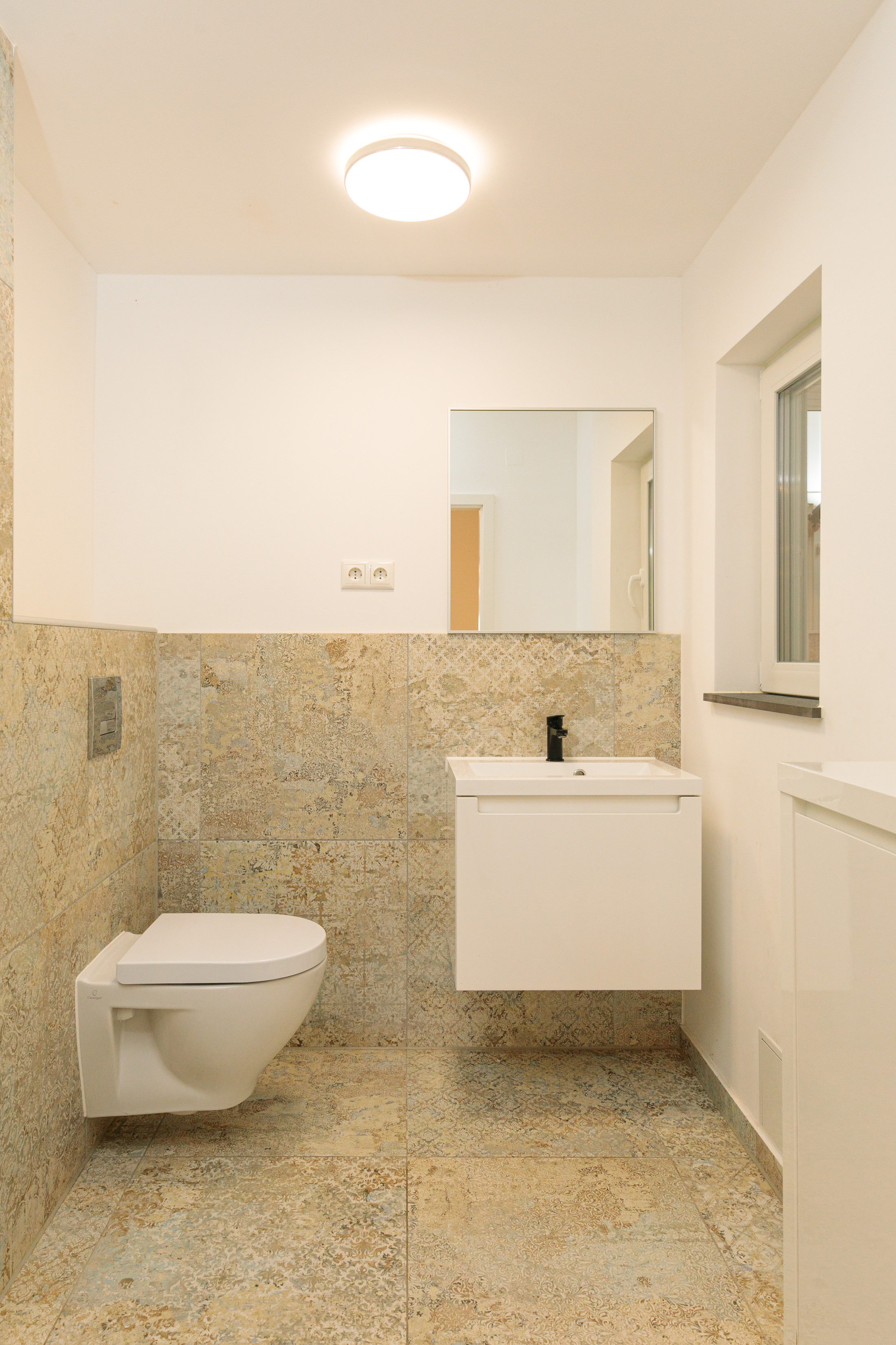 Das moderne Badezimmer ist mit einer Regendusche und einem wandhängenden WC ausgestattet, während ein Fenster für Belichtung und Belüftung sorgt. Zusätzlich gibt es ausreichend Raum für eine Badkommode.