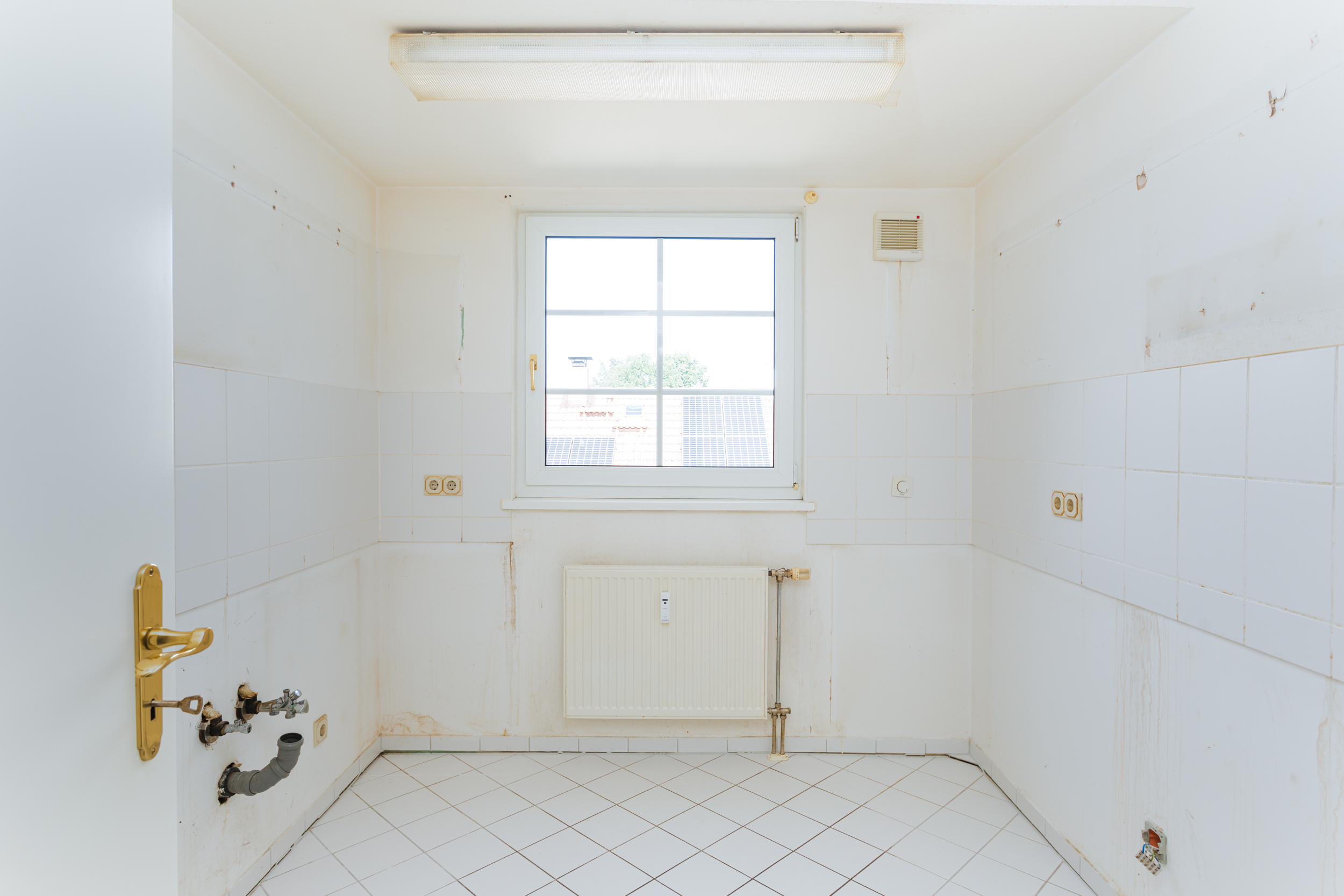 - Küche: Die Küche bietet ausreichend Platz für eine Einbauküche sowie eine kleine Frühstücksecke oder eine Tresenlösung. Ein umlaufender Fliesenspiegel ermöglicht eine flexible Gestaltung. Alle erforderlichen Anschlüsse sowie eine Abluftanlage sind vorhanden, um eine komfortable Küchennutzung zu gewährleisten.