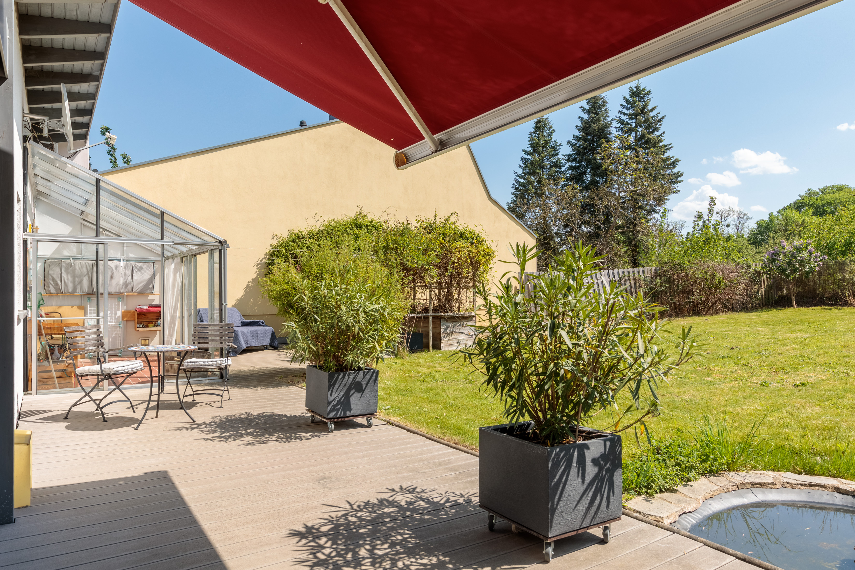 - Große Holzterrasse mit elektrischer Markise.
