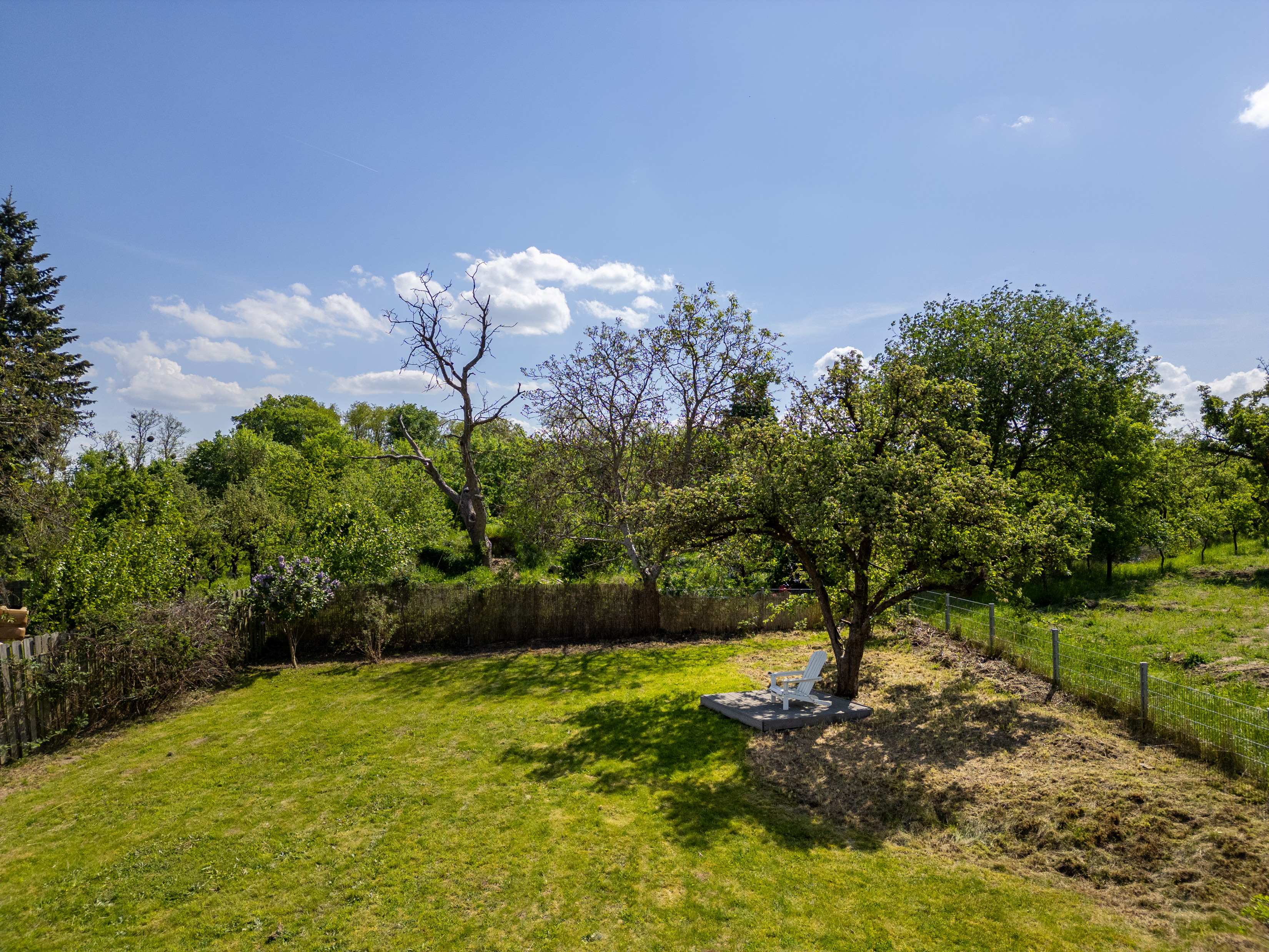 Der wunderschöne Garten ist pflegeleicht und verfügt über eine aktuell teilweise stillgelegte Beregnungsanlage, die mit Brauchwasser vom Plessower See gespeist wird. Eine bepflanzte Pergola mit Hochbeet gehört ebenfalls dazu und ebenso ein kleiner Teich für Insekten, die für das Obstbaumgebiet wichtig sind.