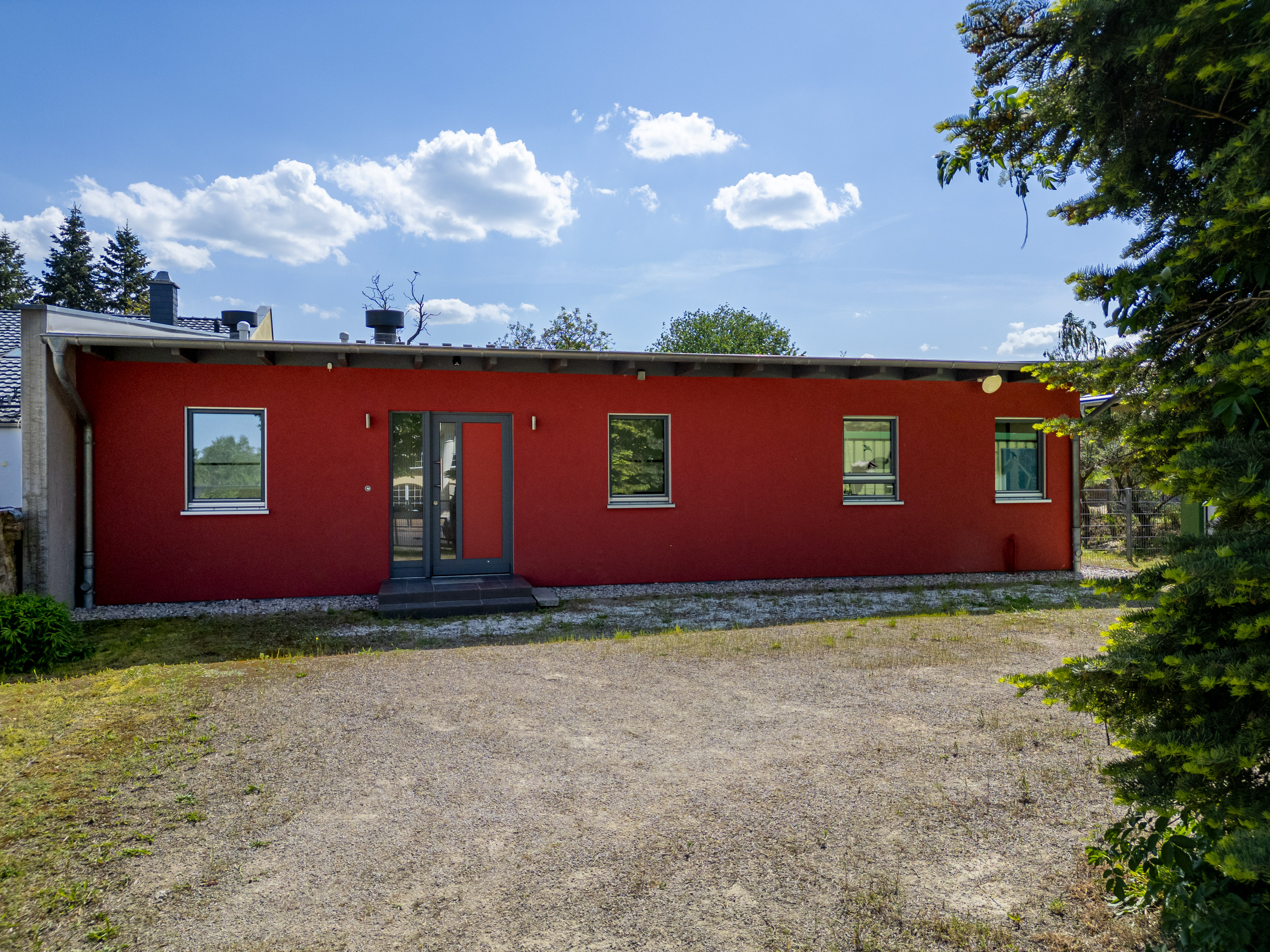 Der moderne Bungalow wurde 2010 als Fertighaus (Marke: Das Meisterhaus) in Holzständerbauweise errichtet. In ihm vereint sich großzügiges Wohnen auf einer ebenerdigen Wohnfläche von 115,75 m2 und einer Deckenhöhe bis 4,15 Meter. Mit seinen drei flexiblen Wohnbereichen und zwei Bädern sowie dem nach Süden ausgerichteten Garten ist er ideal geeignet für Paare, die ihre Enkelkinder oder Gäste temporär bei sich willkommen heißen möchten. Viel Tageslicht, bodentiefe und deckenhohe Fenster und insgesamt vier Türen in den Garten unterstreichen eine gewisse Leichtigkeit.