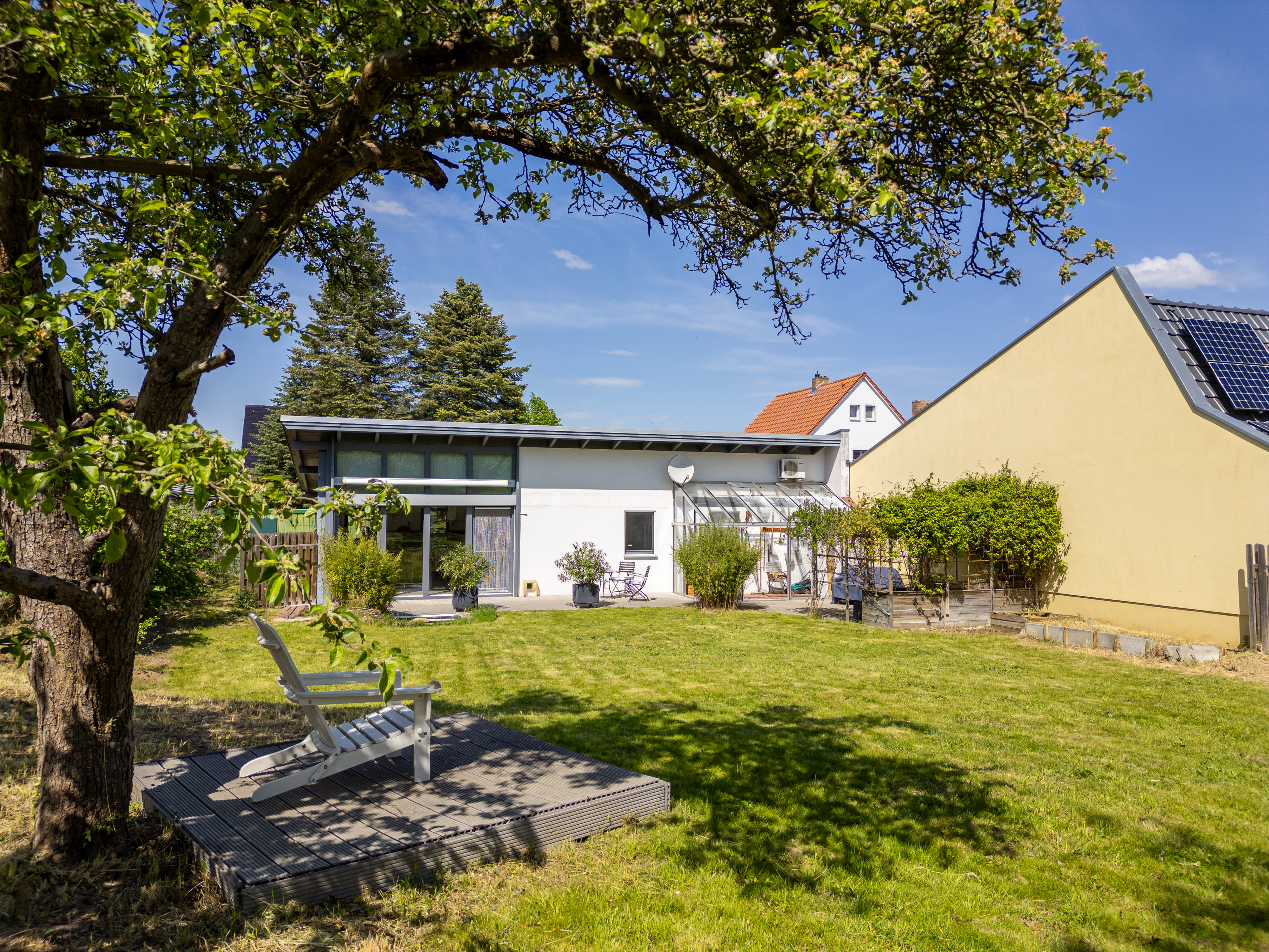 Der Flur öffnet sich zum dritten und größten Raum, dem Wohn-Essbereich des Hauses mit etwas über 41 m2. Hier bietet eine offene Einbauküche Raum für genussreiche Kochevents mit Freunden oder der Familie. Die gesamte Fläche besticht durch ihre enorme Raumhöhe bis 4,15 Metern, großen Fensterflächen und einem tollen Blick in den Garten und die angrenzenden Obstwiesen. Vor dem Wohnbereich erstreckt sich eine fast 24 m2 große Holzterrasse mit großer Markise. Neben dem Ausgang vom Schlafbereich ist ein Gewächshaus mit elektrischer Fußbodenheizung platziert, welches auch als Wintergarten-Rückzugsort dienen kann.
