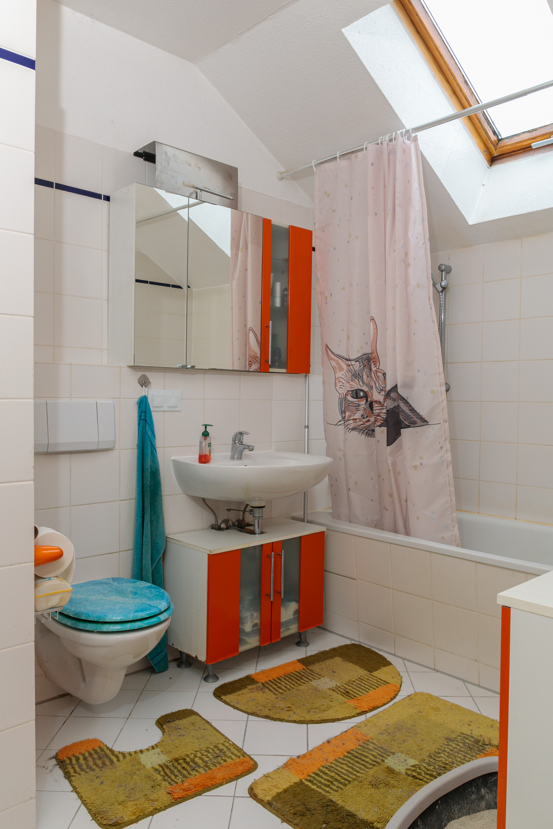 Das helle Tageslichtbad linkerhand ist mit einem Fenster ausgestattet und bietet eine Badewanne mit Duschmöglichkeit. Eine praktische Nische mit weiterem Fenster und Waschmaschinenanschluss rundet den Komfort ab.