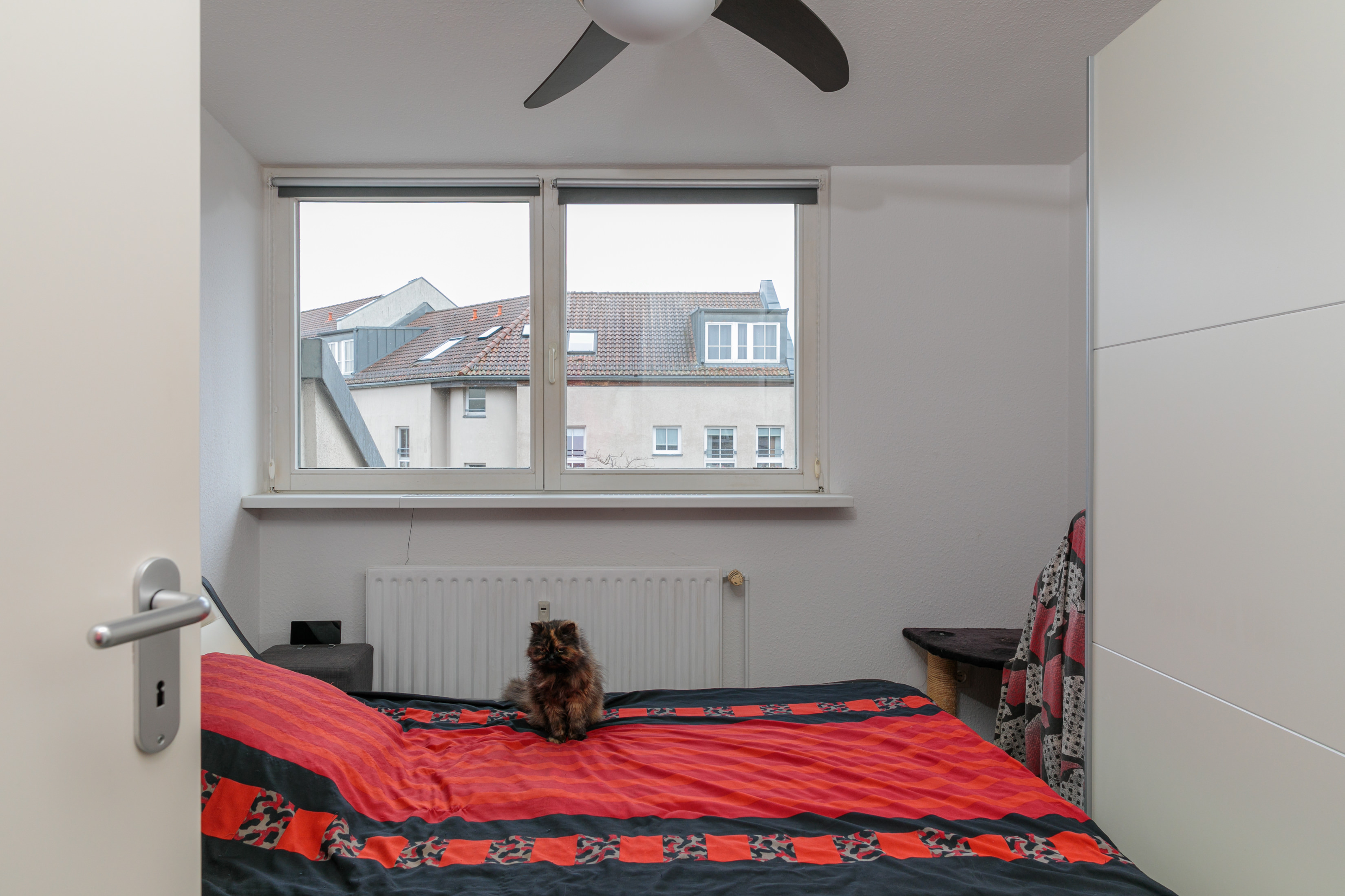 Das angrenzende Schlafzimmer ist kompakt und dennoch funktional gestaltet. Es bietet ausreichend Platz für ein großes Bett und einen geräumigen Kleiderschrank – der perfekte Rückzugsort für erholsame Nächte.