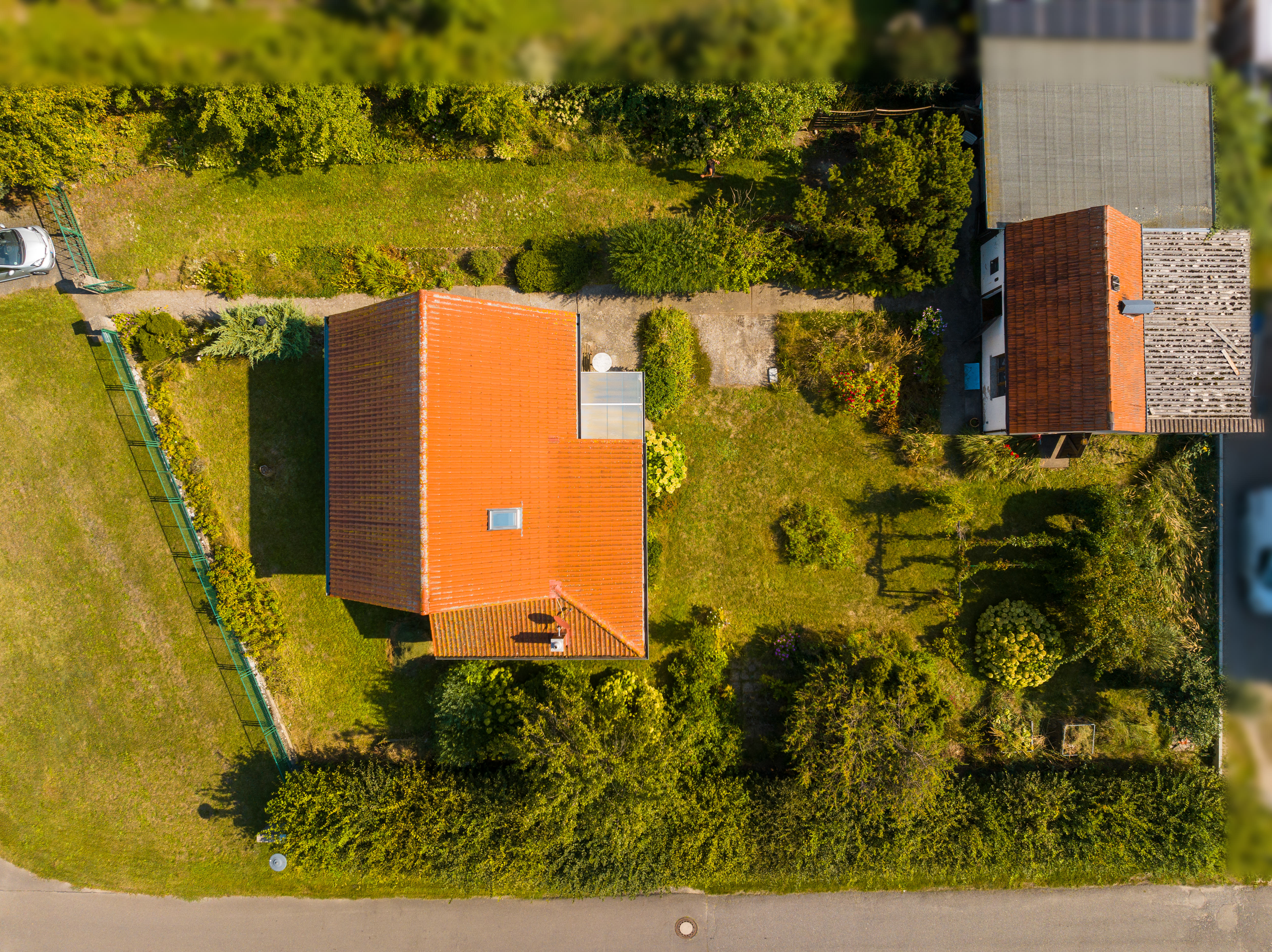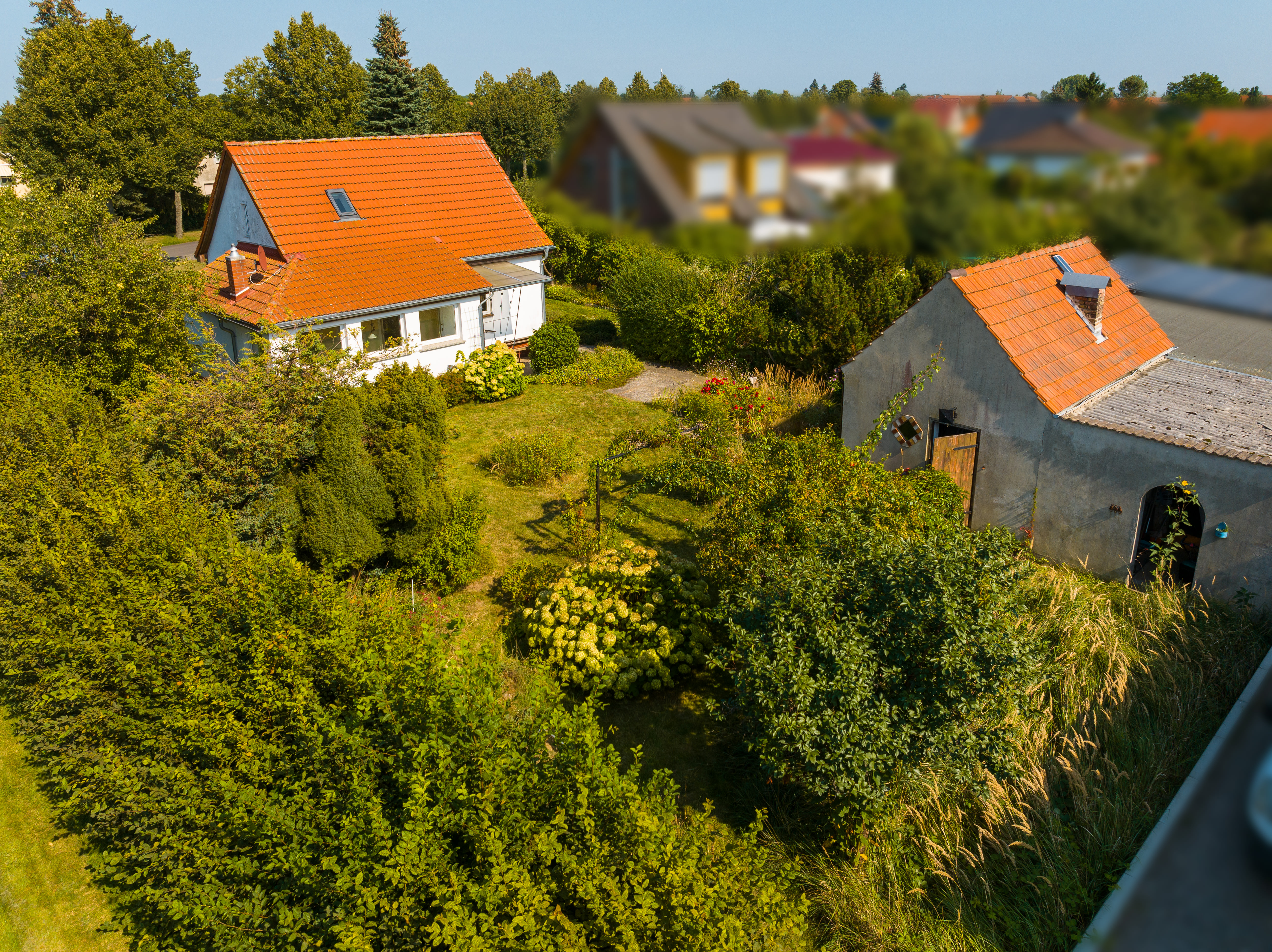 Im hinteren Teil des Grundstücks befindet sich ein großzügiges Nebengebäude. Neben Abstellfläche und ehemaligen Stallungen wurde die ehemalige Garage zu einem lichtdurchfluteten Gästehaus umgebaut.