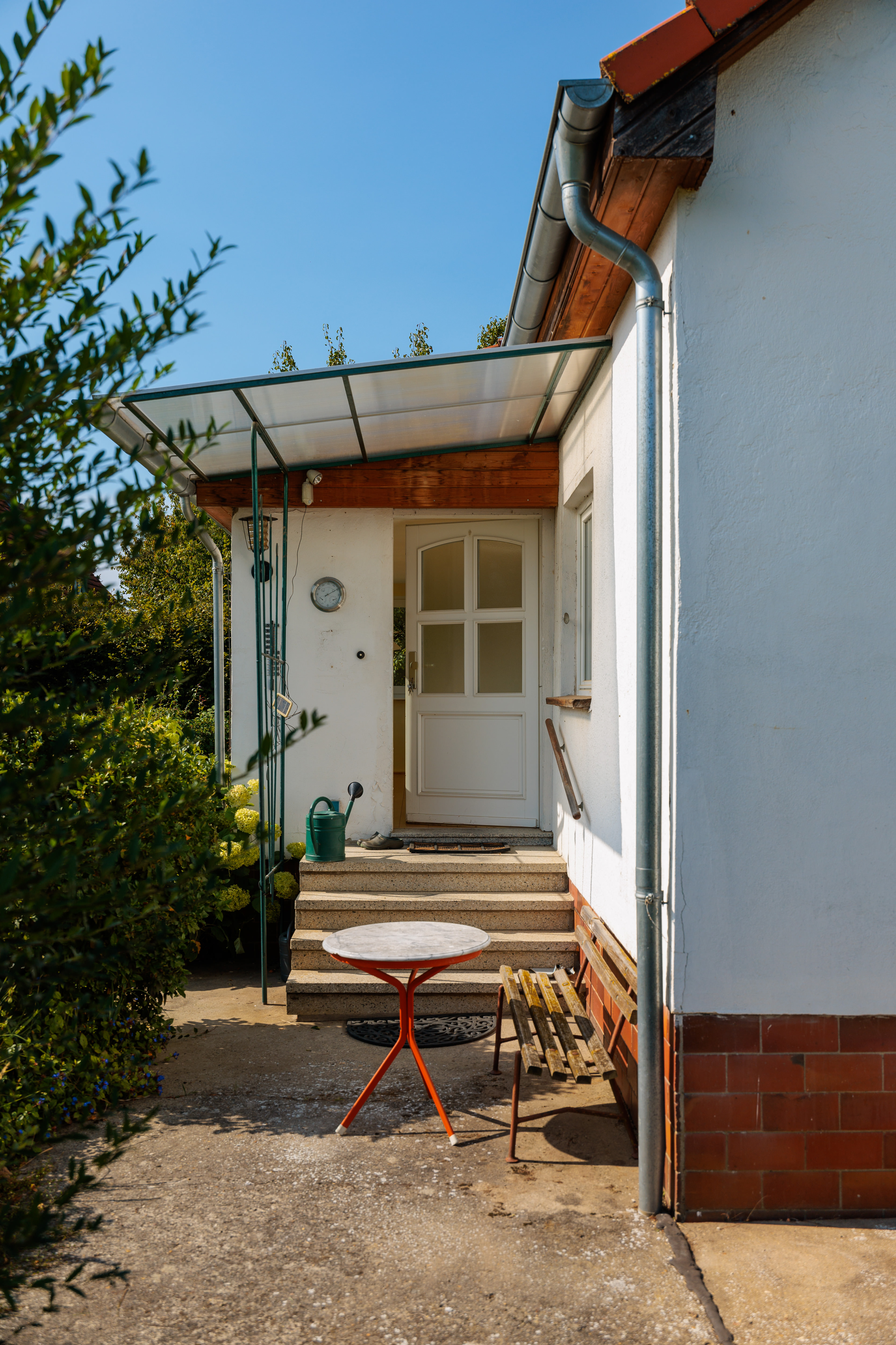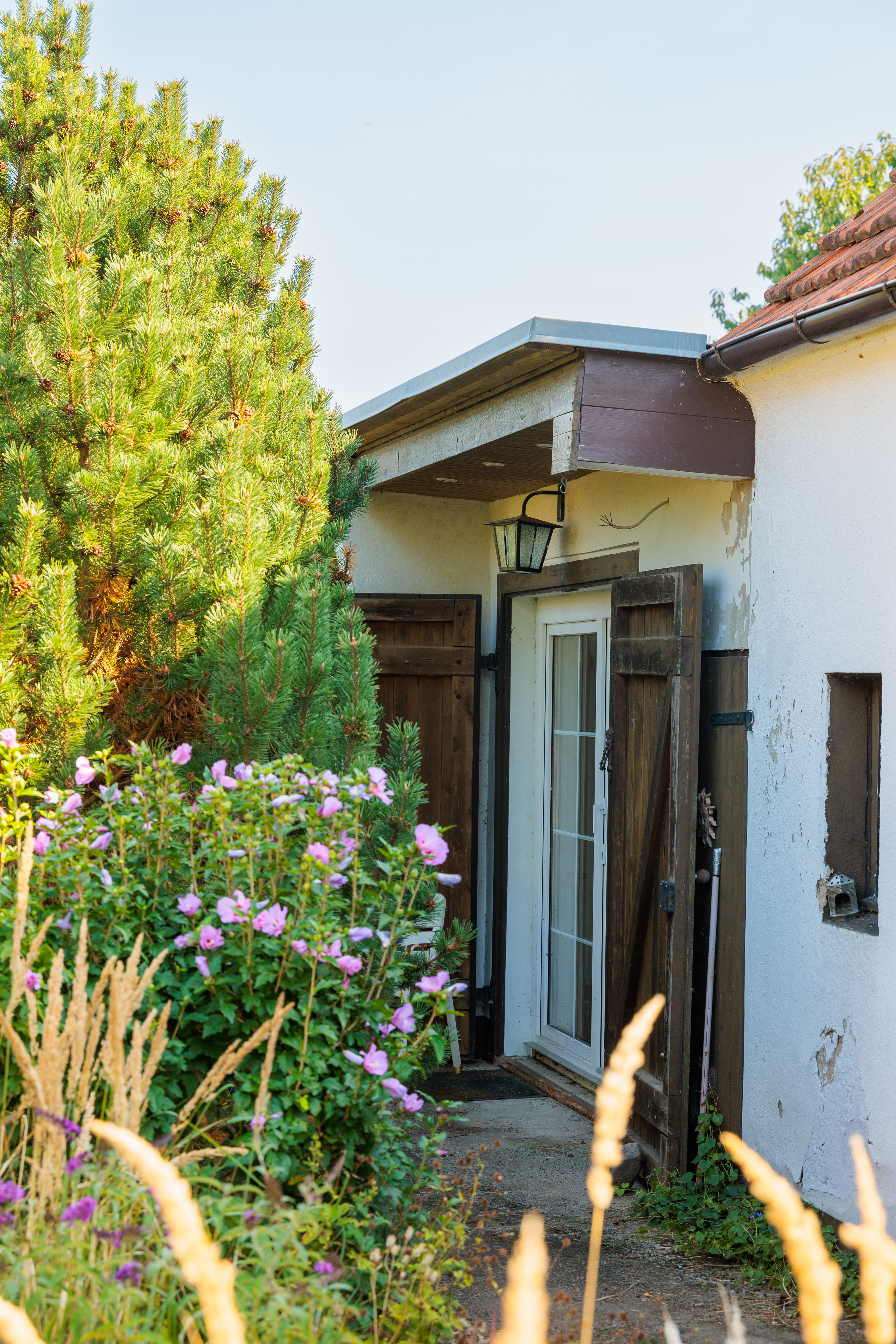 Der Hauseingang befindet sich hinter dem Haus und führt über eine kleine, betonierte Fläche mit einer Gartenbank, die Besucher zum Verweilen einlädt. Von hier aus blickt man direkt in den farbenfroh blühenden und wildromantischen Garten. Betritt man das Haus, gelangt man zuerst in eine geschlossene Veranda mit großen Fensterflächen, die einen wunderbaren Blick in den Garten bieten. Diese Veranda eignet sich ideal für eine Sitzecke oder einen kleinen Essbereich.