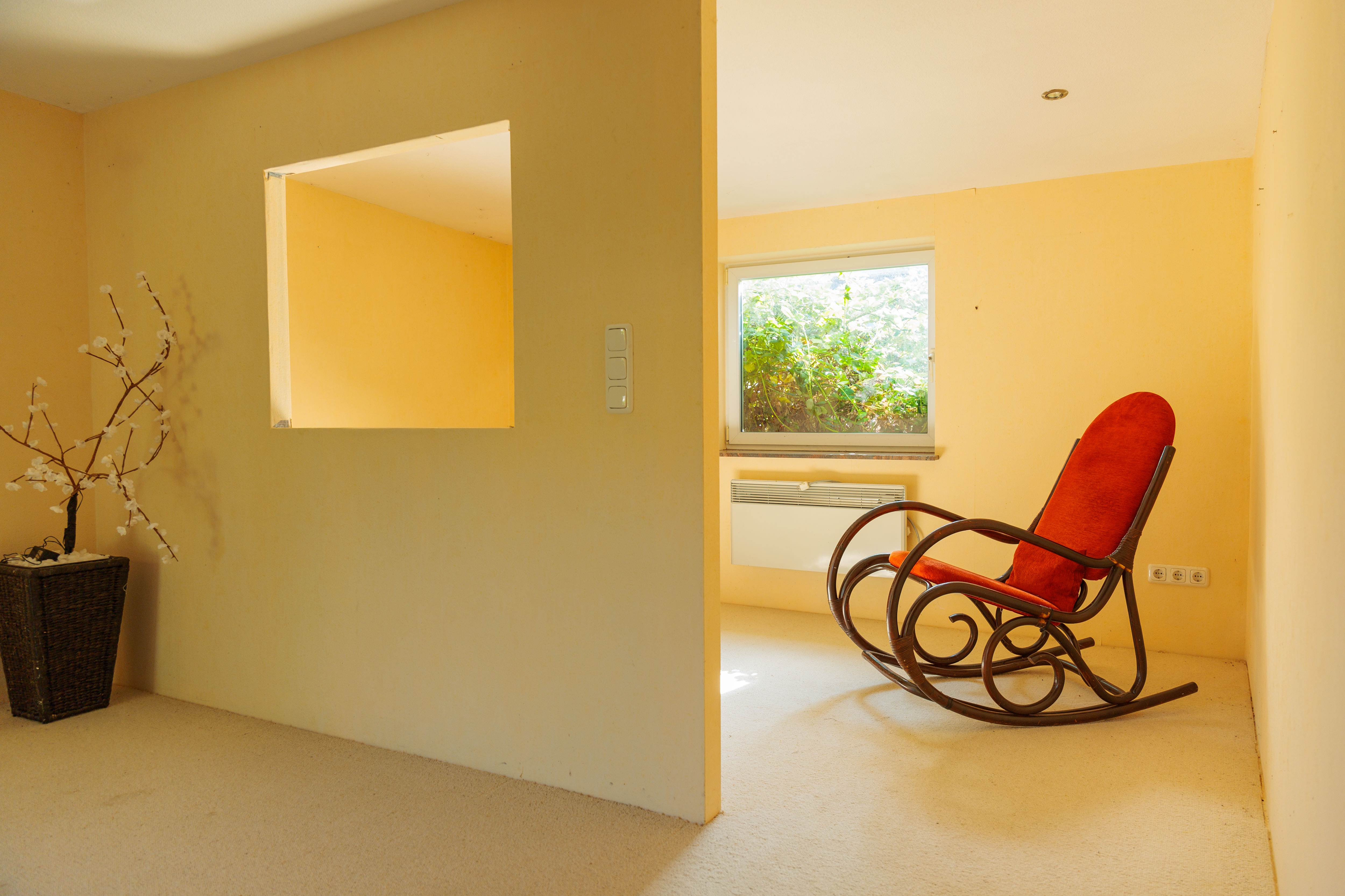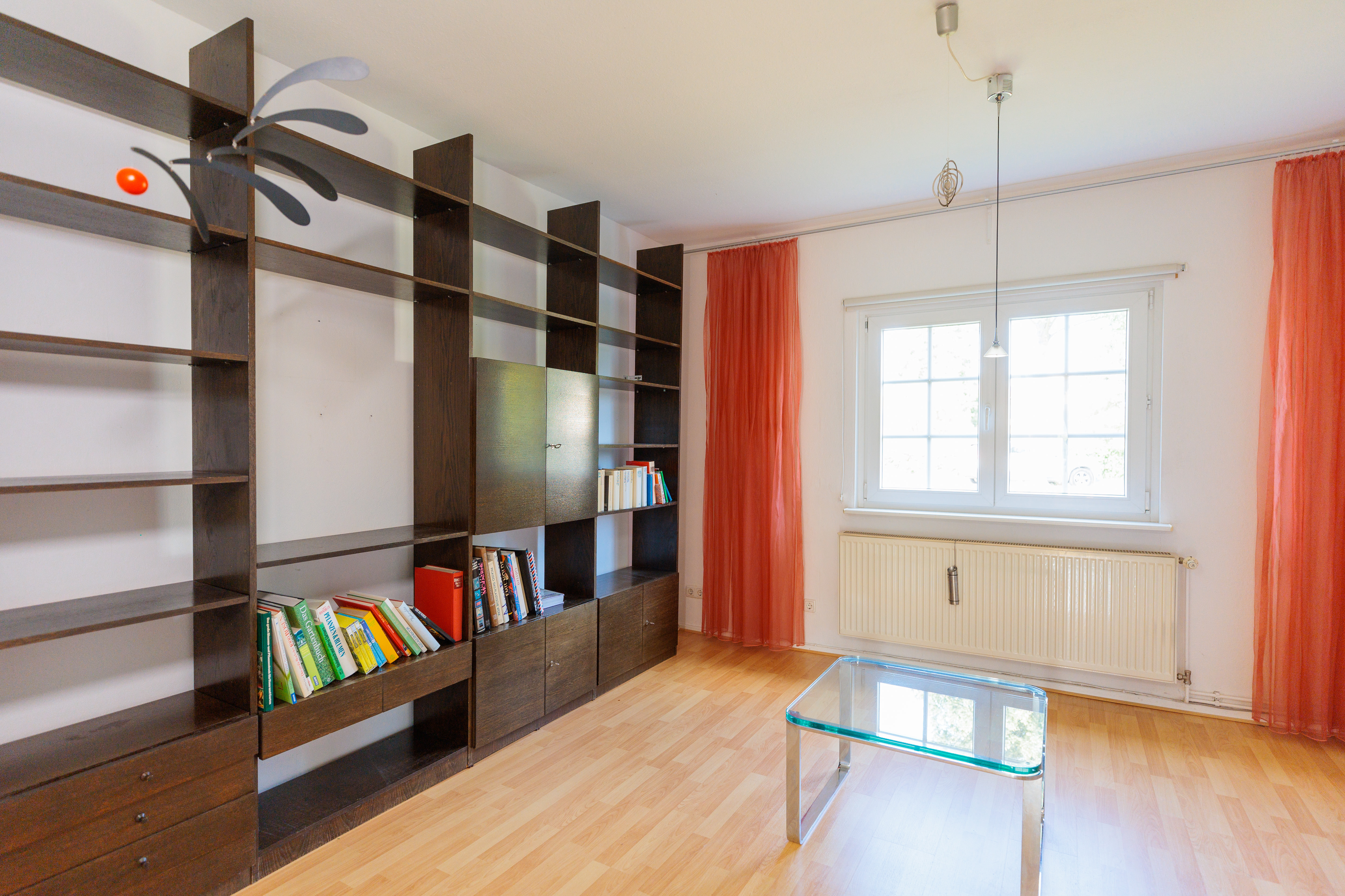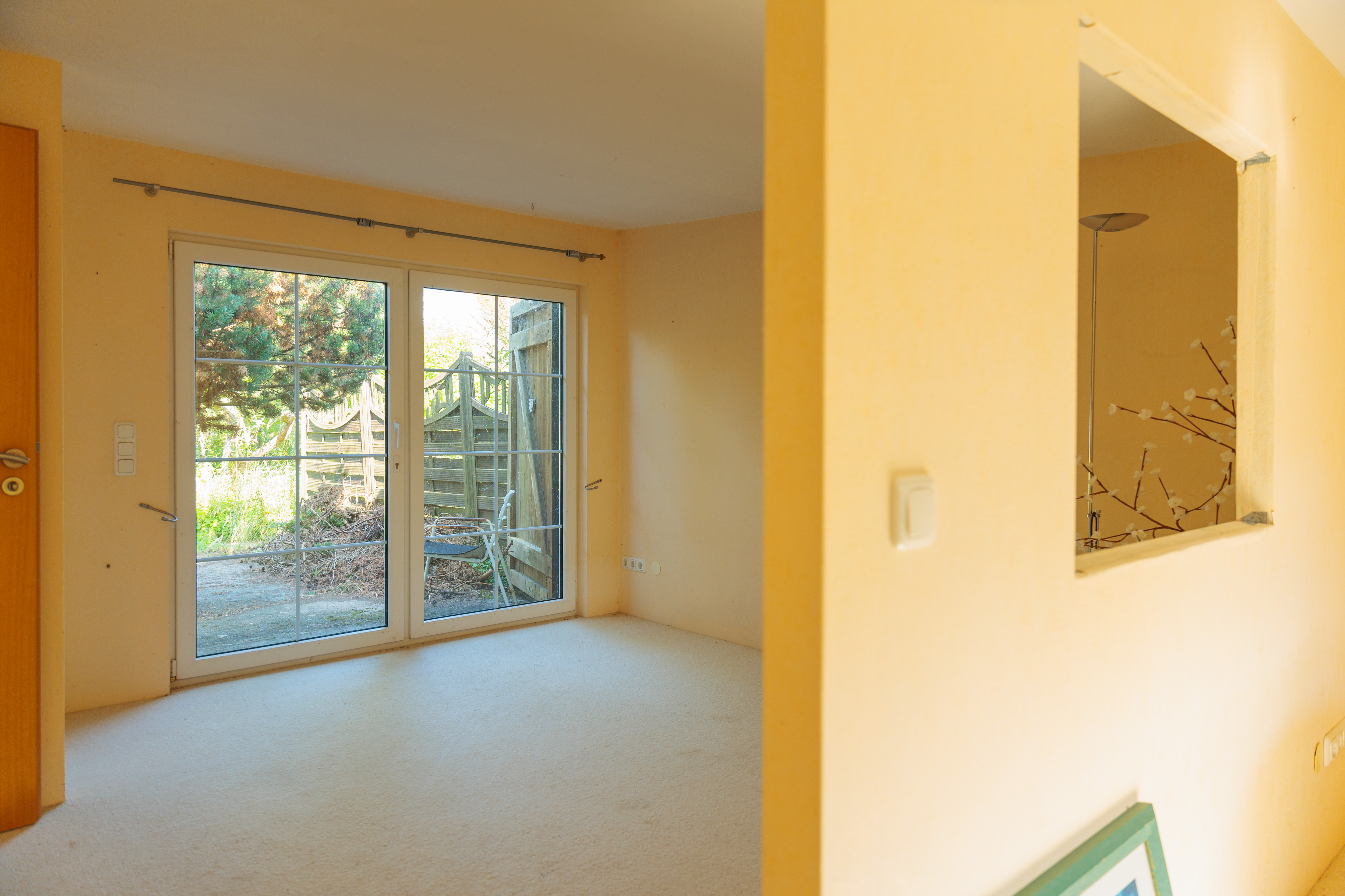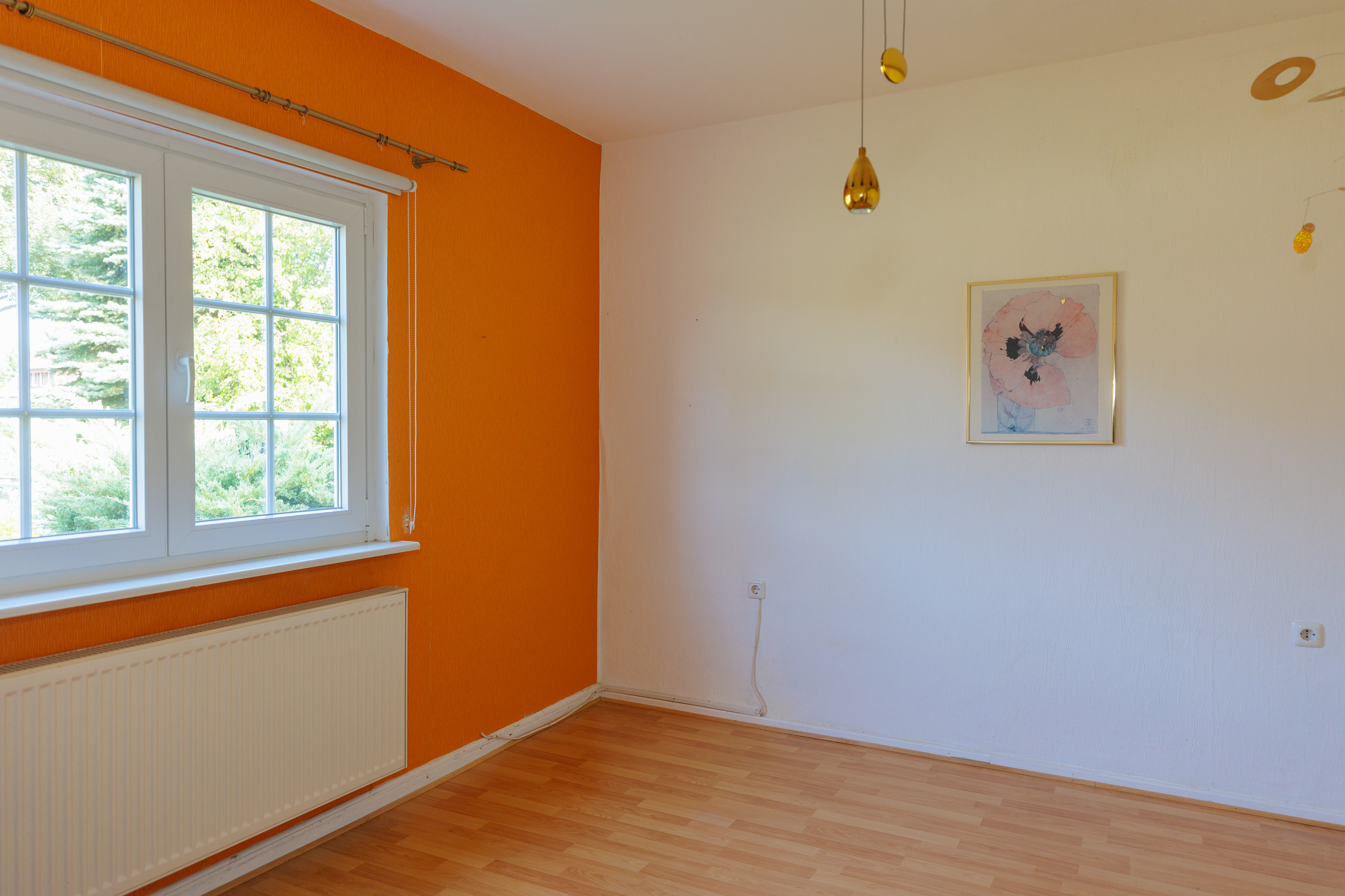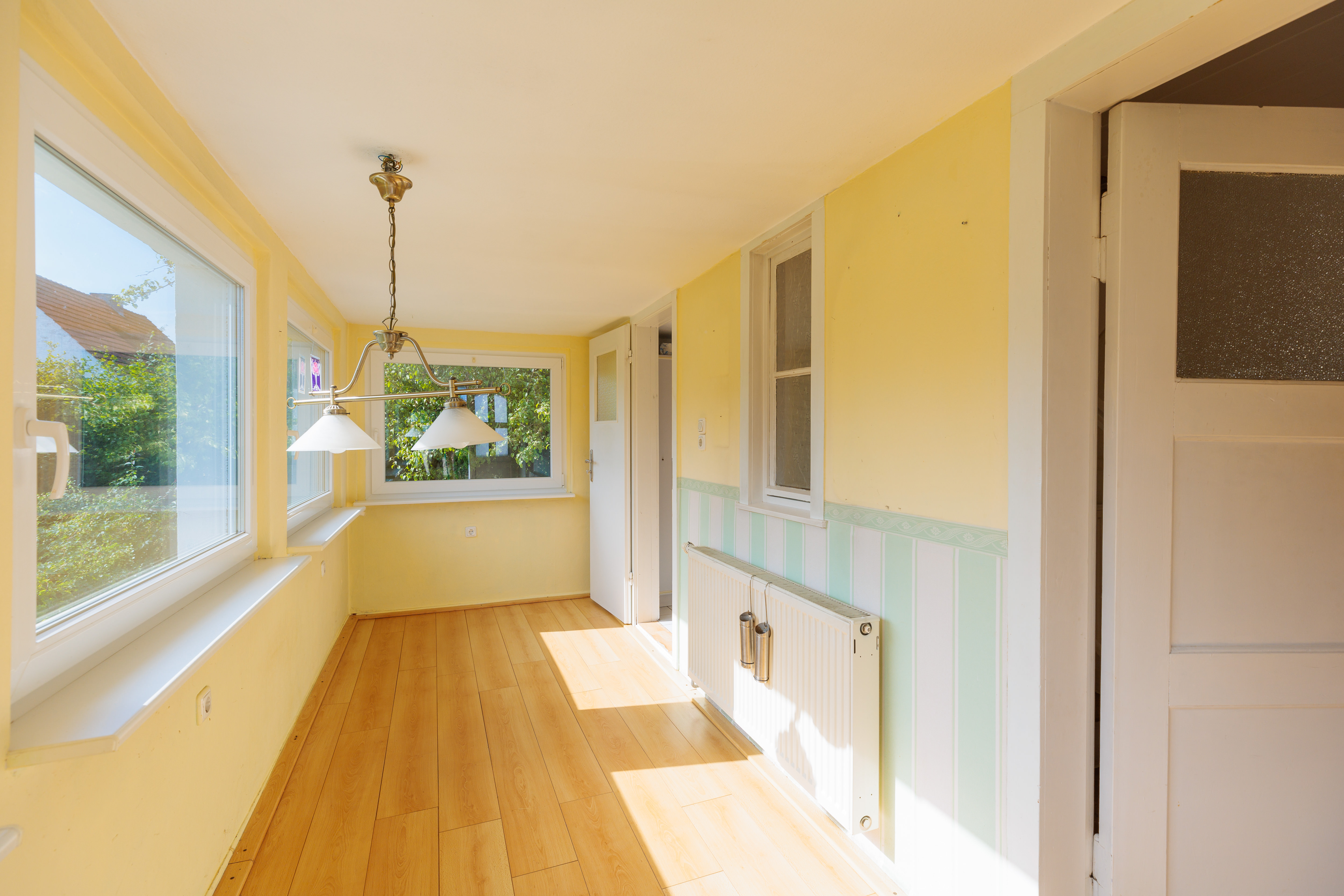 Von der Veranda aus führt der Weg in einen Flur, der ausreichend Platz für eine Garderobe und eine Kommode bietet. Vis-à-vis vom Eingang liegt das helle Wohnzimmer, das einen Blick in den Vorgarten sowie in die ruhige Anliegerstraße bietet. Diese ist nur von Anliegern befahren und verleiht der Umgebung eine grüne und friedliche Atmosphäre. Direkt angrenzend befindet sich ein weiteres Zimmer, das als Schlafzimmer oder für andere Zwecke genutzt werden kann. Beide Räume bieten herrliche Ausblicke ins Grüne und ausreichend Platz für individuelle Einrichtungsideen.
