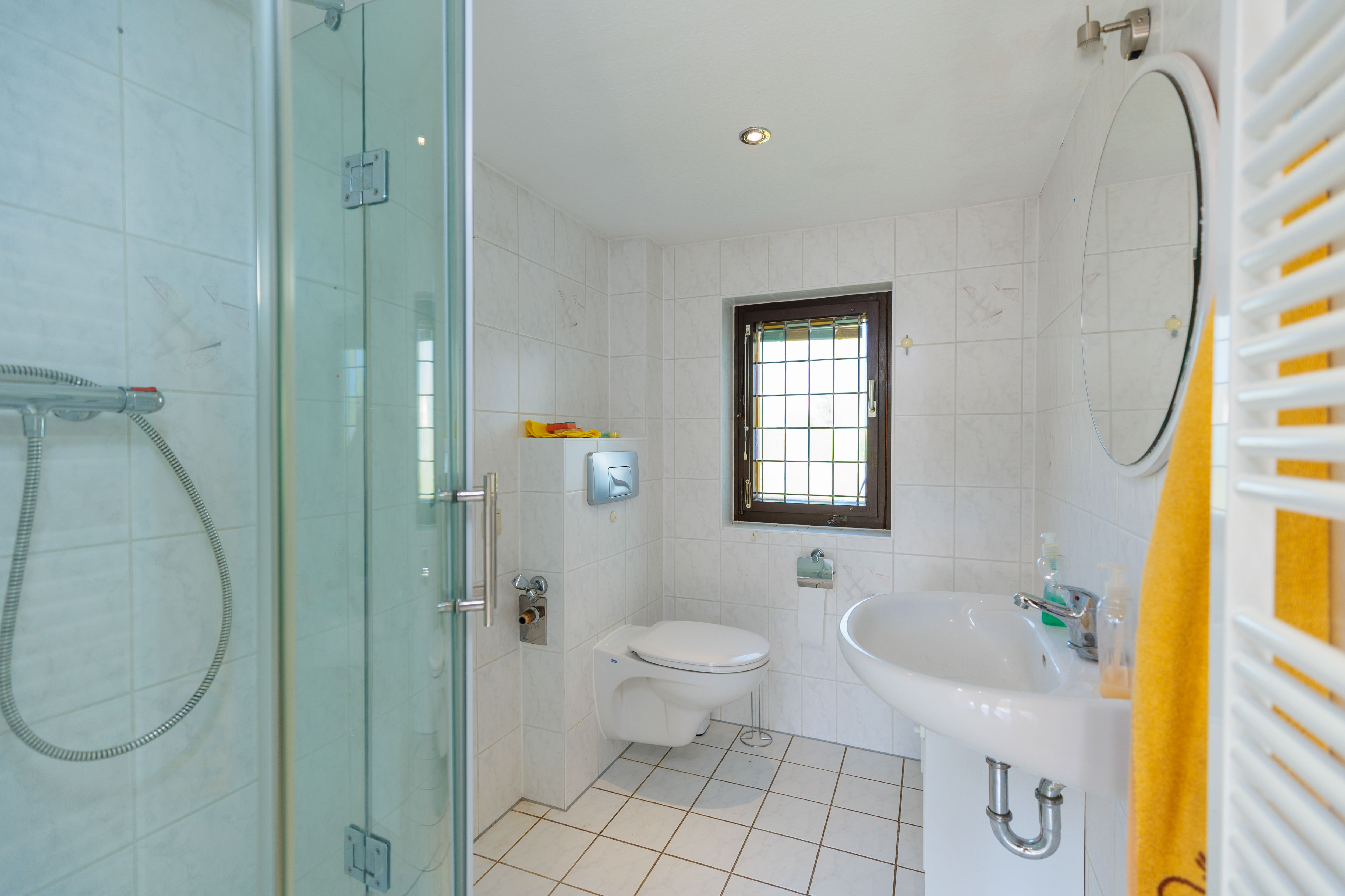 Das Badezimmer, das in den 1990er Jahren saniert wurde, verfügt über eine Runddusche mit Echtglasabtrennung, ein Fenster mit Buntglas zur Belüftung, Deckenspots und einen Handtuchheizkörper. Es ist funktional eingerichtet und beherbergt eine Nische, in der die Gasbrennwerttherme untergebracht ist. Die Therme kann aufgrund ihrer modernen Technologie weiter betrieben werden, ohne dass eine Austauschpflicht besteht.